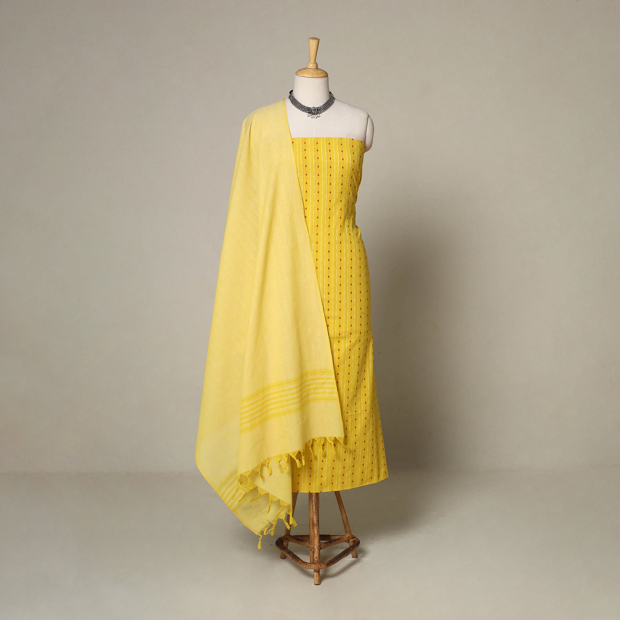 This yellow 3pc cotton jacquard dress material includes a beautifully woven jacquard kurta, a plain bottom, and a matching dupatta. The fabric feels comfortable for daily wear and looks graceful for casual outings, family get-togethers, or light festive occasions. Its subtle texture and coordinated pieces make it easy to stitch and style.
