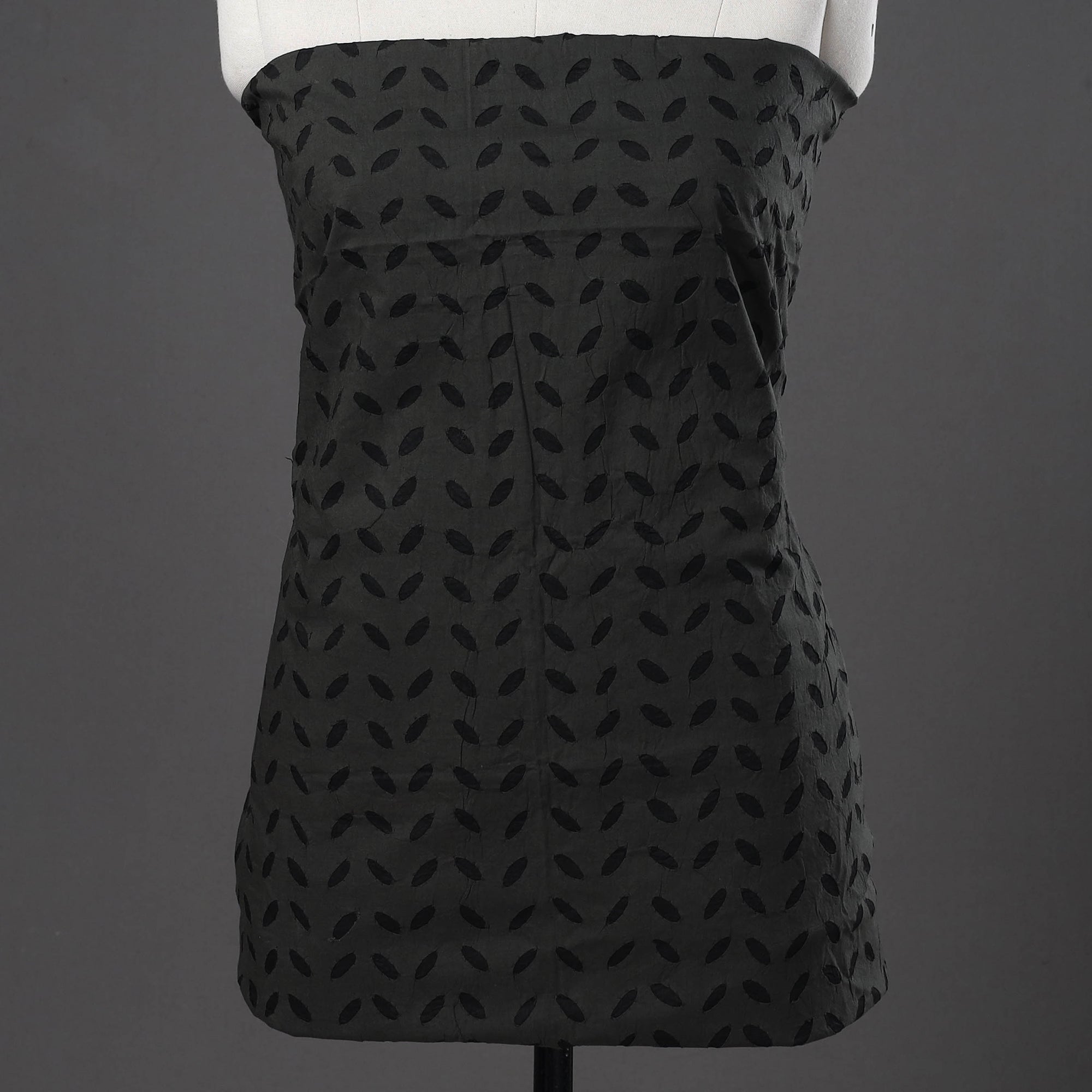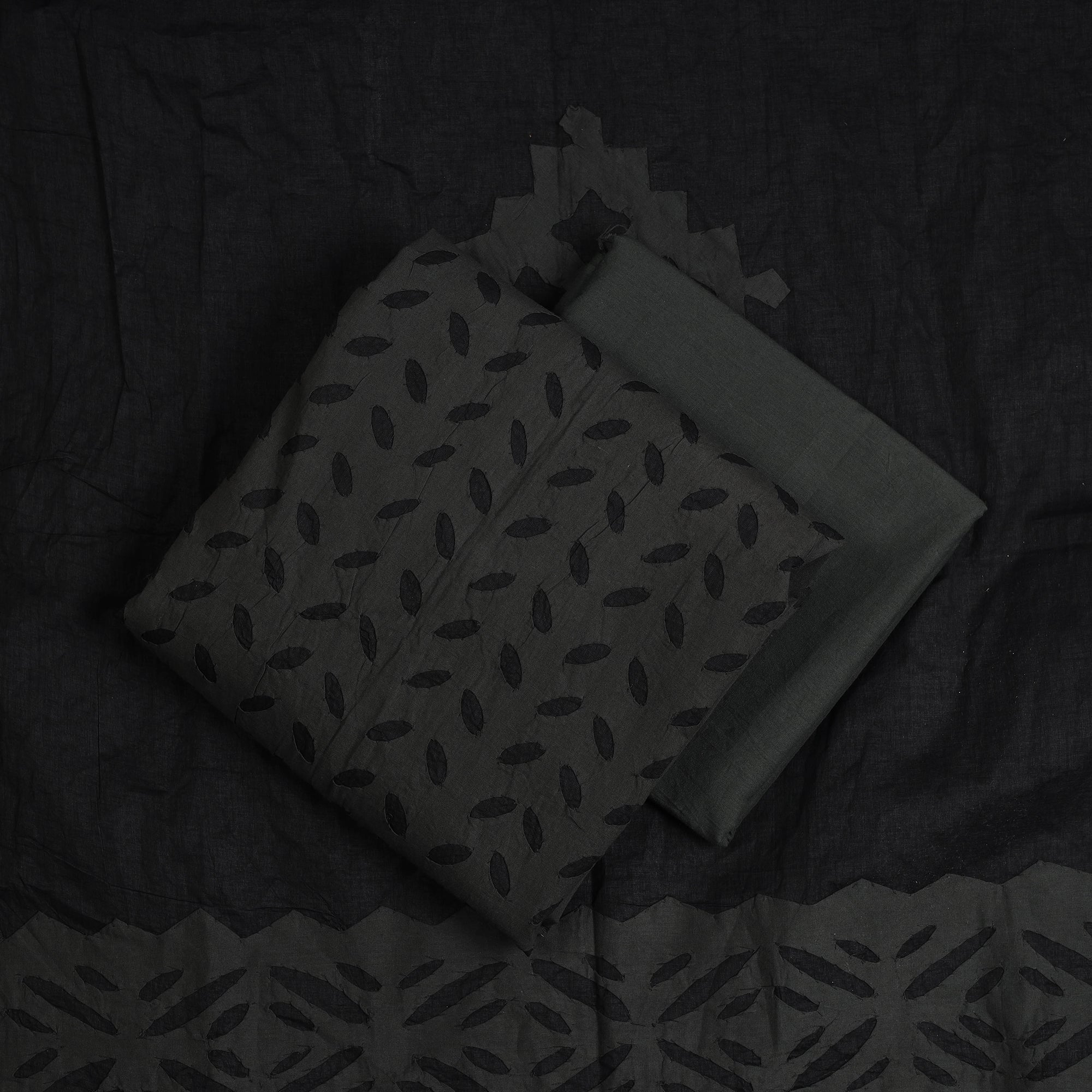 Black 3pc cut work cotton barmer applique dress material from barmer, rajasthan. Its unique style of applique work does magic in light and shade with beautiful stories and patterns. The set includes a plain matching bottom and a dupatta adorned with delicate applique designs.