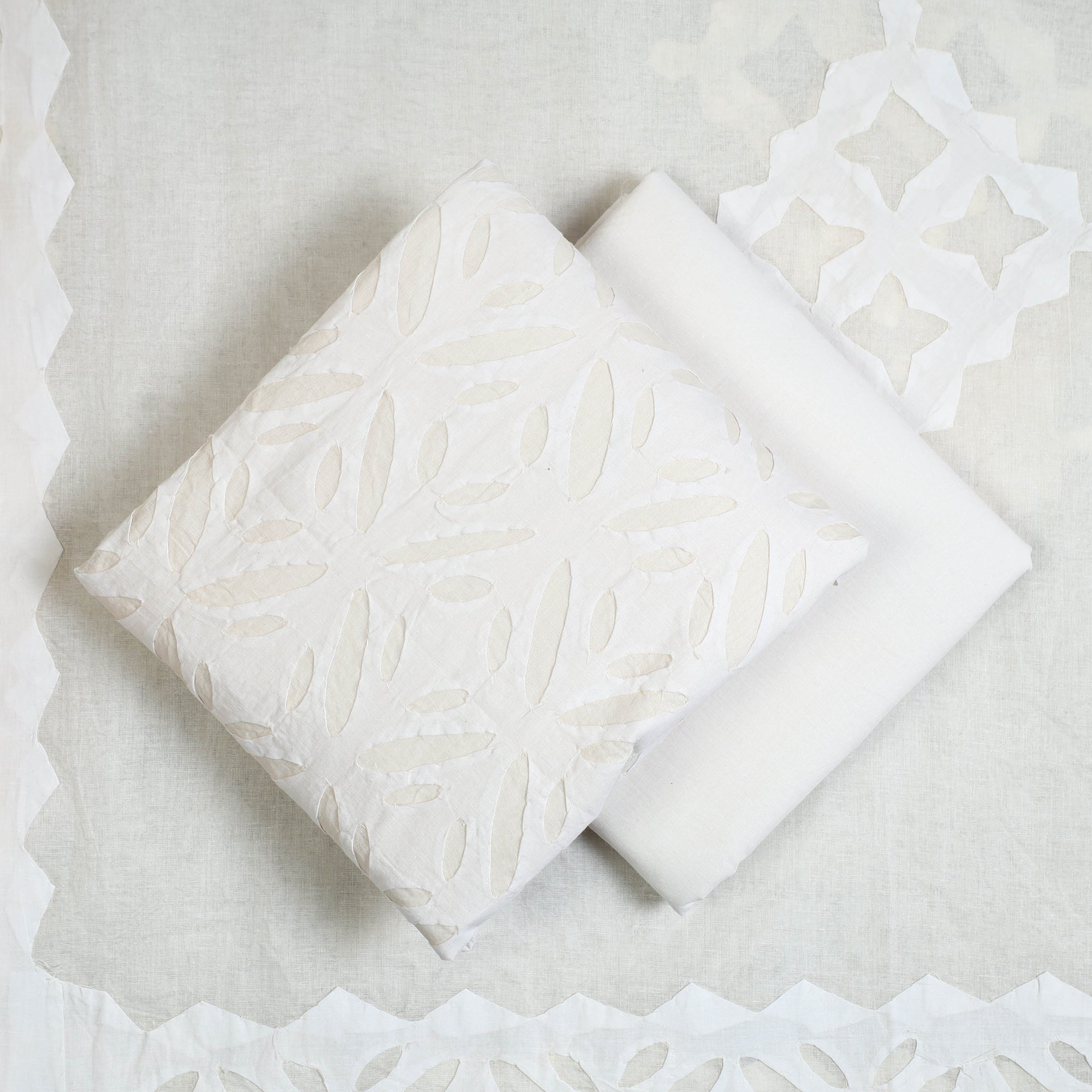 White 3pc cut work cotton barmer applique dress material from barmer, rajasthan. Its unique style of applique work does magic in light and shade with beautiful stories and patterns. The set includes a plain matching bottom and a dupatta adorned with delicate applique designs.