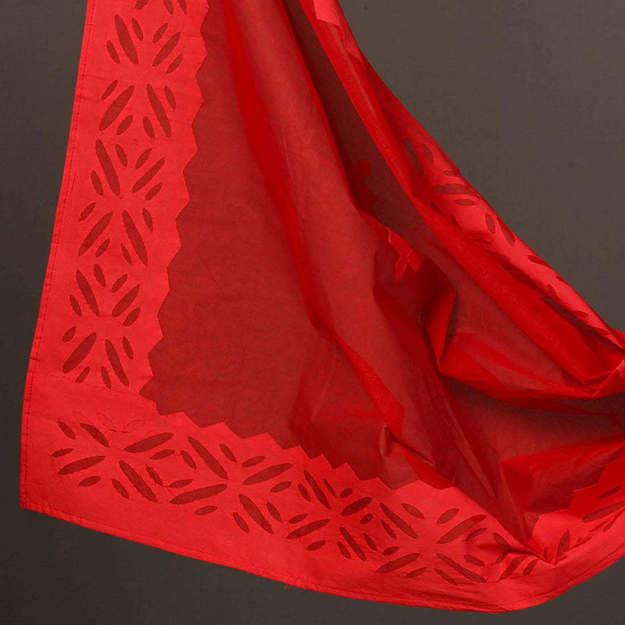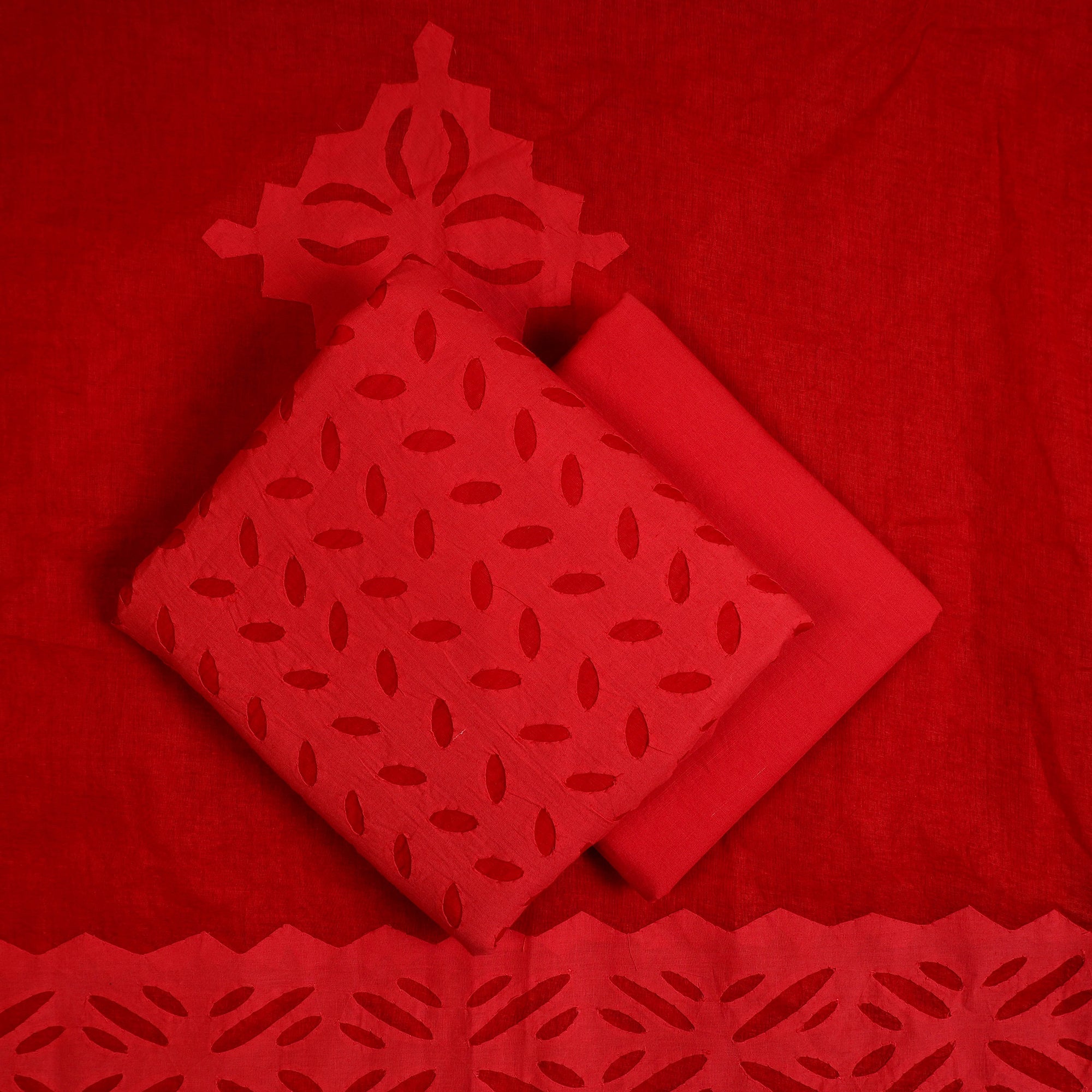 Red 3pc cut work cotton barmer applique dress material from barmer, rajasthan. Its unique style of applique work does magic in light and shade with beautiful stories and patterns. The set includes a plain matching bottom and a dupatta adorned with delicate applique designs.