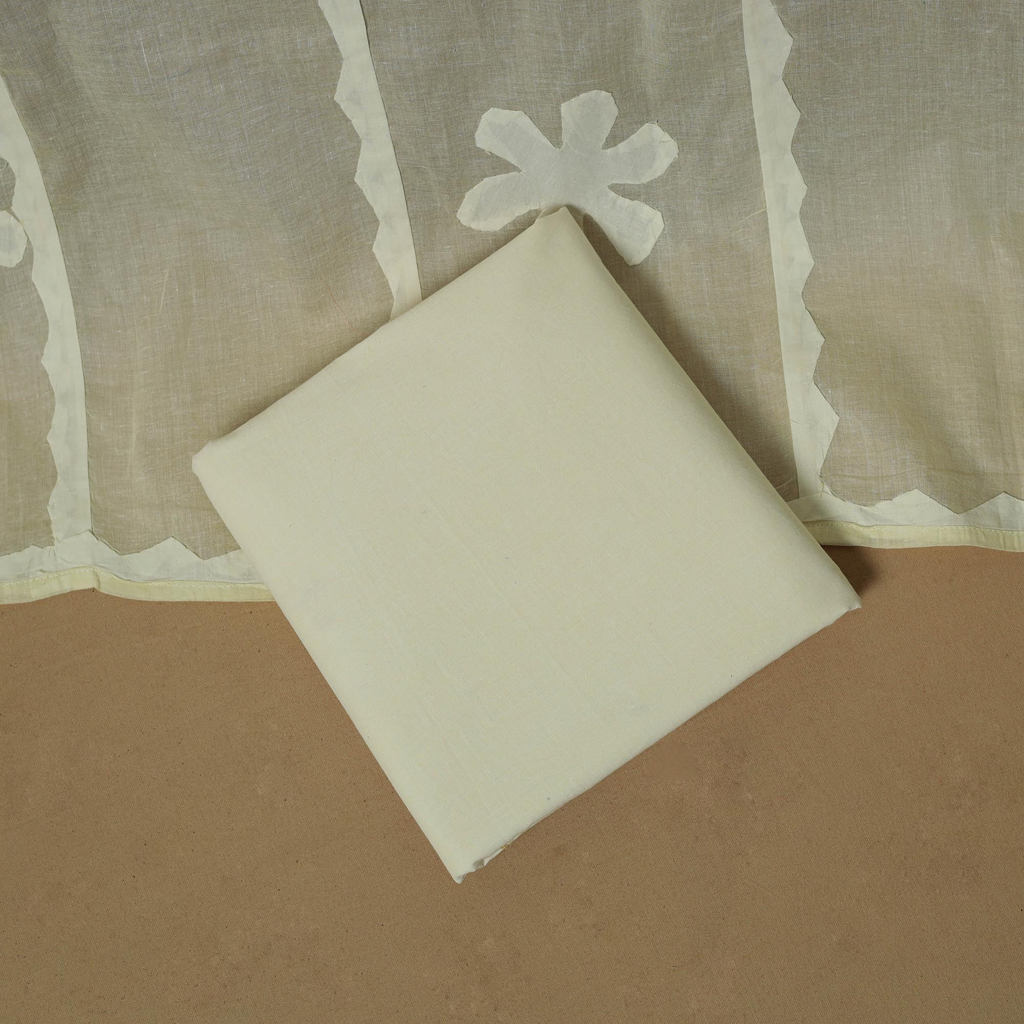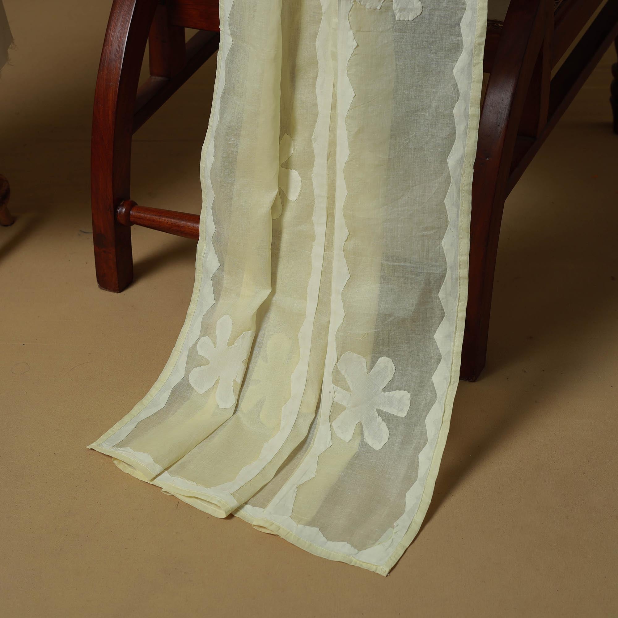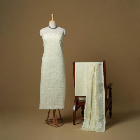 Yellow 3pc cut work cotton barmer applique dress material from barmer, rajasthan. Its unique style of applique work does magic in light and shade with beautiful stories and patterns. The set includes a plain matching bottom and a dupatta adorned with delicate applique designs.