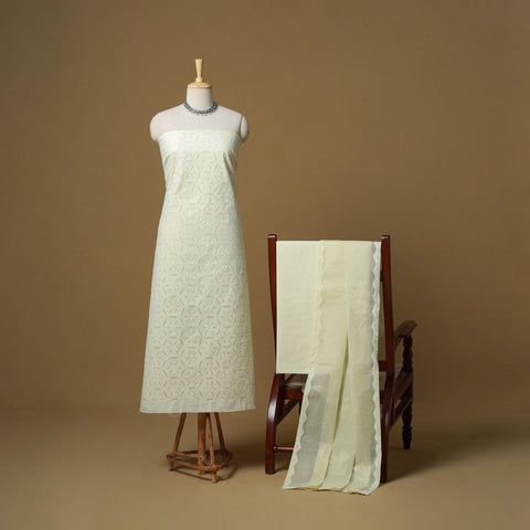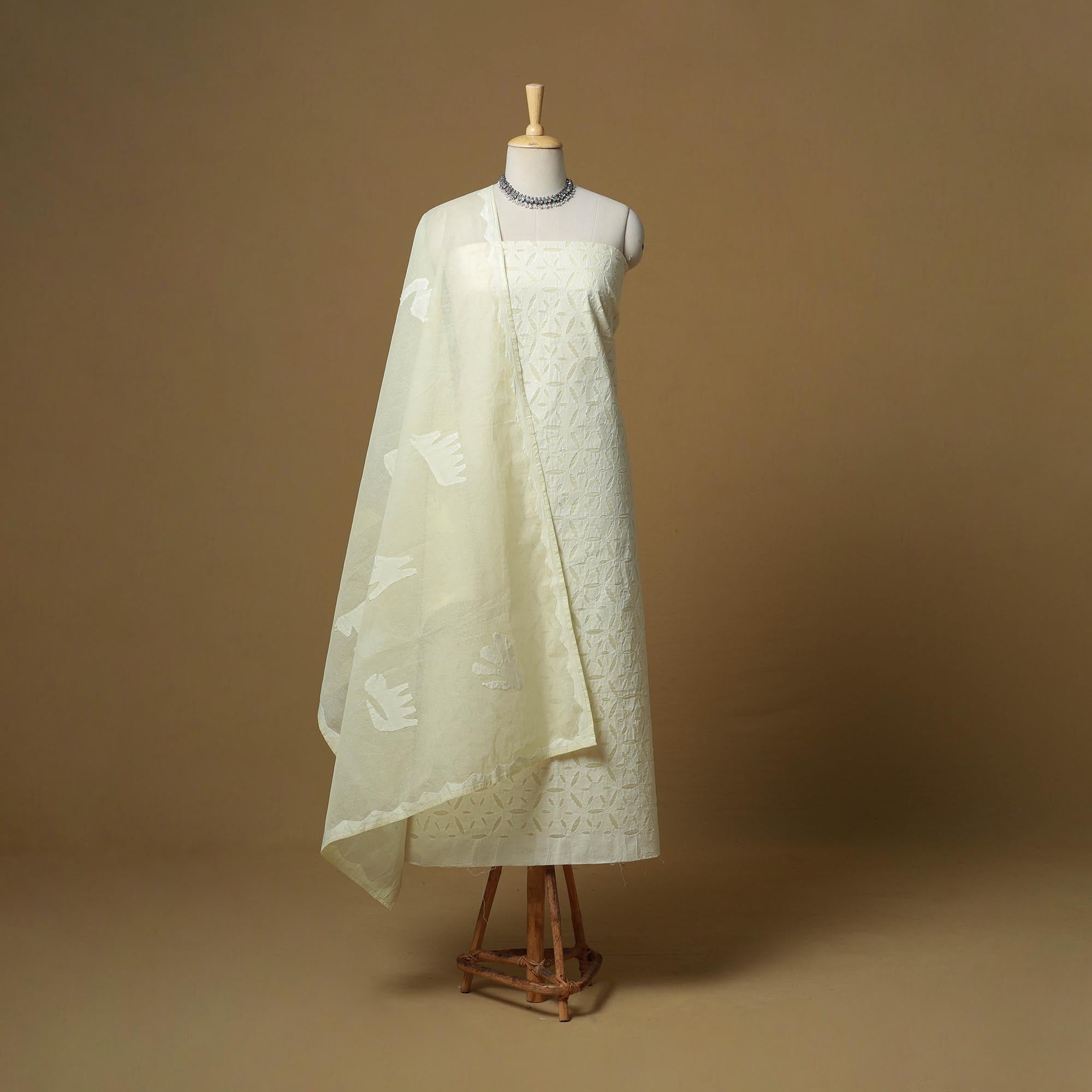 Yellow 3pc cut work cotton barmer applique dress material from barmer, rajasthan. Its unique style of applique work does magic in light and shade with beautiful stories and patterns. The set includes a plain matching bottom and a dupatta adorned with delicate applique designs.