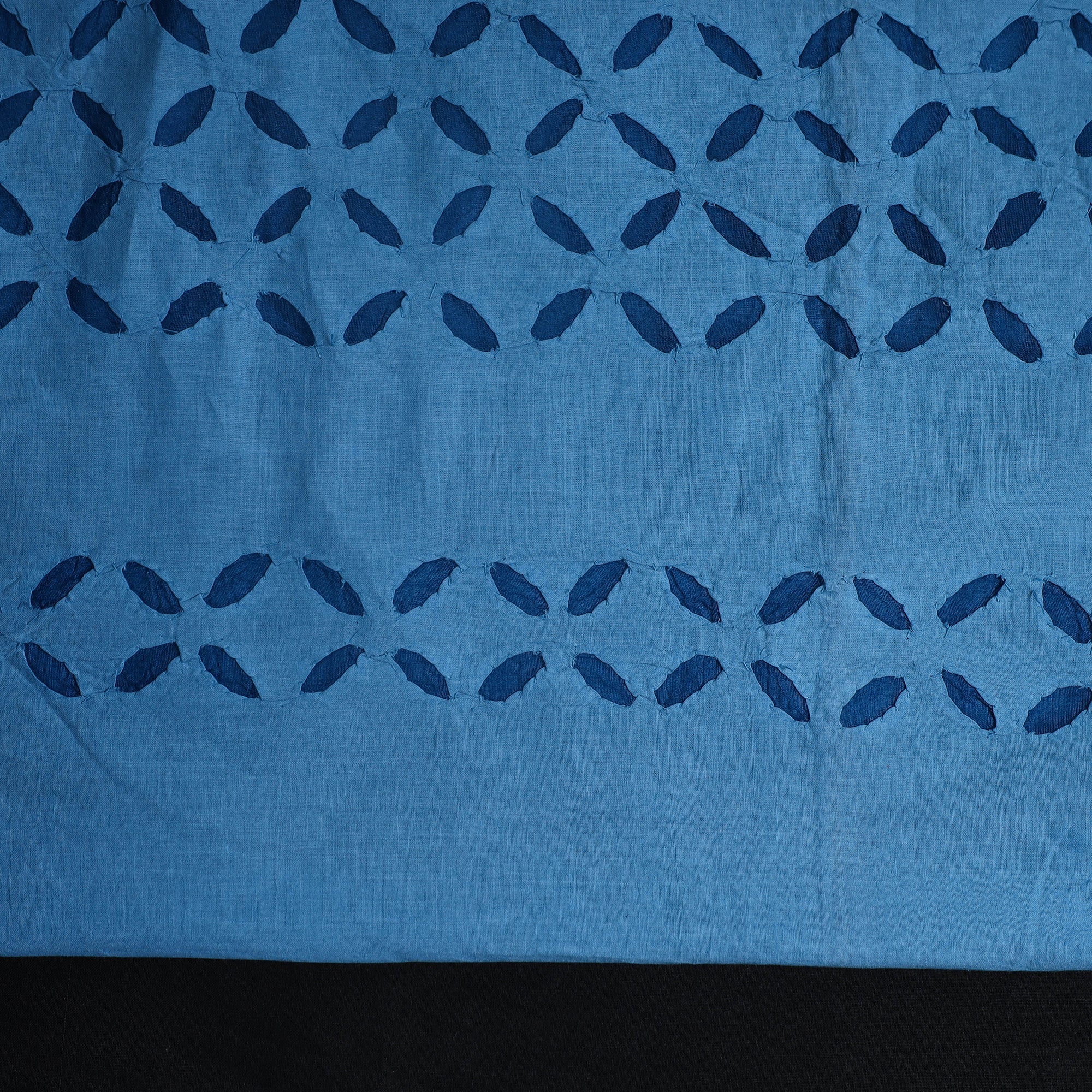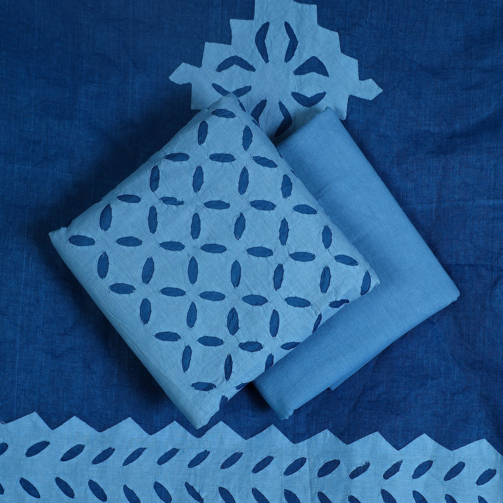 Blue 3pc cut work cotton barmer applique dress material from barmer, rajasthan. Its unique style of applique work does magic in light and shade with beautiful stories and patterns. The set includes a plain matching bottom and a dupatta adorned with delicate applique designs.