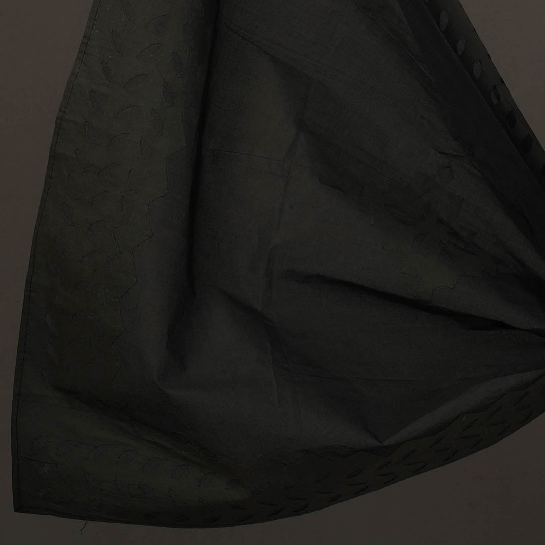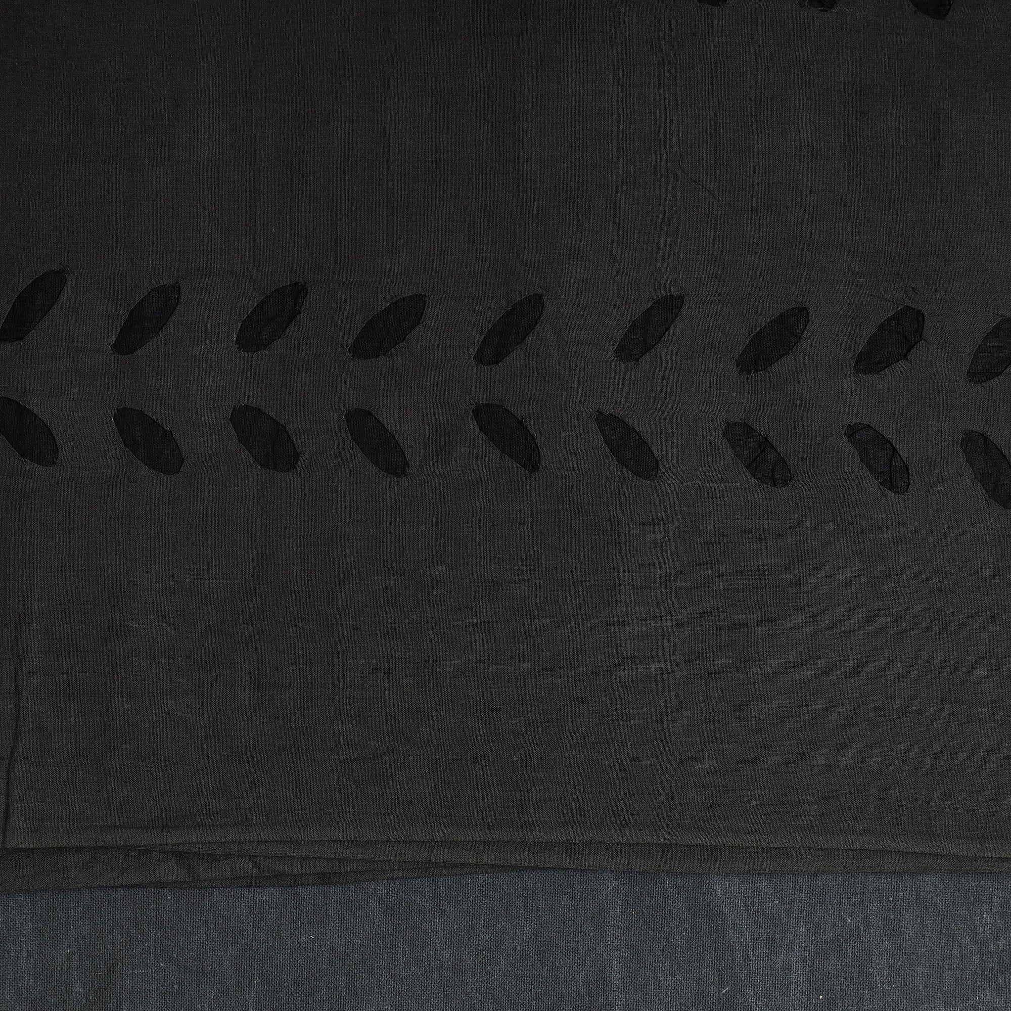 Black 3pc cut work cotton barmer applique dress material from barmer, rajasthan. Its unique style of applique work does magic in light and shade with beautiful stories and patterns. The set includes a plain matching bottom and a dupatta adorned with delicate applique designs.