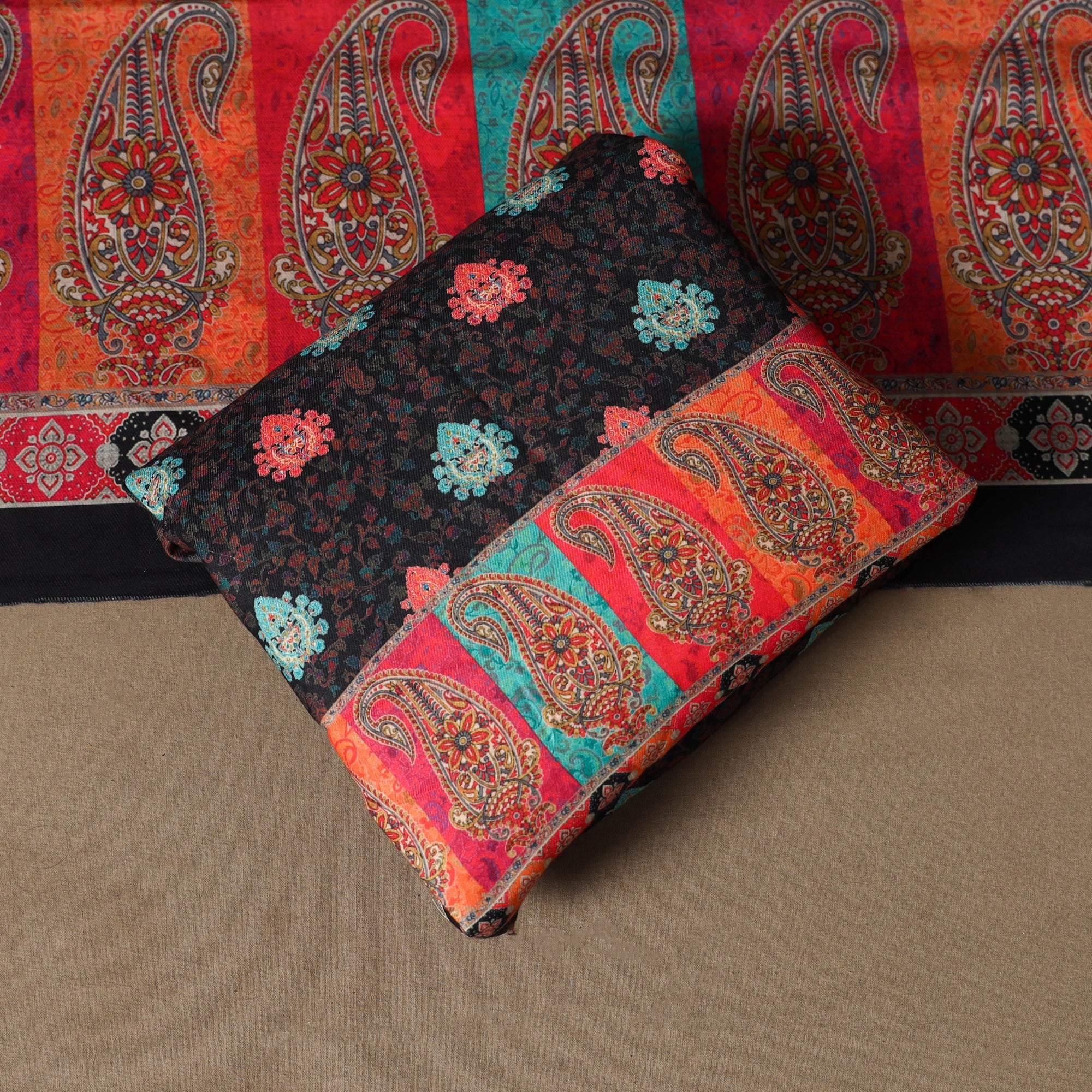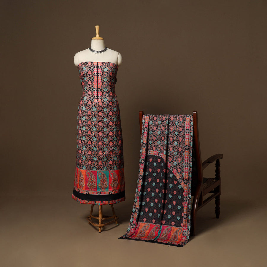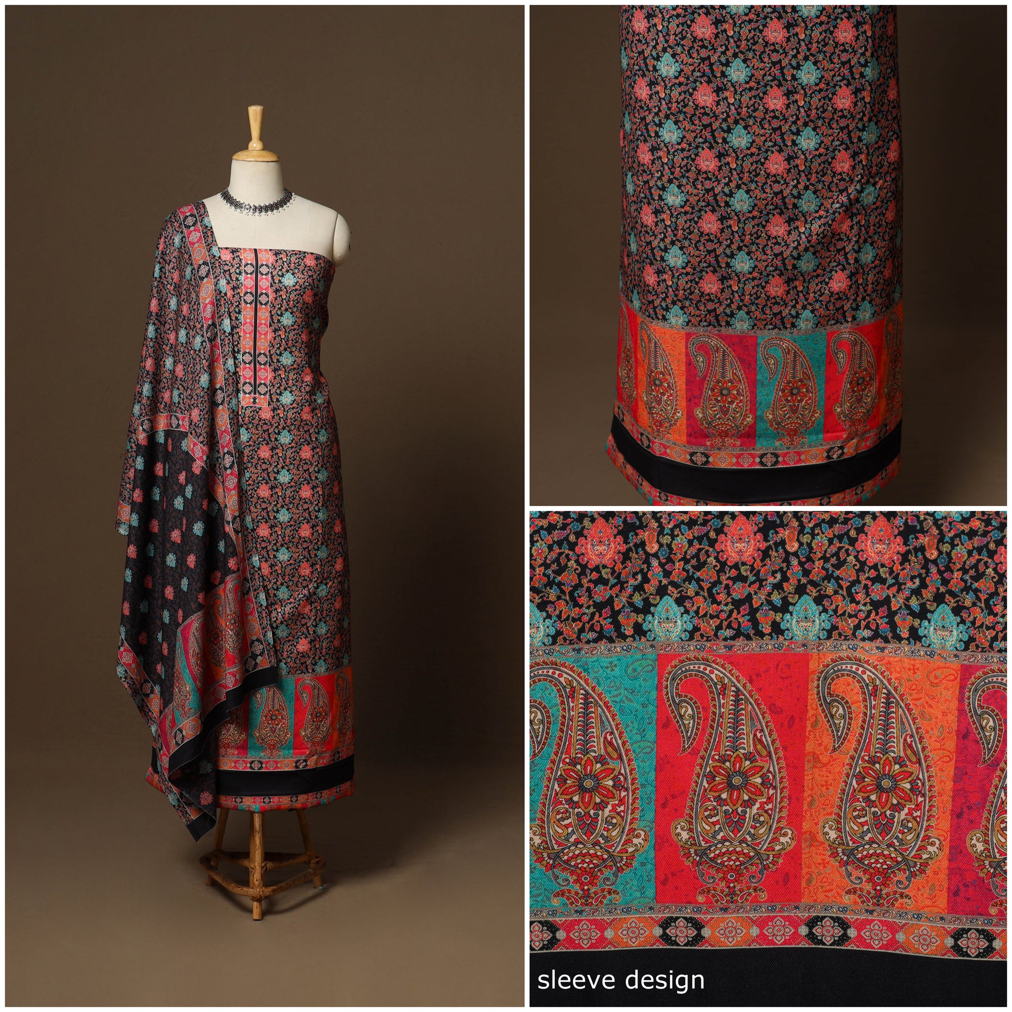 This black 3pc digital printed merino wool unstitched dress material is perfect for elegant winter wear. Made from premium merino wool, it provides warmth, comfort, and a soft, luxurious feel. The set includes fabric for the top, bottom, and dupatta, beautifully enhanced with detailed digital prints. Ideal for tailoring into chic suits for casual gatherings or festive occasions. A graceful choice for stylish and cozy winter dressing.