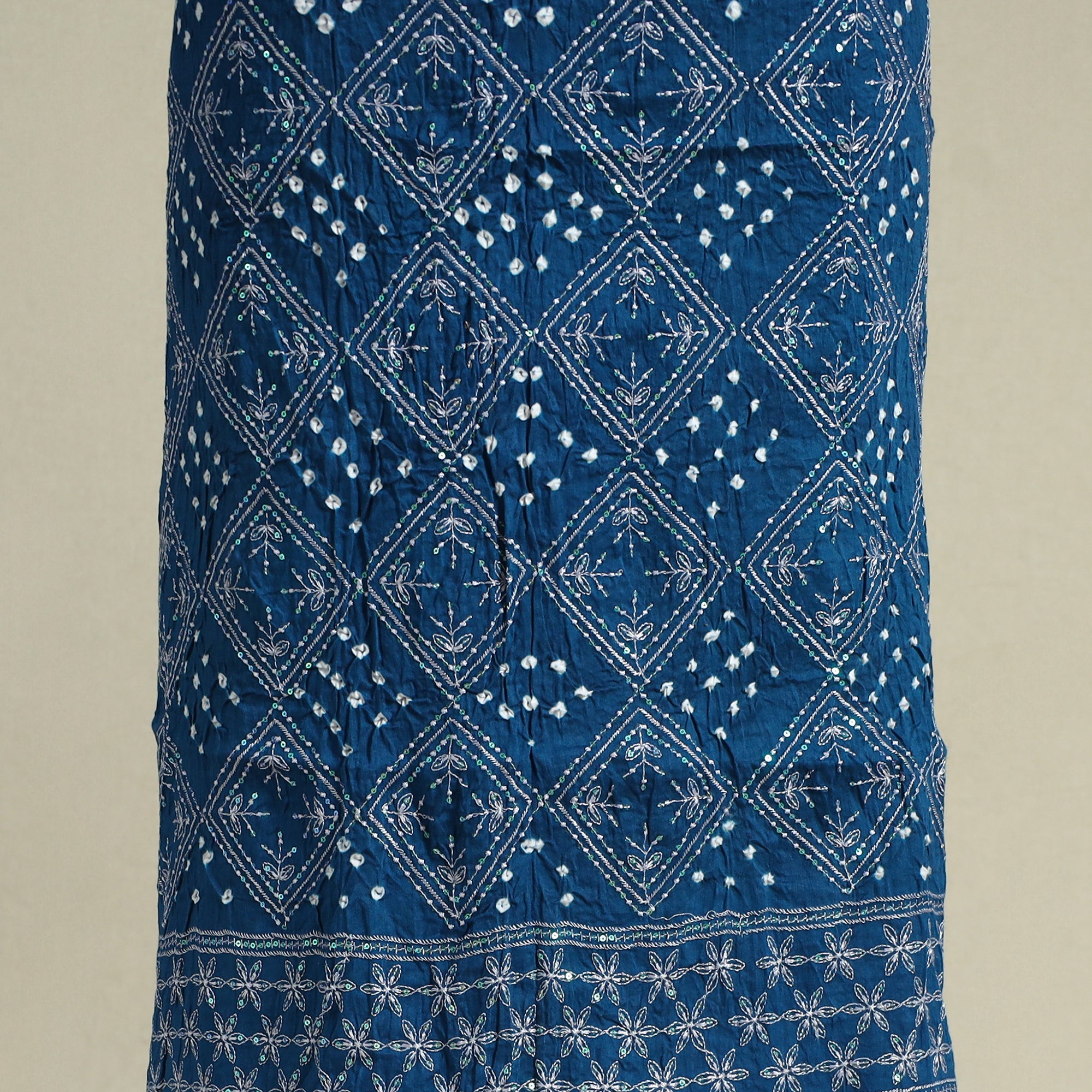 Add a traditional touch to your wardrobe with this blue 3pc satin cotton bandhani dress material, crafted using age-old tie-dye techniques. Handcrafted by skilled Kutch artisans, the fabric is carefully tied and dyed at multiple points to form intricate patterns. The kurta features delicate embroidery, while the set includes a matching bandhani dupatta and bottom fabric. Perfect for festive occasions, family functions, or everyday ethnic wear.