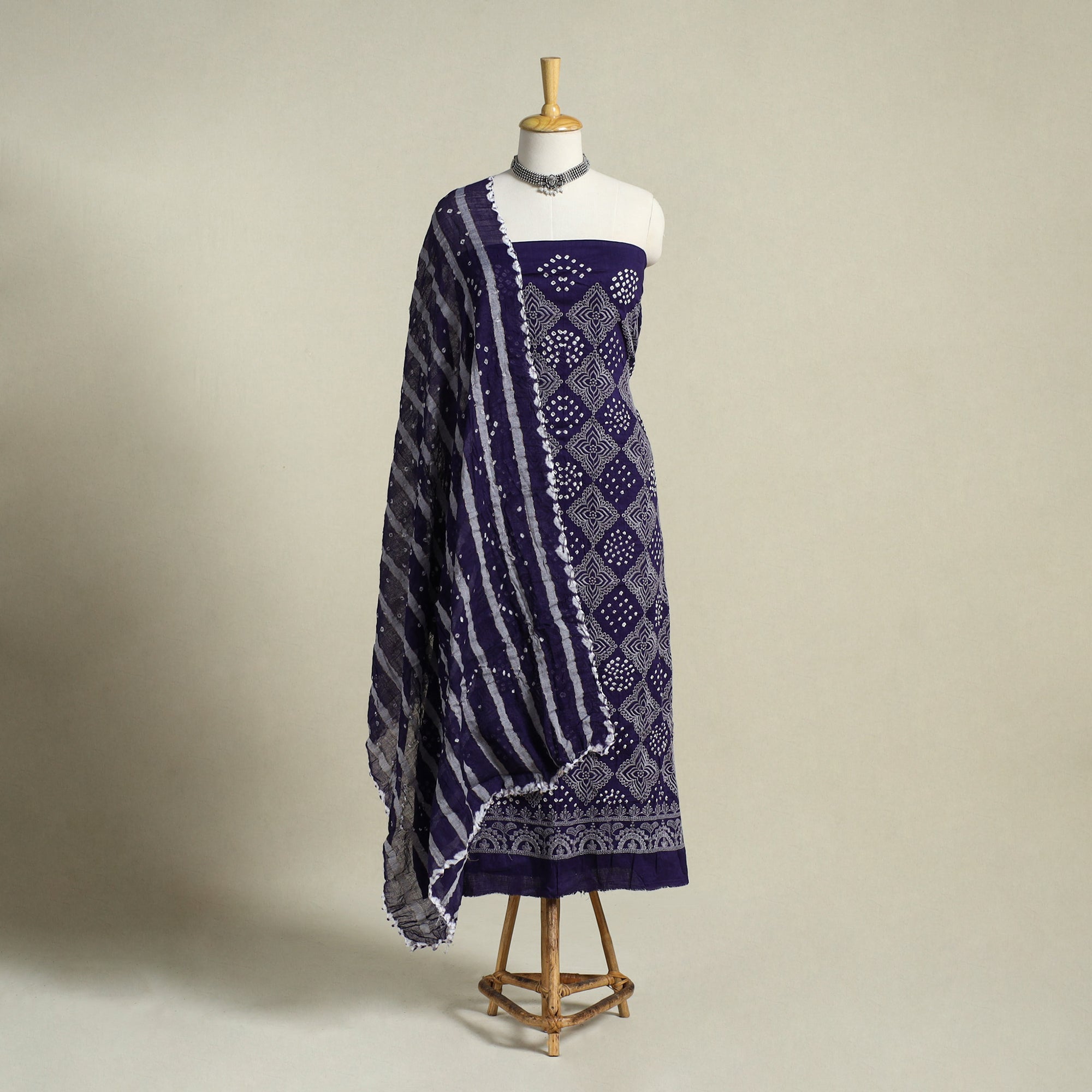 Add a traditional touch to your wardrobe with this blue 3pc satin cotton bandhani dress material, crafted using age-old tie-dye techniques. Handcrafted by skilled Kutch artisans, the fabric is carefully tied and dyed at multiple points to form intricate patterns. The kurta features delicate embroidery, while the set includes a matching bandhani dupatta and bottom fabric. Perfect for festive occasions, family functions, or everyday ethnic wear.