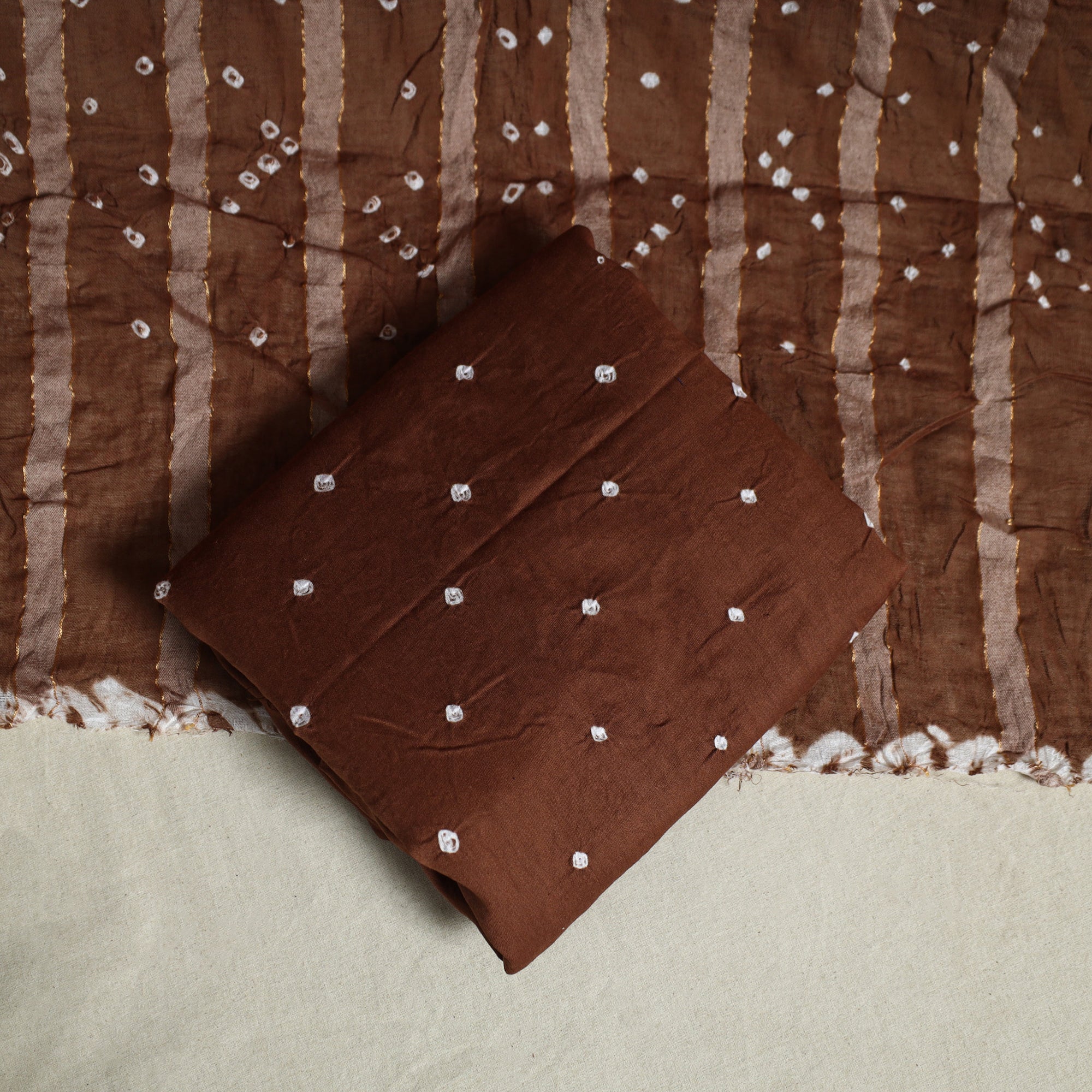 Add a traditional touch to your wardrobe with this brown 3pc satin cotton bandhani dress material, crafted using age-old tie-dye techniques. Handcrafted by skilled Kutch artisans, the fabric is carefully tied and dyed at multiple points to form intricate patterns. The kurta features delicate embroidery, while the set includes a matching bandhani dupatta and bottom fabric. Perfect for festive occasions, family functions, or everyday ethnic wear.