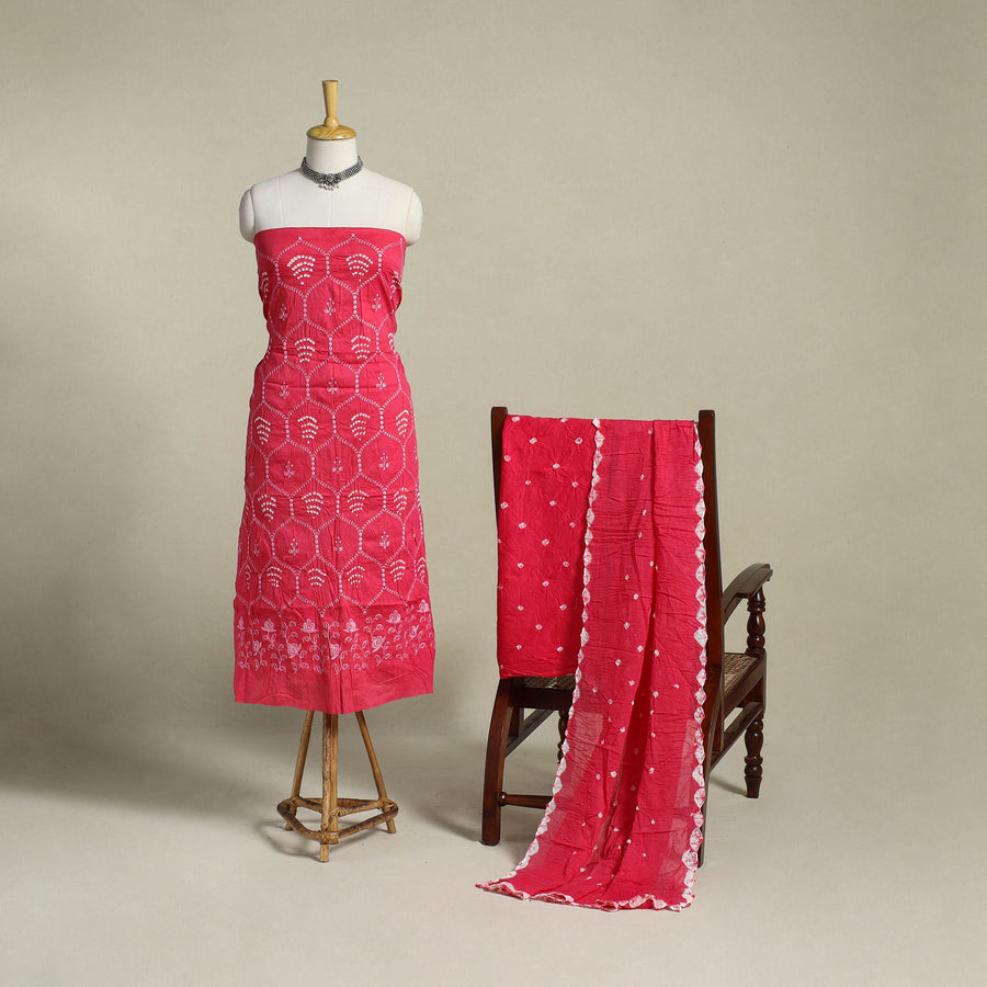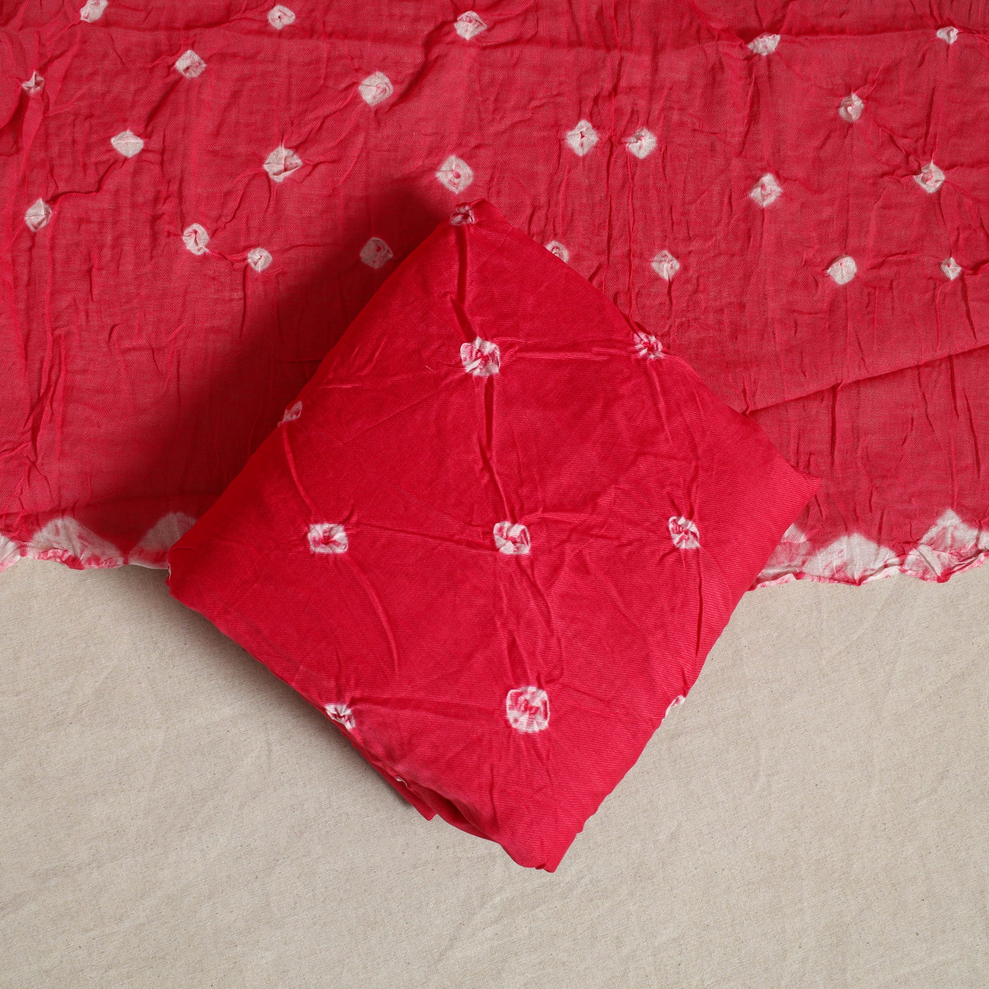 Add a traditional touch to your wardrobe with this red 3pc satin cotton bandhani dress material, crafted using age-old tie-dye techniques. Handcrafted by skilled Kutch artisans, the fabric is carefully tied and dyed at multiple points to form intricate patterns. The kurta features delicate embroidery, while the set includes a matching bandhani dupatta and bottom fabric. Perfect for festive occasions, family functions, or everyday ethnic wear.