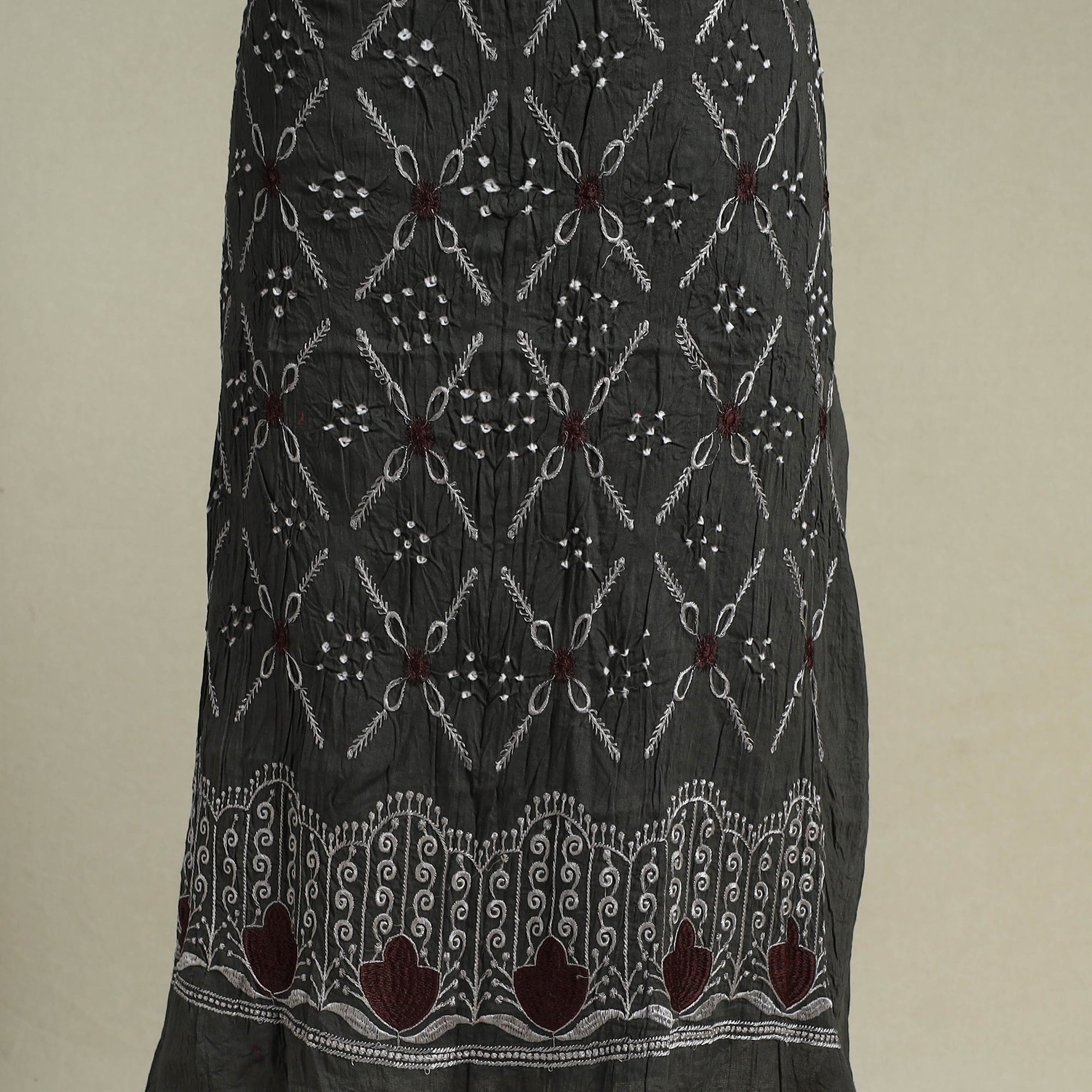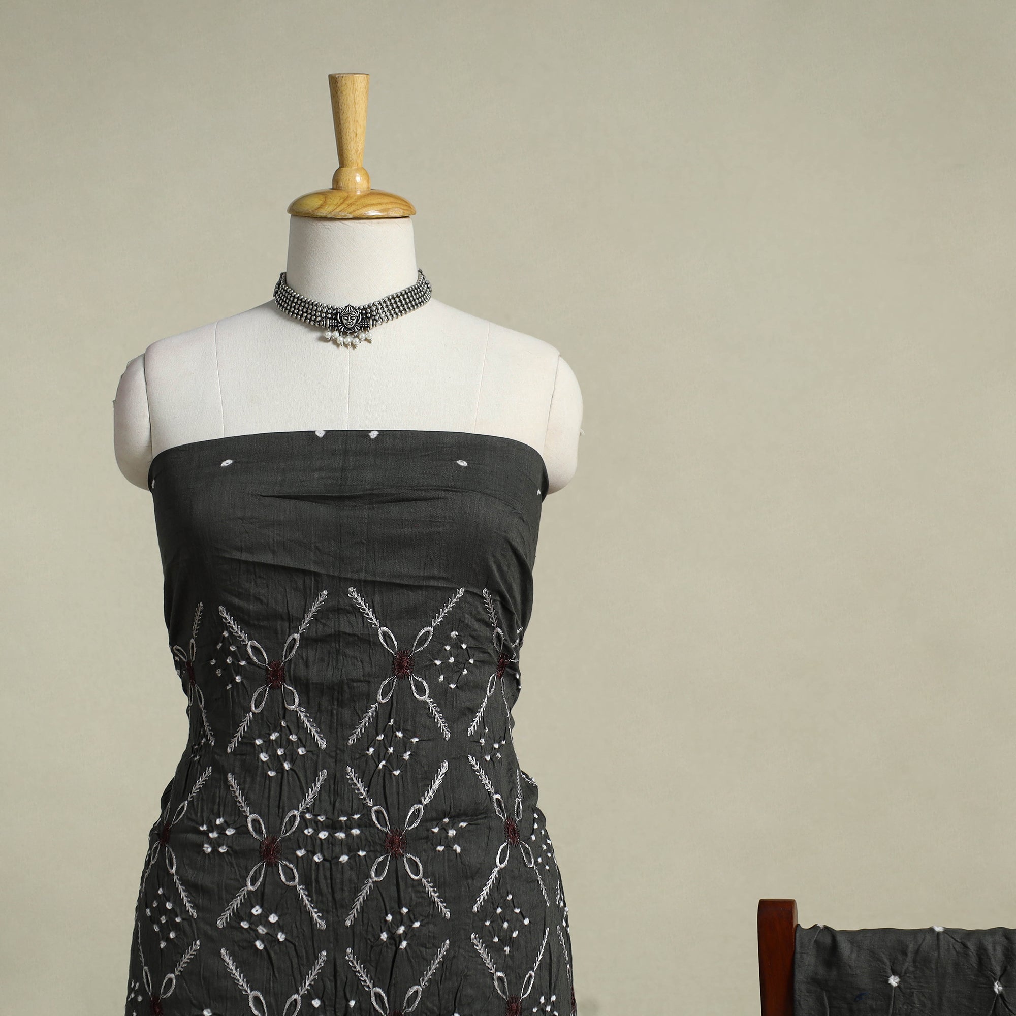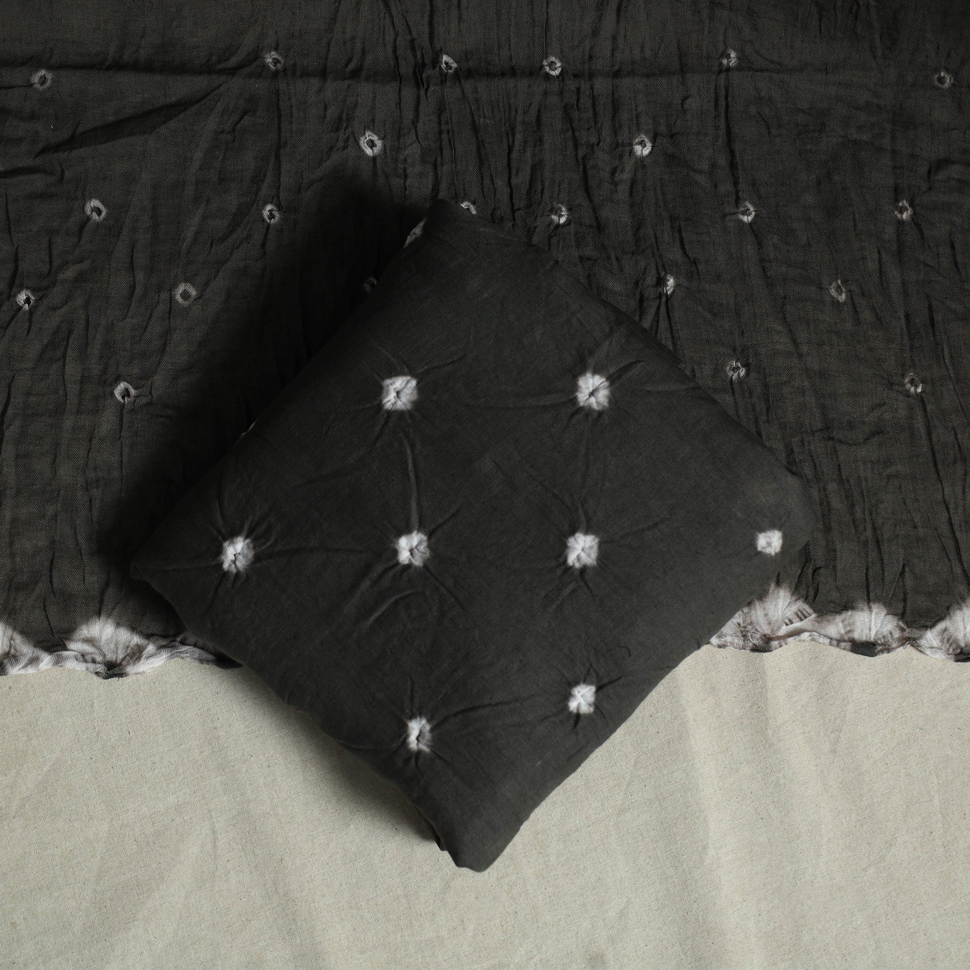 Add a traditional touch to your wardrobe with this black 3pc satin cotton bandhani dress material, crafted using age-old tie-dye techniques. Handcrafted by skilled Kutch artisans, the fabric is carefully tied and dyed at multiple points to form intricate patterns. The kurta features delicate embroidery, while the set includes a matching bandhani dupatta and bottom fabric. Perfect for festive occasions, family functions, or everyday ethnic wear.