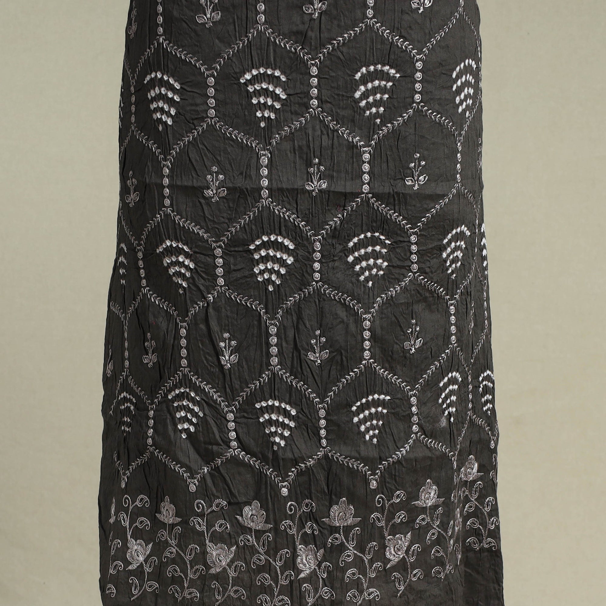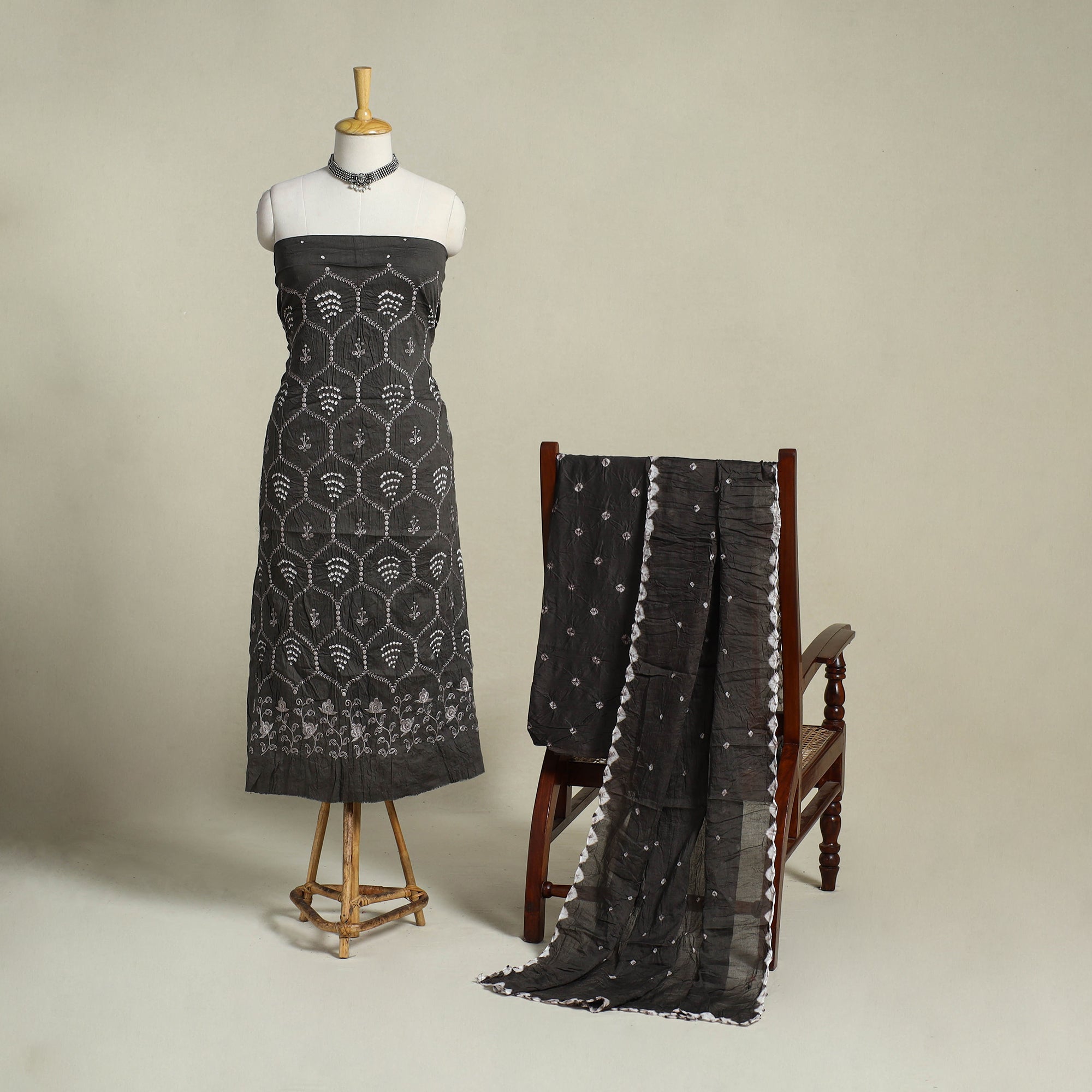 Add a traditional touch to your wardrobe with this black 3pc satin cotton bandhani dress material, crafted using age-old tie-dye techniques. Handcrafted by skilled Kutch artisans, the fabric is carefully tied and dyed at multiple points to form intricate patterns. The kurta features delicate embroidery, while the set includes a matching bandhani dupatta and bottom fabric. Perfect for festive occasions, family functions, or everyday ethnic wear.