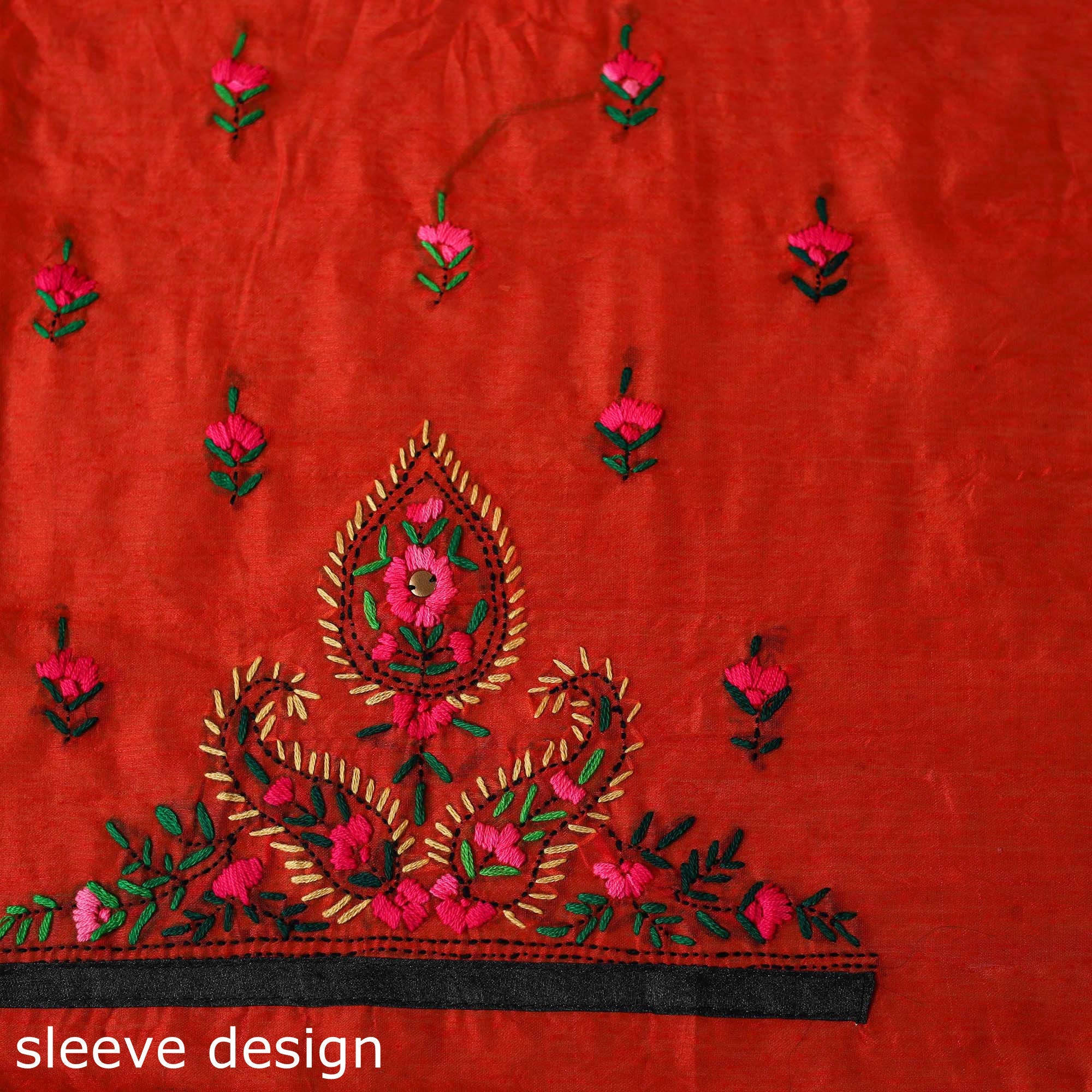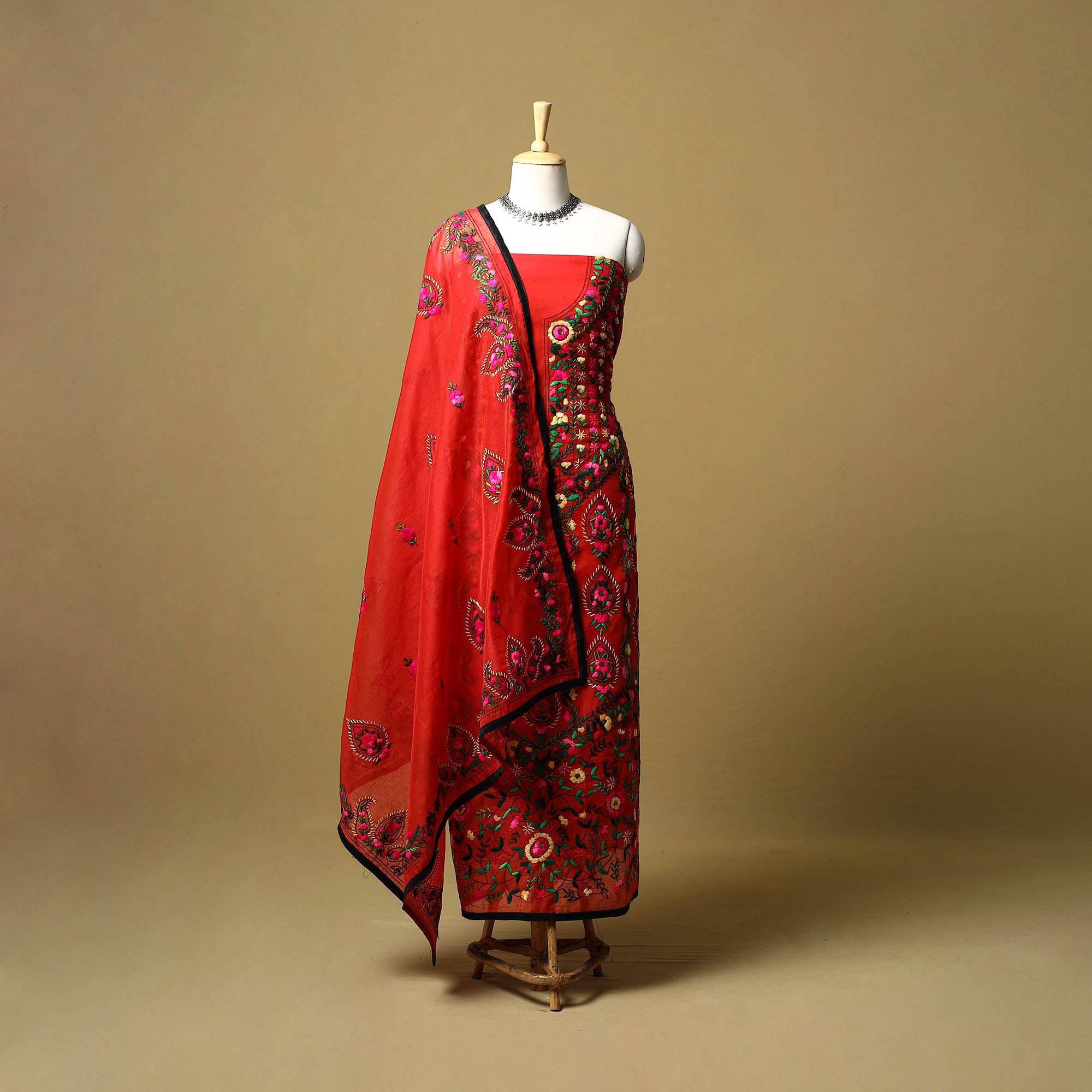 This red ranihati chapa work hand embroidered chanderi silk cotton 3pc suit material set includes a kurta, dupatta, and bottom. Each piece is beautifully hand-embroidered by skilled artisans, showcasing intricate designs and floral-inspired motifs. This suit material set allows you to unleash your creativity and craft a truly unique outfit.