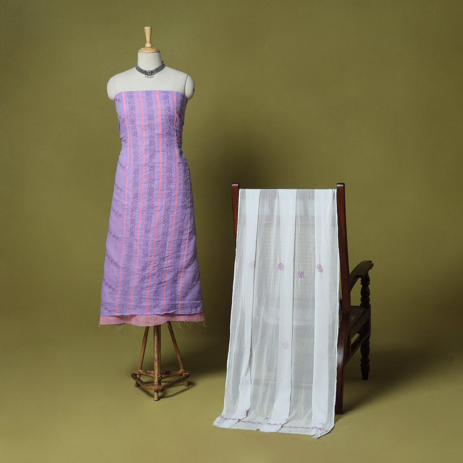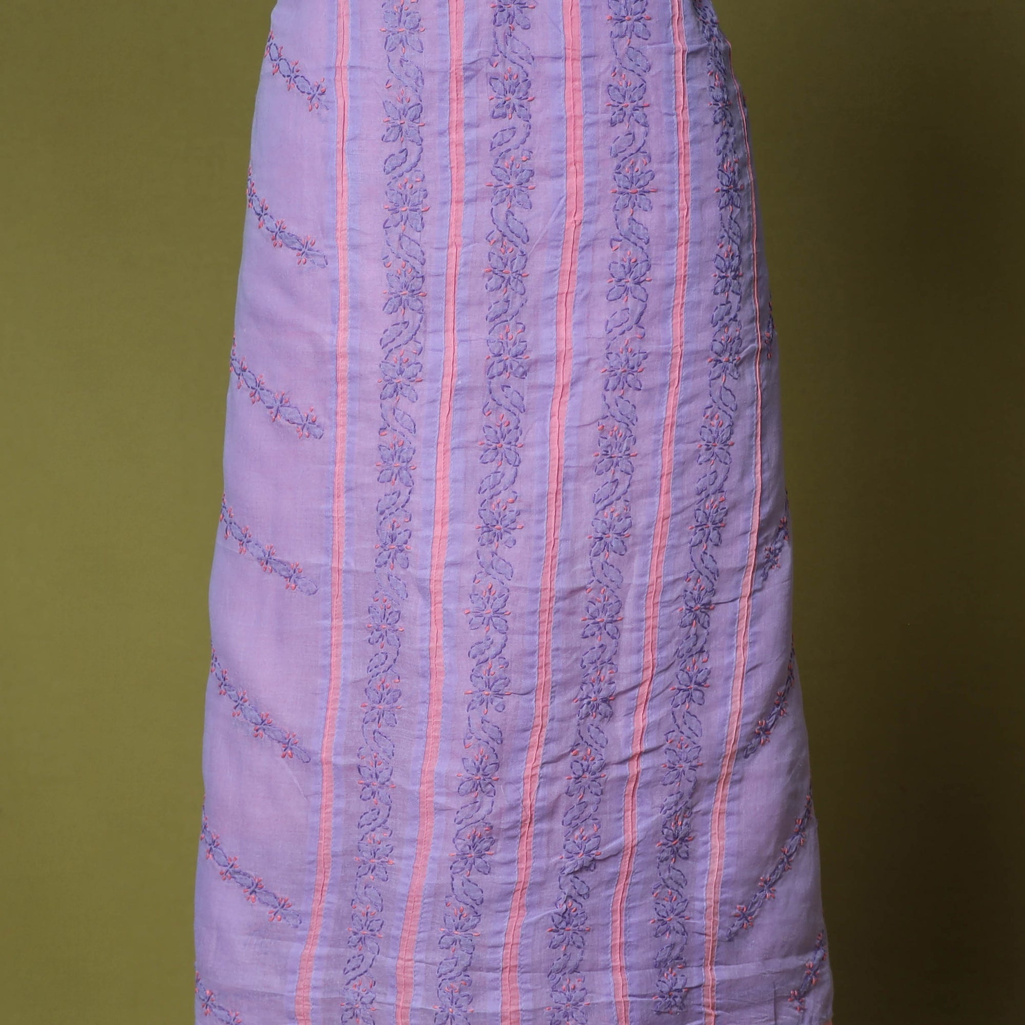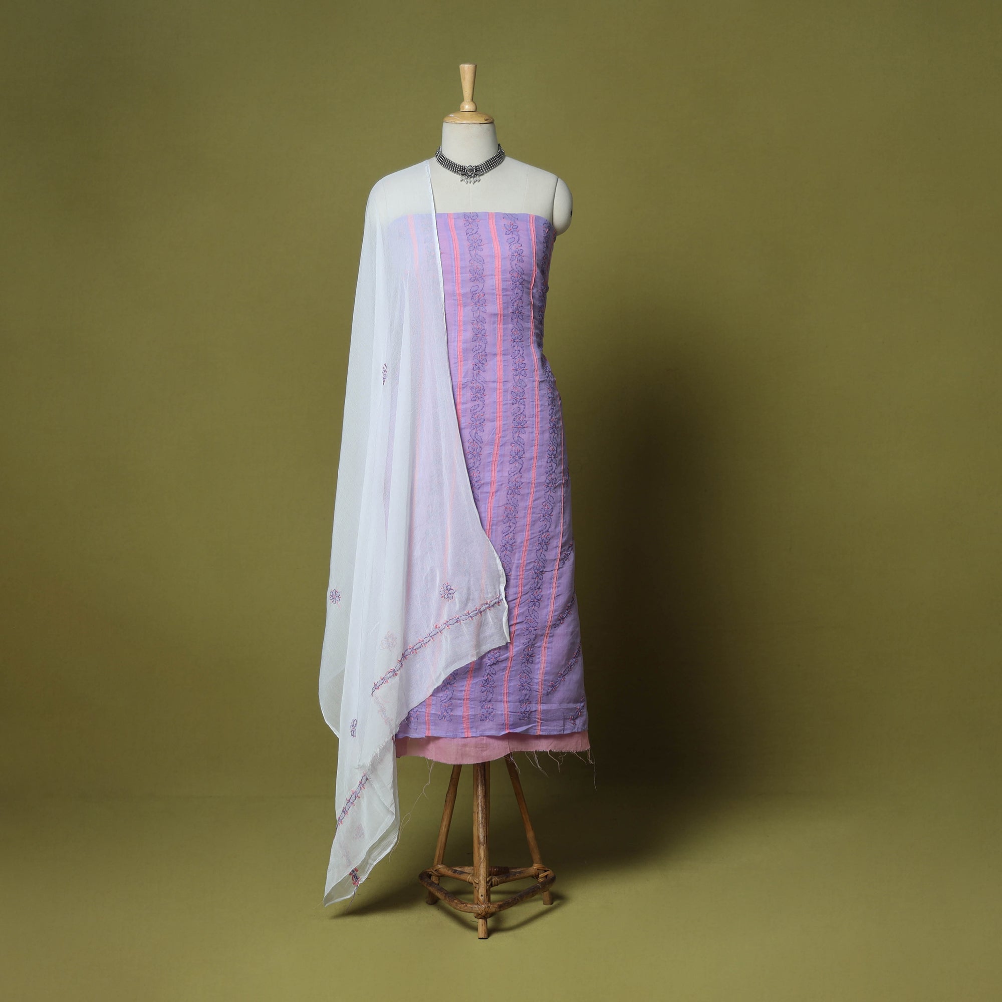 This purple 3pc cotton chikankari dress material reflects the heritage of Lucknow’s intricate embroidery. Created with delicate needlework, the motifs look graceful and refined on fabric. The set comes with a cotton top, bottom, and dupatta, offering both comfort and charm. Ideal for everyday wear or special occasions, this Chikankari suit is a timeless choice that brings tradition into your style.