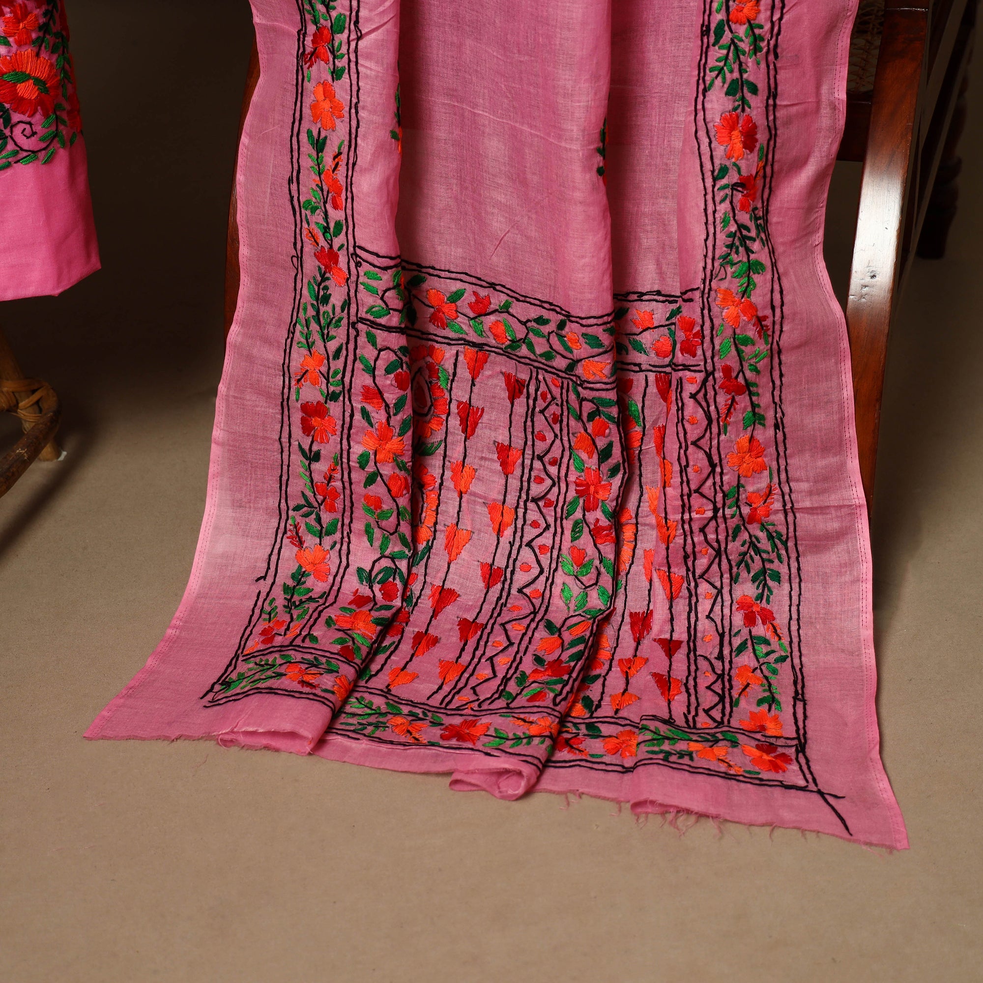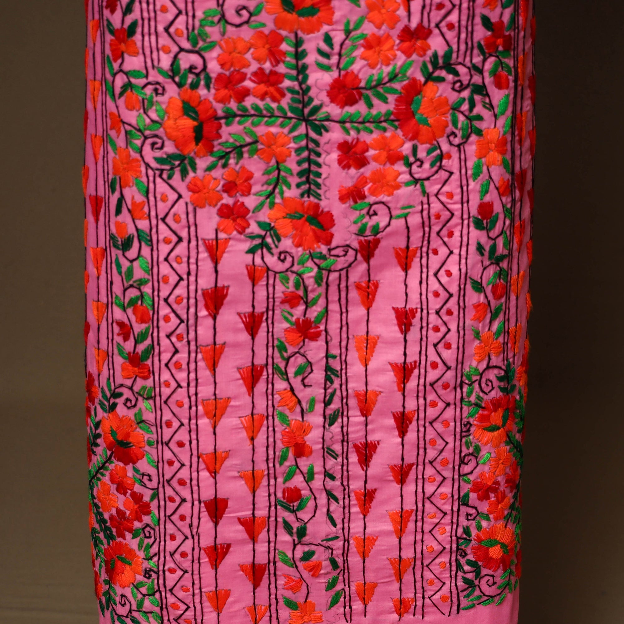 Add a cultural touch to your wardrobe with this pink 3pc chapa work hand-embroidered phulkari dress material set. Rooted in Punjab’s vibrant tradition, phulkari meaning ‘flower work’ is admired for its intricate embroidery. The set includes an embroidered kurta fabric, a matching dupatta, and a plain bottom fabric. Crafted in soft, breathable cotton, it is perfect for both daily wear and festive occasions, seamlessly blending style with heritage in one timeless outfit.