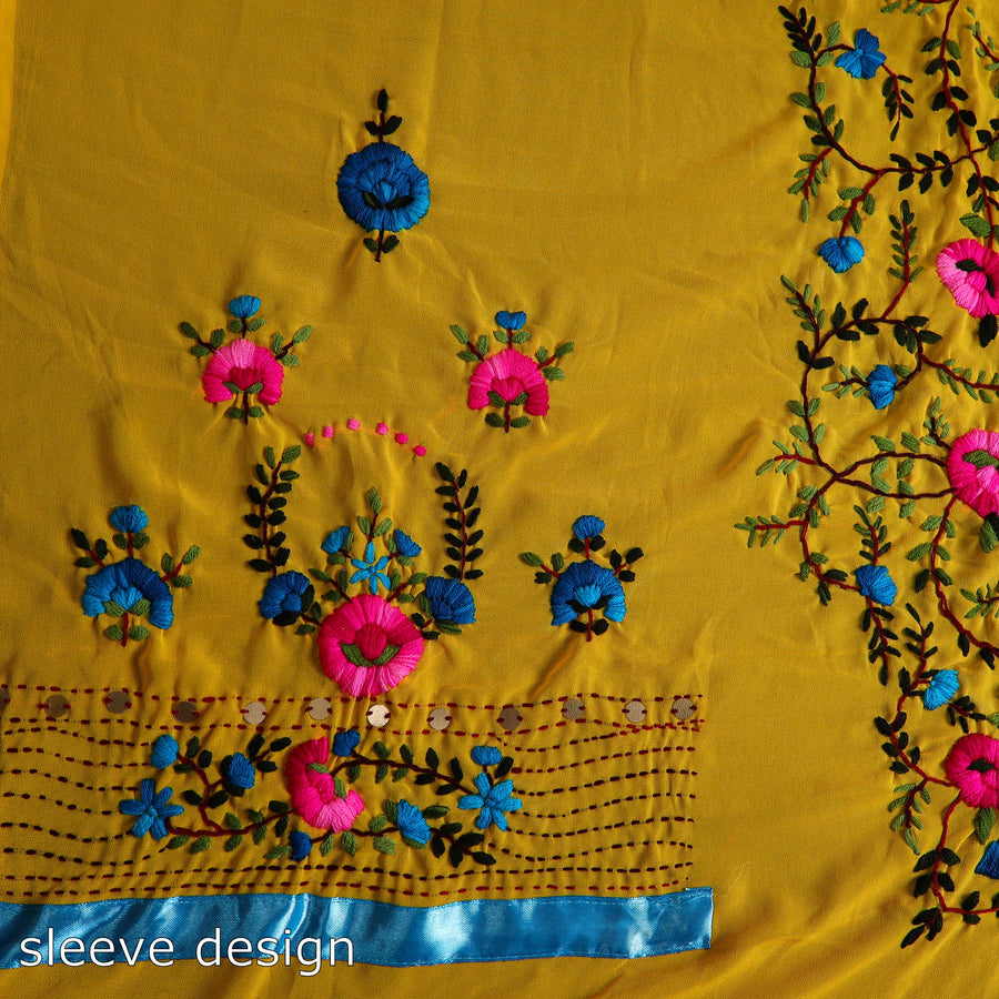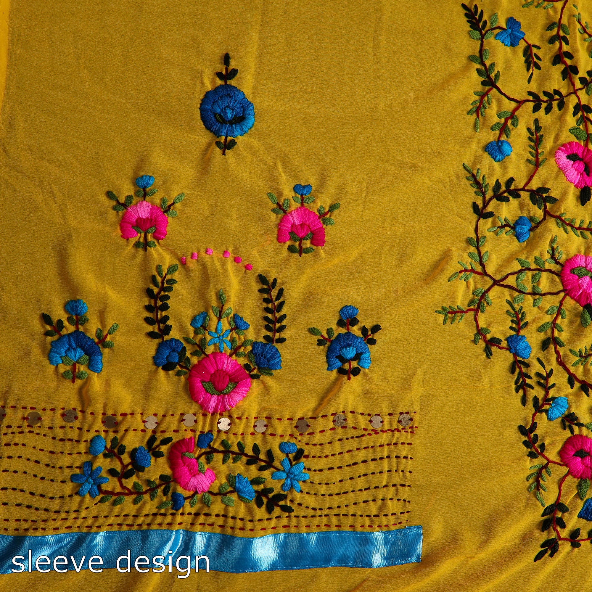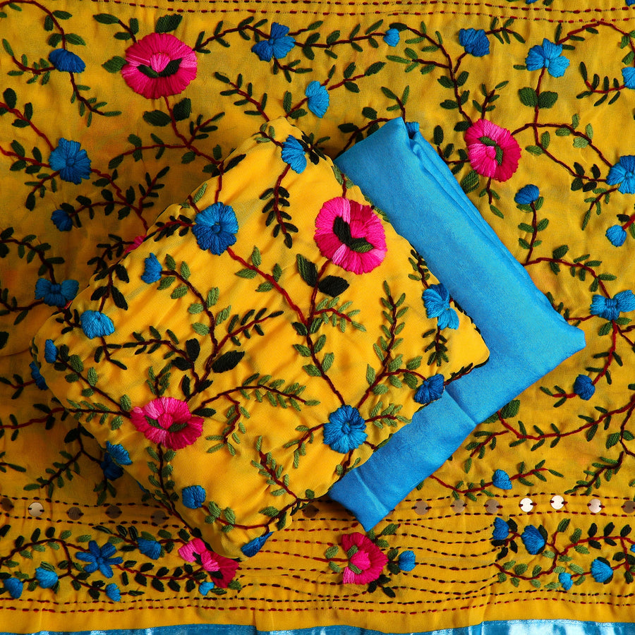 Indulge in the beauty with this yellow 3-piece hand embroidery georgette phulkari dress material set. It is made using chhapawork. Phulkari, meaning "flower" and "kari," meaning craft, is a traditional embroidery art from Punjab, India. It uses floral motifs and is done with woolen threads.