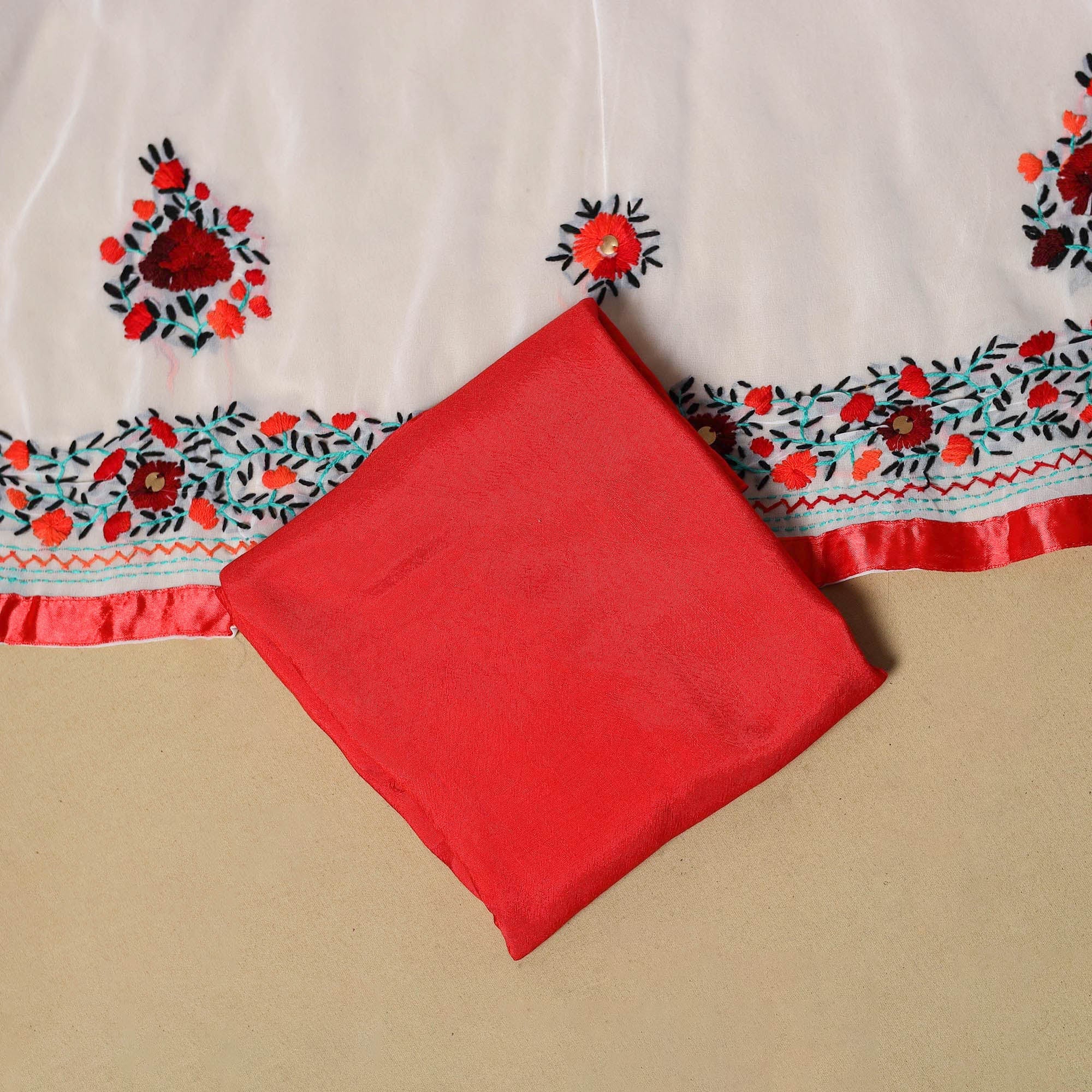 This ranihati chapa work hand embroidered georgette 3pc suit material set includes a kurta, dupatta, and bottom. Each piece is beautifully hand-embroidered by skilled artisans, showcasing intricate designs and floral-inspired motifs. This suit material set allows you to unleash your creativity and craft a truly unique outfit.