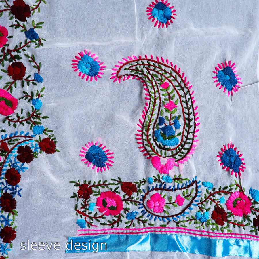 Indulge in the beauty with this multicolor 3-piece hand embroidery georgette phulkari dress material set. It is made using chhapawork. Phulkari, meaning "flower" and "kari," meaning craft, is a traditional embroidery art from Punjab, India. It uses floral motifs and is done with woolen threads.