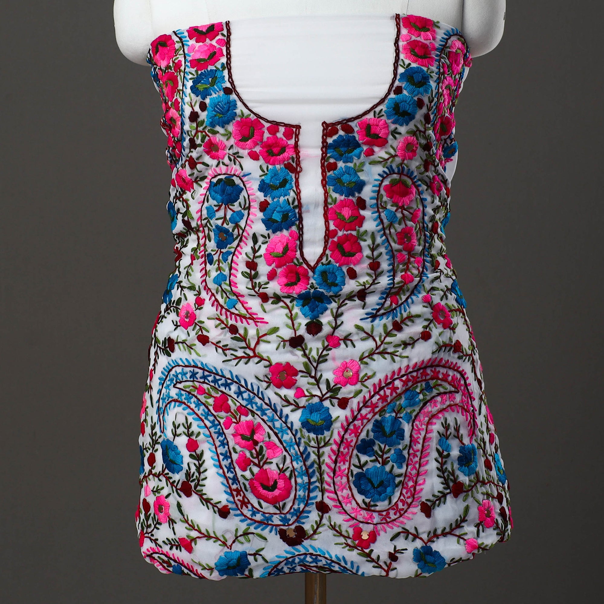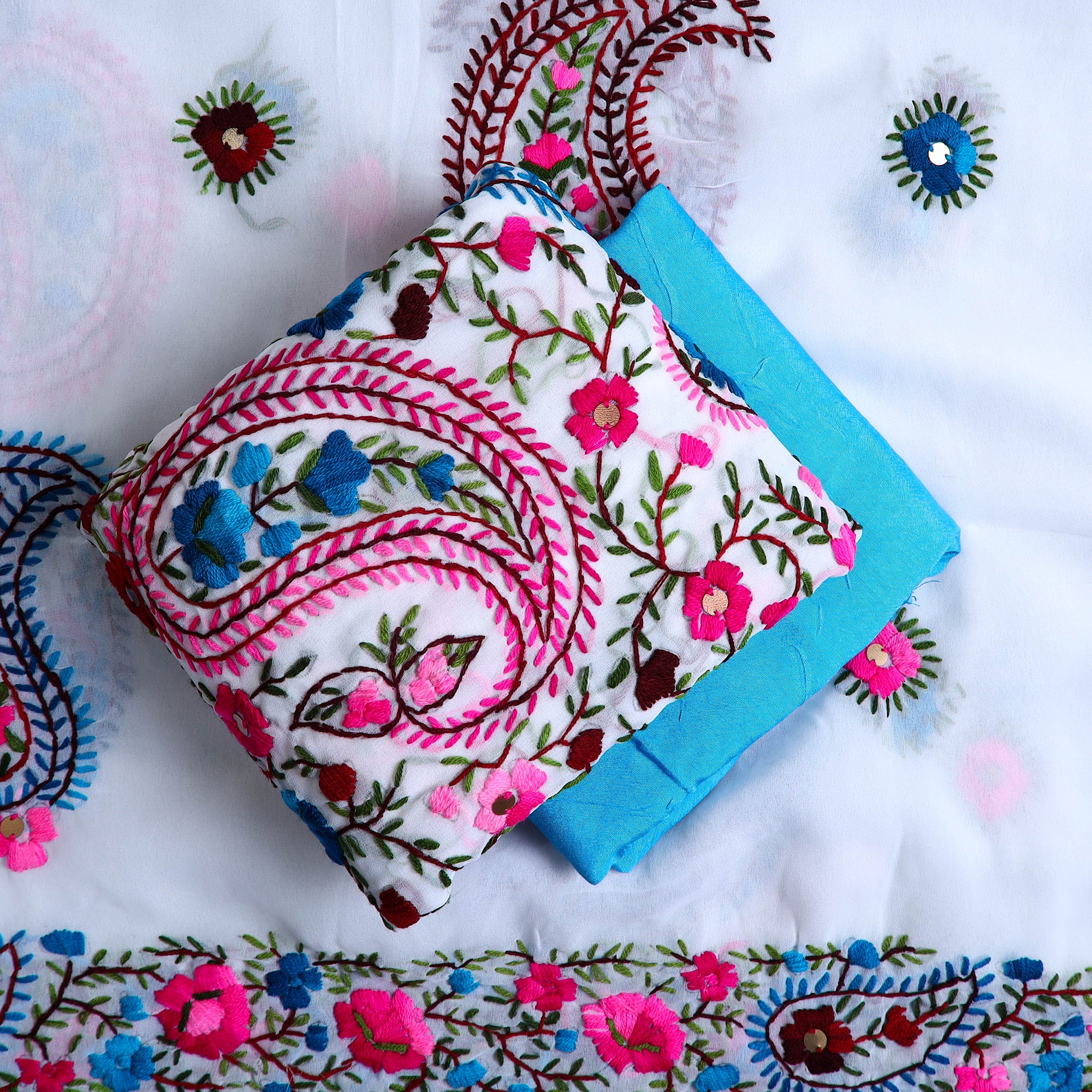 Indulge in the beauty with this multicolor 3-piece hand embroidery georgette phulkari dress material set. It is made using chhapawork. Phulkari, meaning "flower" and "kari," meaning craft, is a traditional embroidery art from Punjab, India. It uses floral motifs and is done with woolen threads.