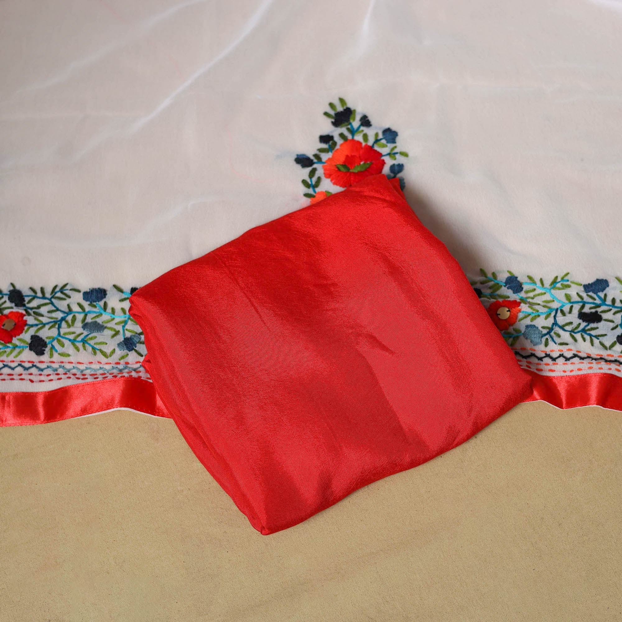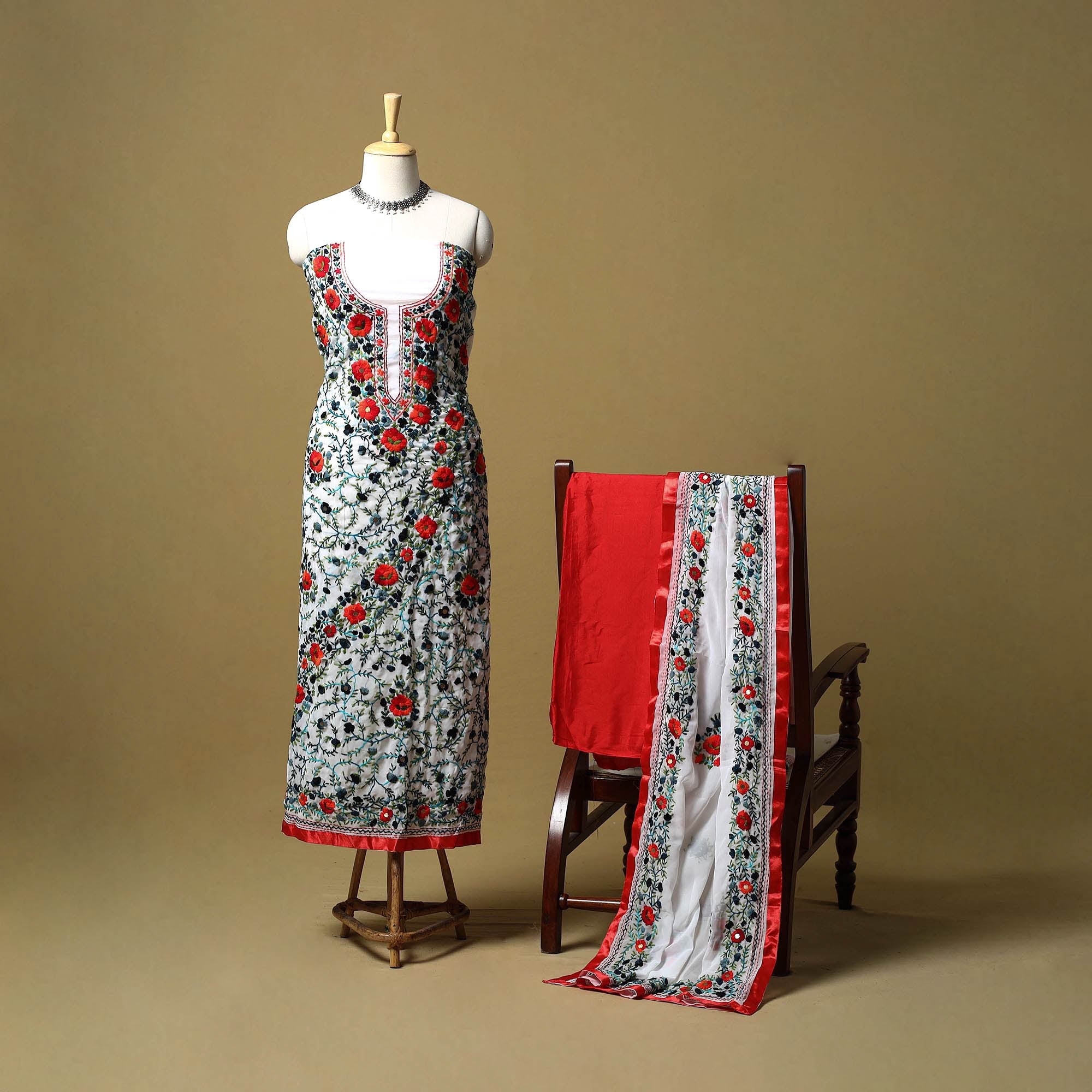 This white ranihati chapa work hand embroidered georgette 3pc suit material set includes a kurta, dupatta, and bottom. Each piece is beautifully hand-embroidered by skilled artisans, showcasing intricate designs and floral-inspired motifs. This suit material set allows you to unleash your creativity and craft a truly unique outfit.