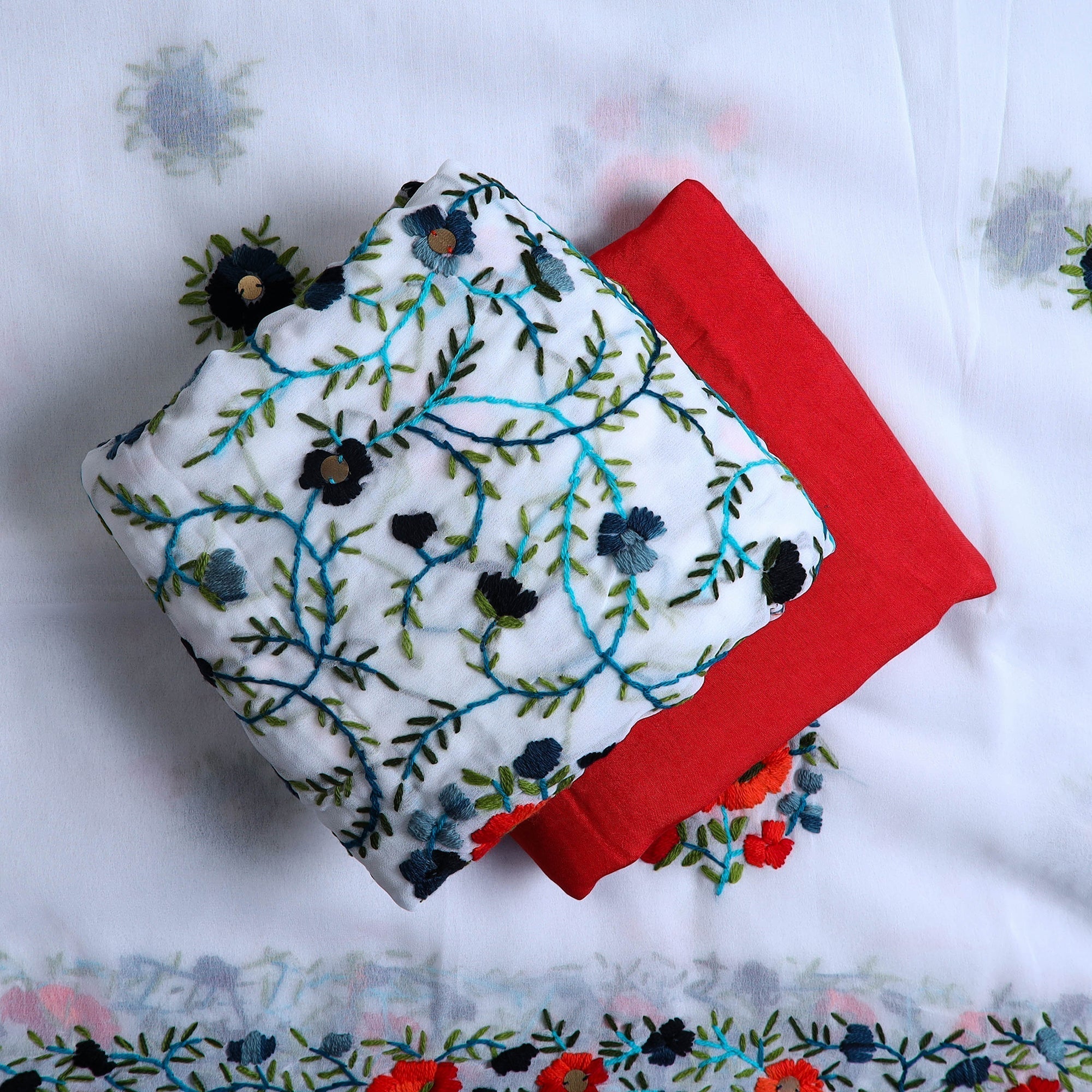 This ranihati chapa work hand embroidered georgette 3pc suit material set includes a kurta, dupatta, and bottom. Each piece is beautifully hand-embroidered by skilled artisans, showcasing intricate designs and floral-inspired motifs. This suit material set allows you to unleash your creativity and craft a truly unique outfit.