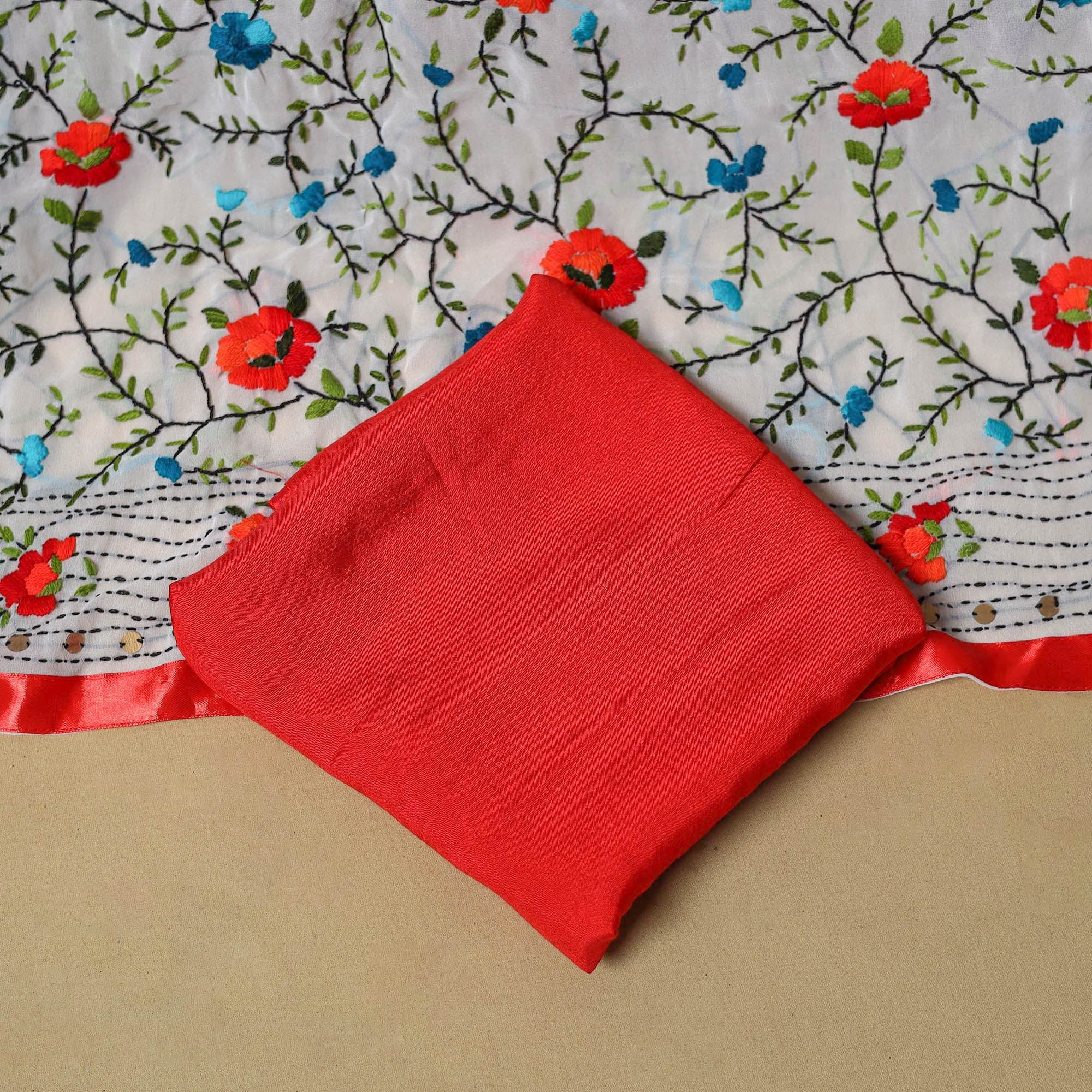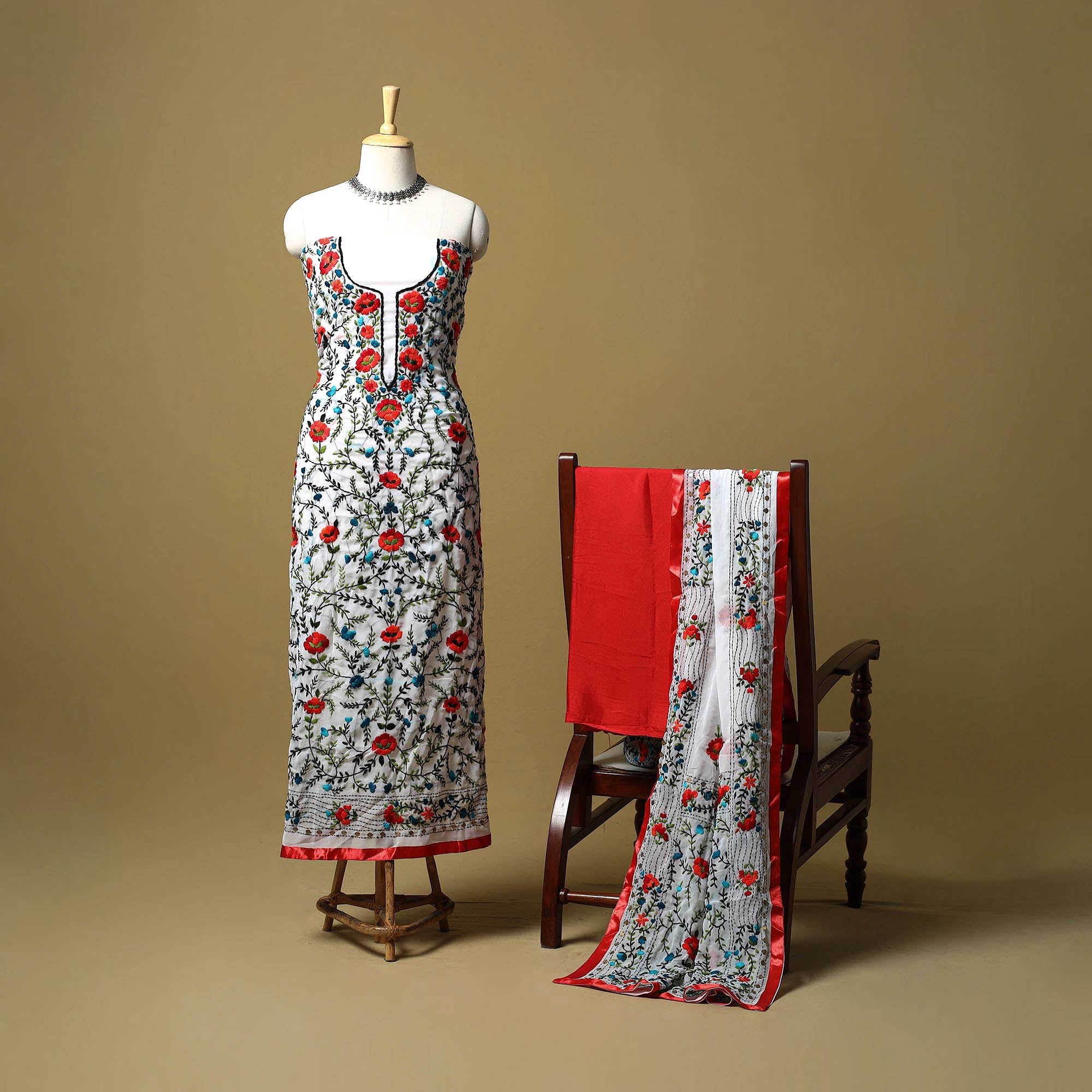 This white ranihati chapa work hand embroidered georgette 3pc suit material set includes a kurta, dupatta, and bottom. Each piece is beautifully hand-embroidered by skilled artisans, showcasing intricate designs and floral-inspired motifs. This suit material set allows you to unleash your creativity and craft a truly unique outfit.