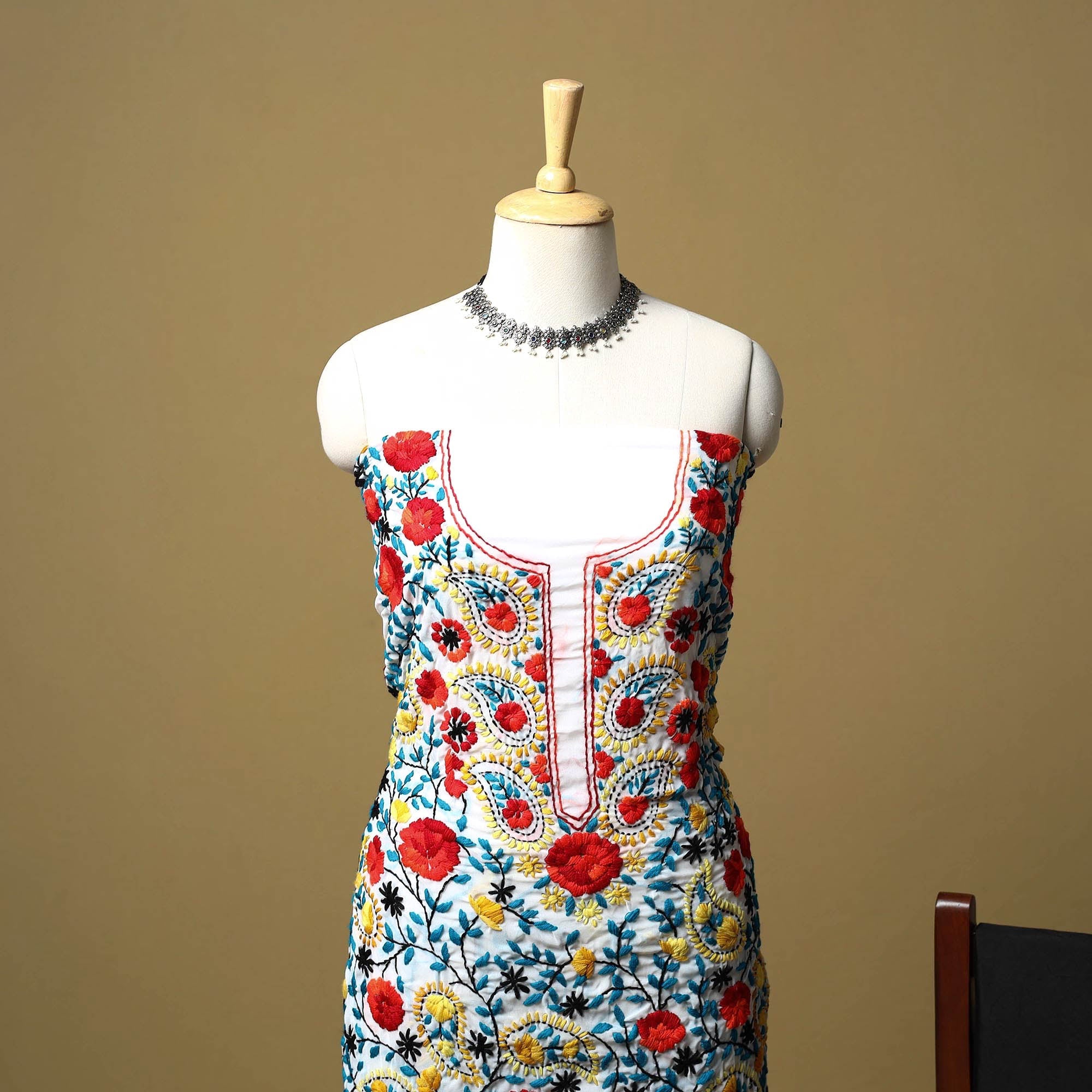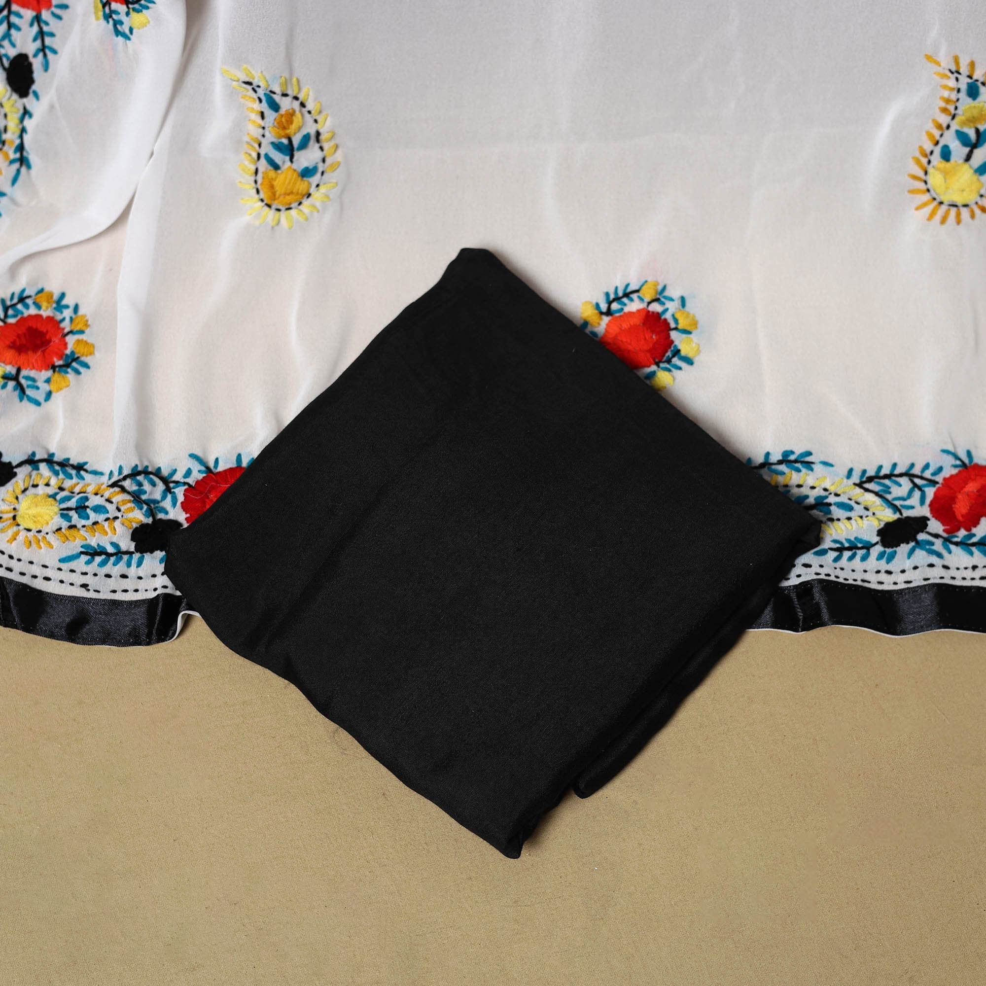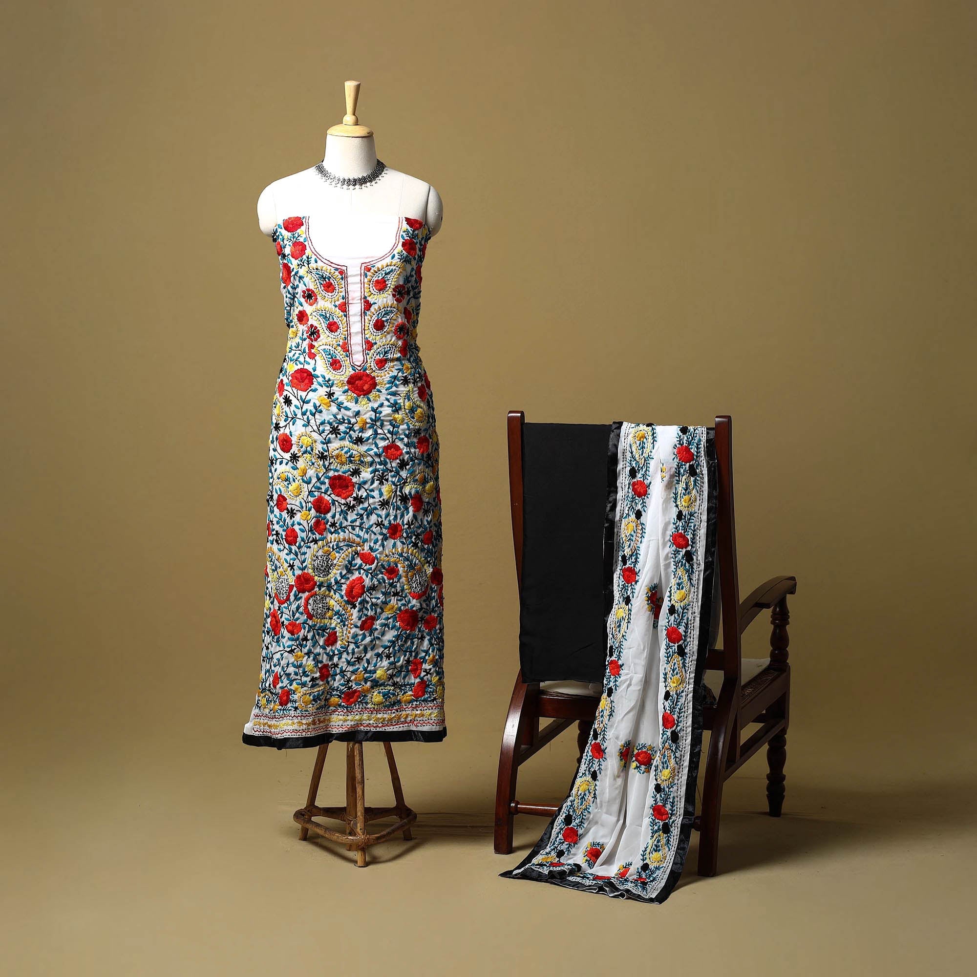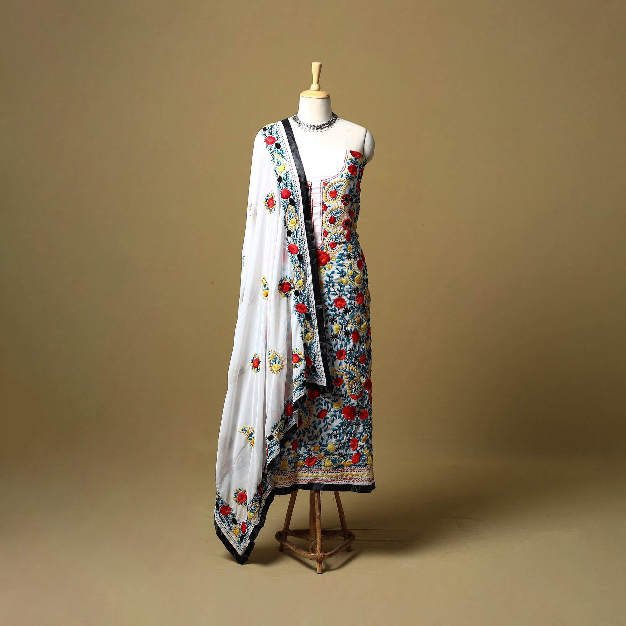This ranihati chapa work hand embroidered georgette 3pc suit material set includes a kurta, dupatta, and bottom. Each piece is beautifully hand-embroidered by skilled artisans, showcasing intricate designs and floral-inspired motifs. This suit material set allows you to unleash your creativity and craft a truly unique outfit.
