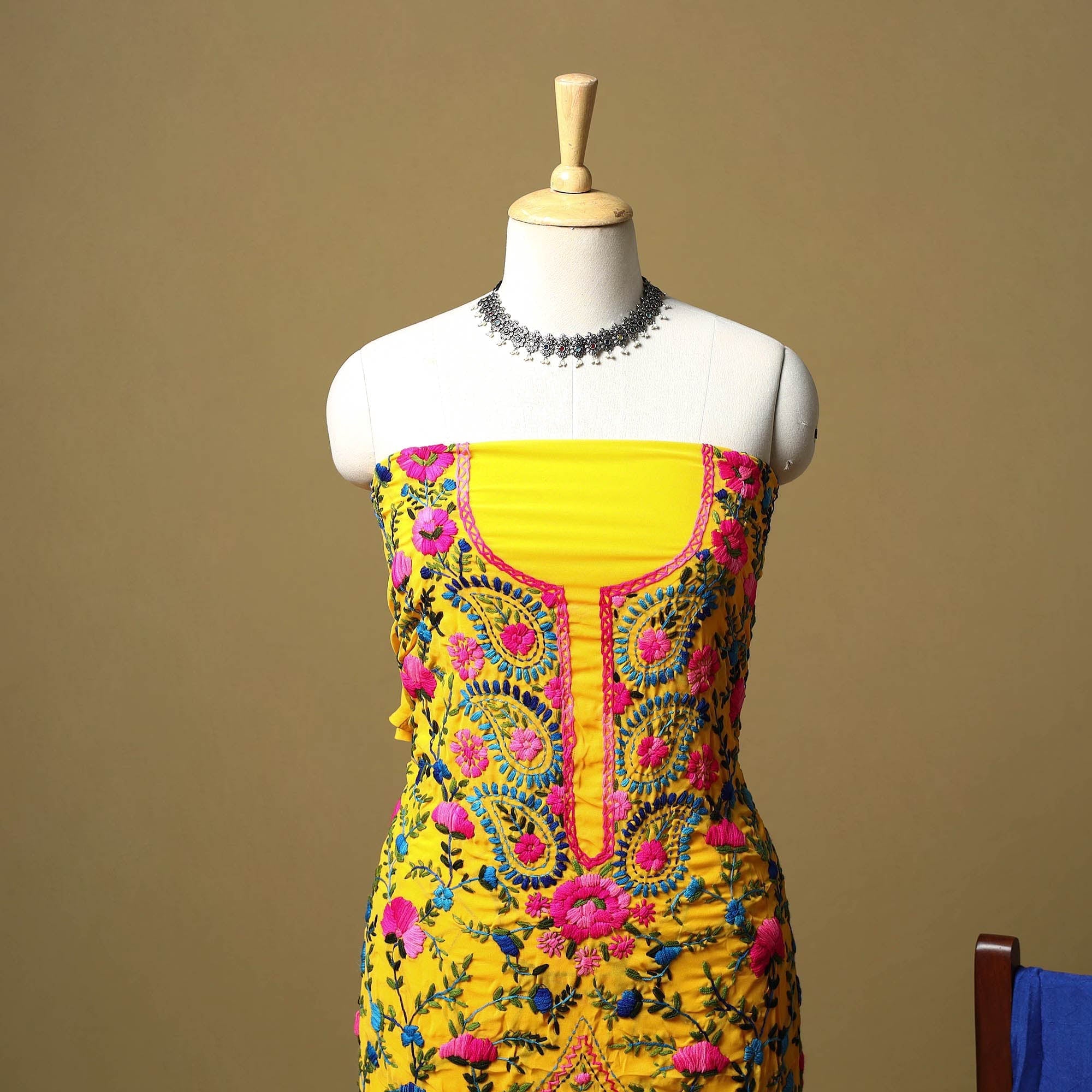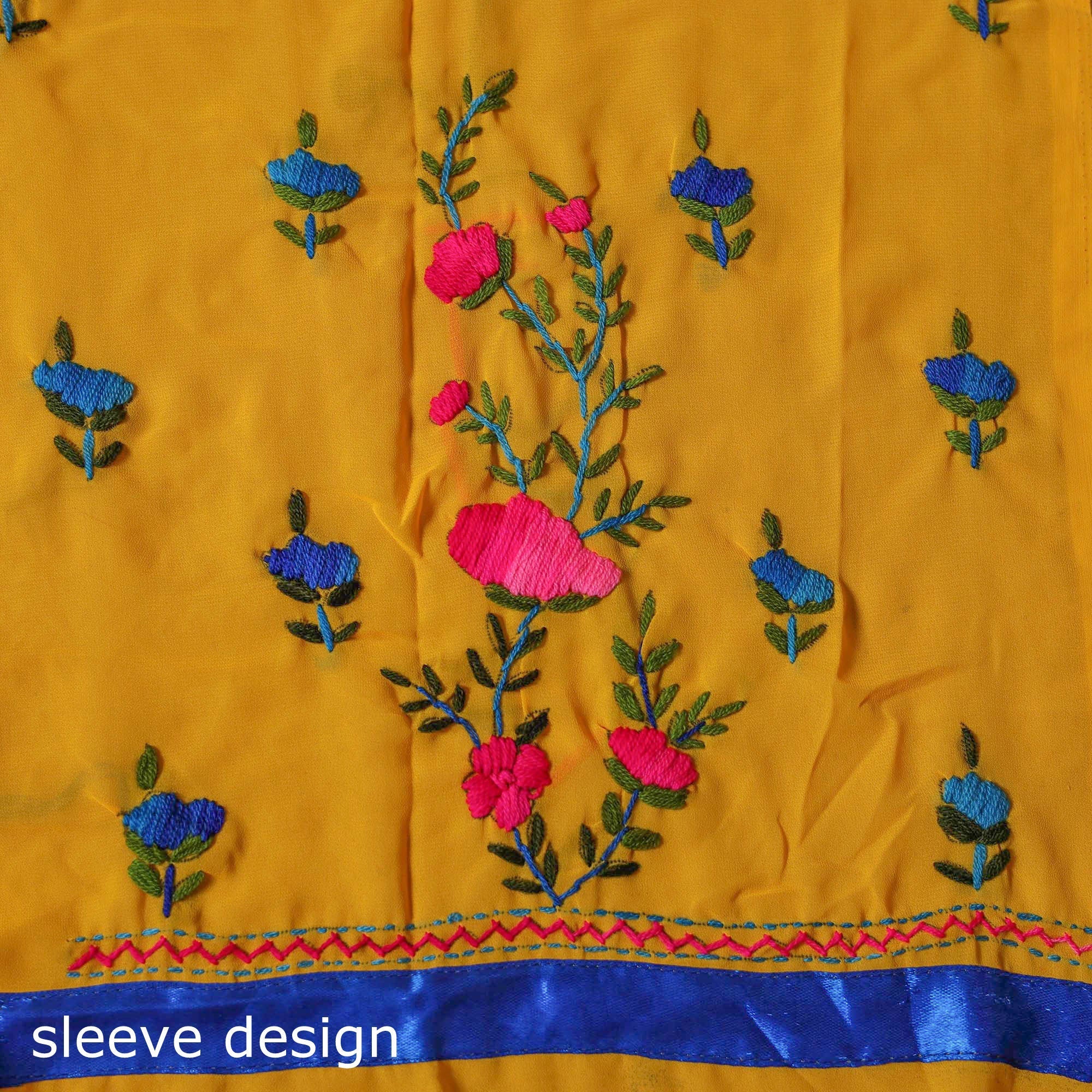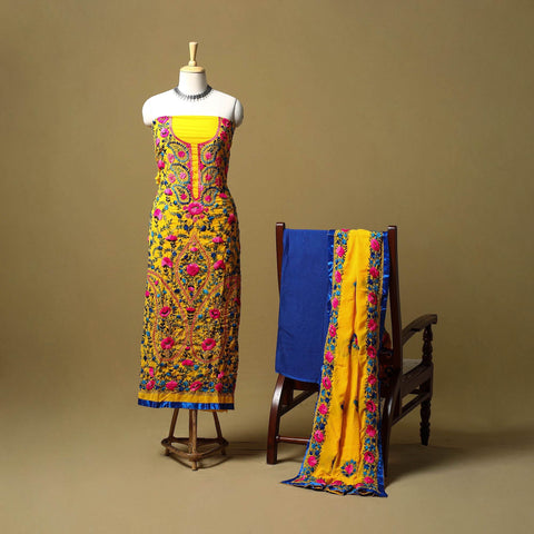 This yellow ranihati chapa work hand embroidered georgette 3pc suit material set includes a kurta, dupatta, and bottom. Each piece is beautifully hand-embroidered by skilled artisans, showcasing intricate designs and floral-inspired motifs. This suit material set allows you to unleash your creativity and craft a truly unique outfit.