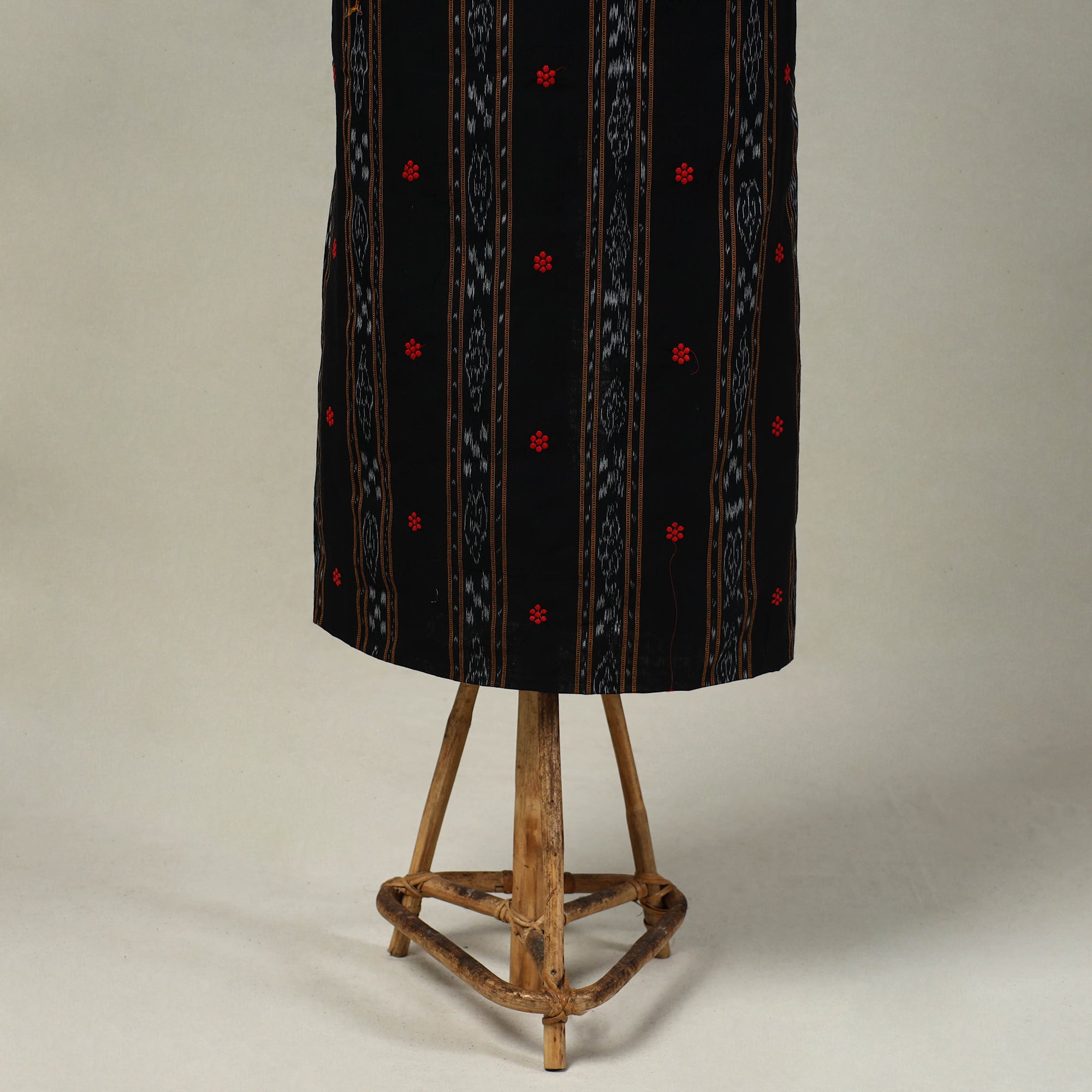 Step into tradition with this handloom cotton black Sambalpuri dress material. Featuring intricate Ikat weaving, this 3pc set includes a beautifully patterned kurta, a plain cotton bottom, and a complementary dupatta. The motifs, inspired by Odisha’s cultural heritage, showcase traditional symbols like shankha, chakra, and phula. Designed by skilled artisans, this set offers both elegance and comfort, making it a timeless addition to your wardrobe.