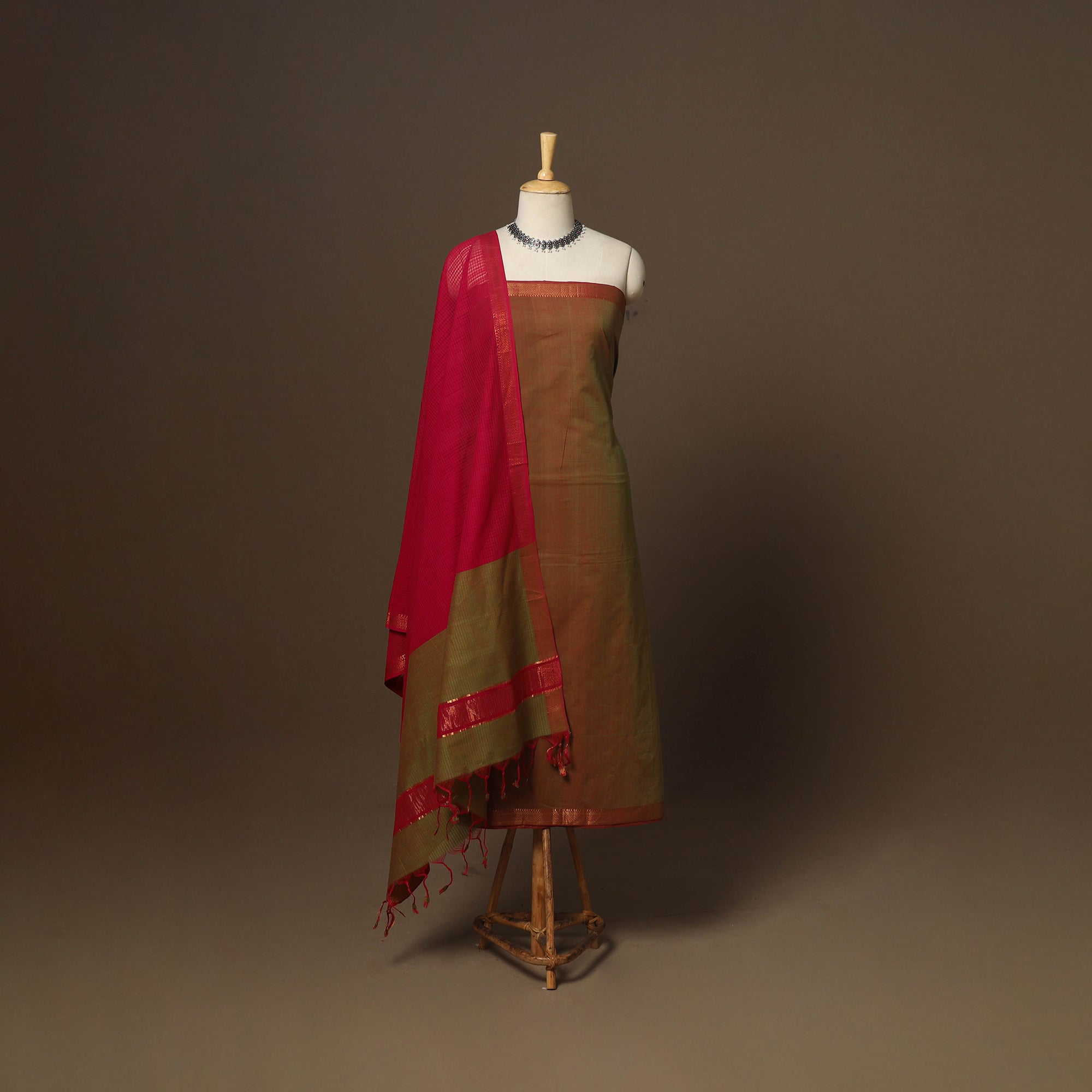 Brown 3pc handloom cotton mangalagiri dress material set from Andhra Pradesh. Woven using the traditional mangalagiri technique known for its fine texture and rich zari borders, this set beautifully blends simplicity with elegance. It includes a kurta, a matching plain bottom, and a missing checks dupatta. Perfect for festive occasions or effortless everyday styling.
