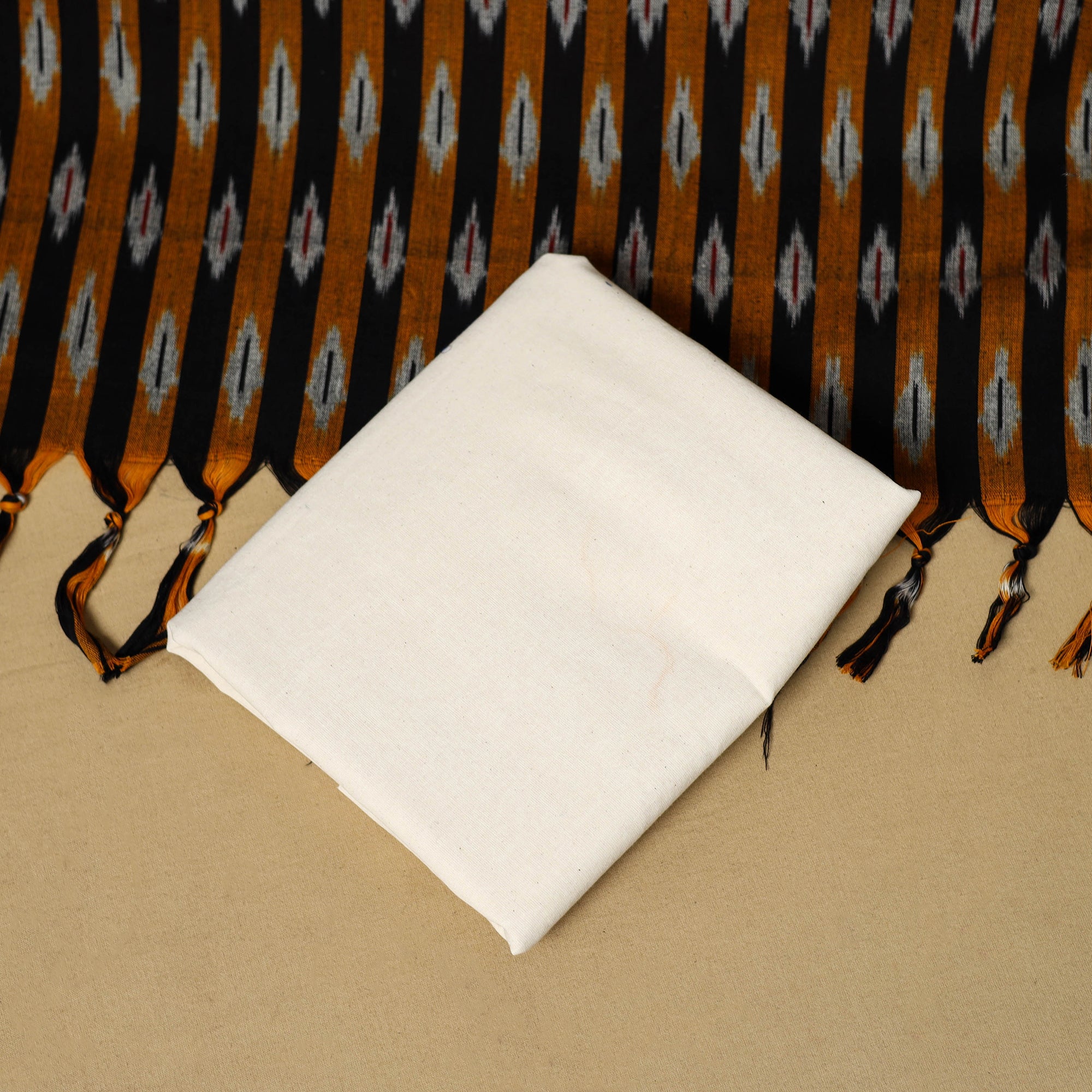 Black 3pc pochampally ikat cotton handloom dress material set from Telangana includes a kurta, dupatta and plain bottom. Made using the unique ikat technique where yarns are dyed before weaving, it features beautiful geometric patterns and vibrant colors. Perfect for weddings, parties or cultural gatherings this elegant set adds a touch of traditional charm to your wardrobe.