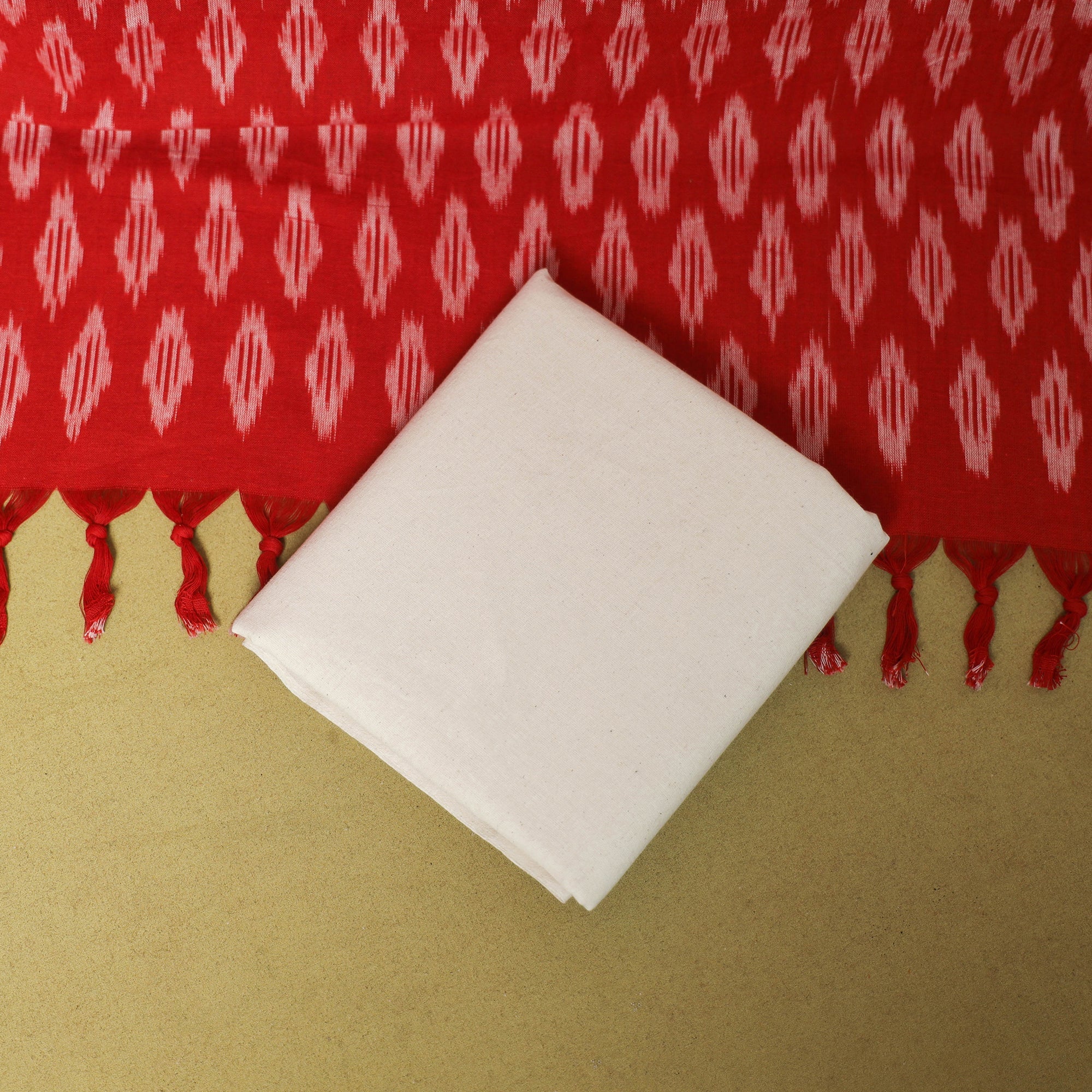 Embrace the beauty of this red 3pc pochampally Ikat cotton handloom dress material set from Telangana. The set includes a kurta/top, dupatta, and plain bottom piece. Ikat is a distinctive weaving technique where the yarns are dyed before weaving, resulting in striking geometric patterns. The vibrant colors combined with this traditional weaving style make every piece truly unique. Whether for a wedding, a party, or a cultural gathering, this dress material is a timeless choice.