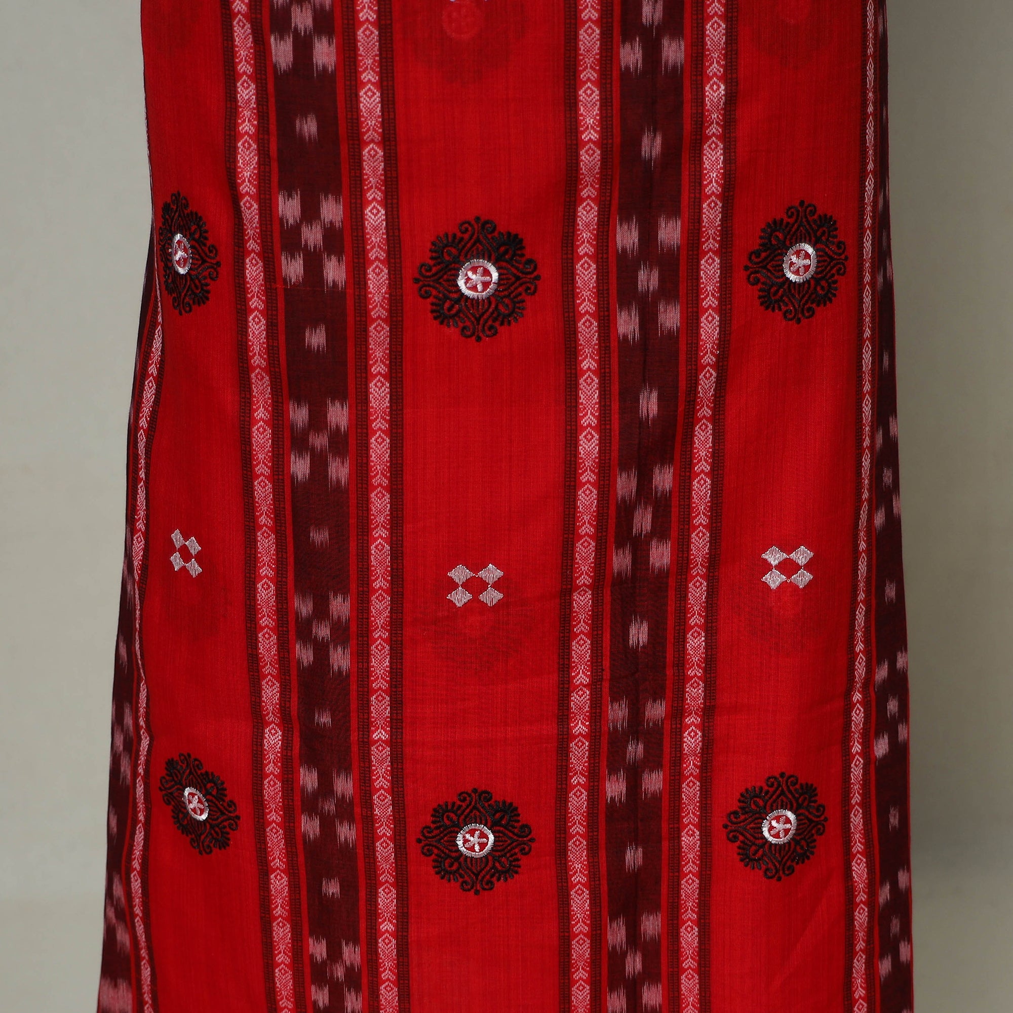 This red 3pc sambalpuri dress material set is crafted using the traditional ikat weaving technique by skilled artisans of Odisha. The cotton fabric features iconic motifs like shankha, chakra, and phula, showcasing the rich cultural heritage of sambalpuri textiles. The set includes fabric for the kurta, a plain bottom, and a dupatta, all handwoven to ensure a unique texture, vibrant colours, and lasting quality.