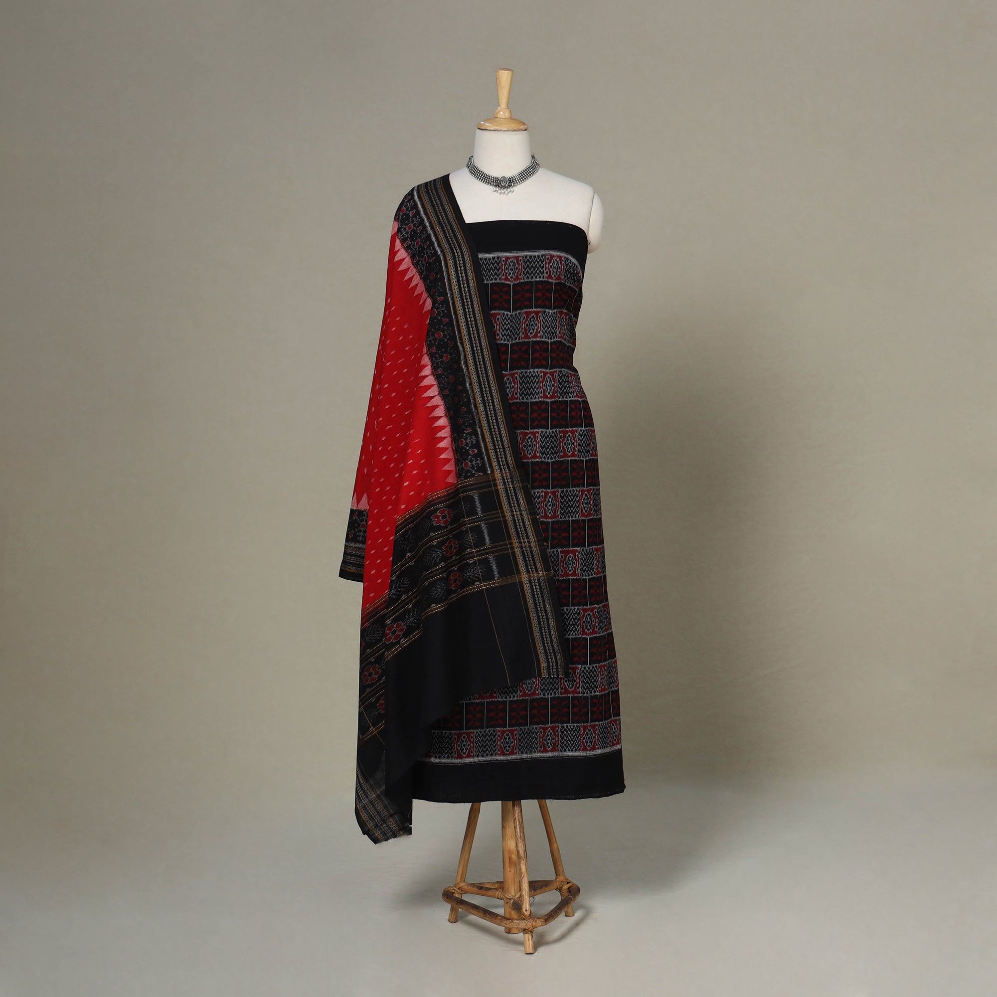 Experience the heritage of Odisha with our exquisite black sambalpuri Ikat weaving handloom cotton dress material set. This set includes a kurta, a dupatta with plain matching bottom, featuring traditional motifs like shankha (shell), chakra (wheel), and phula (flower) meticulously crafted by master artisans from the eastern states. Made from fine quality cotton, this dress material set is a perfect blend of comfort and style, showcasing the beauty of Ikat weaving.
