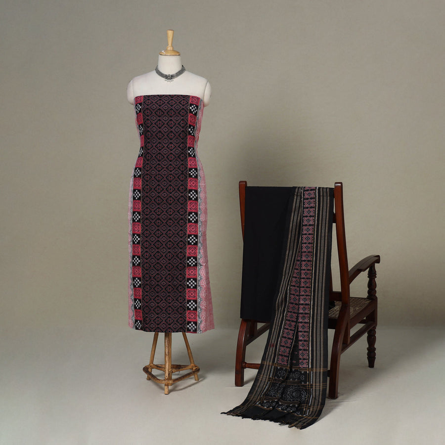 Experience the heritage of Odisha with our exquisite black sambalpuri Ikat weaving handloom cotton dress material set. This set includes a kurta, a dupatta with plain matching bottom, featuring traditional motifs like shankha (shell), chakra (wheel), and phula (flower) meticulously crafted by master artisans from the eastern states. Made from fine quality cotton, this dress material set is a perfect blend of comfort and style, showcasing the beauty of Ikat weaving.