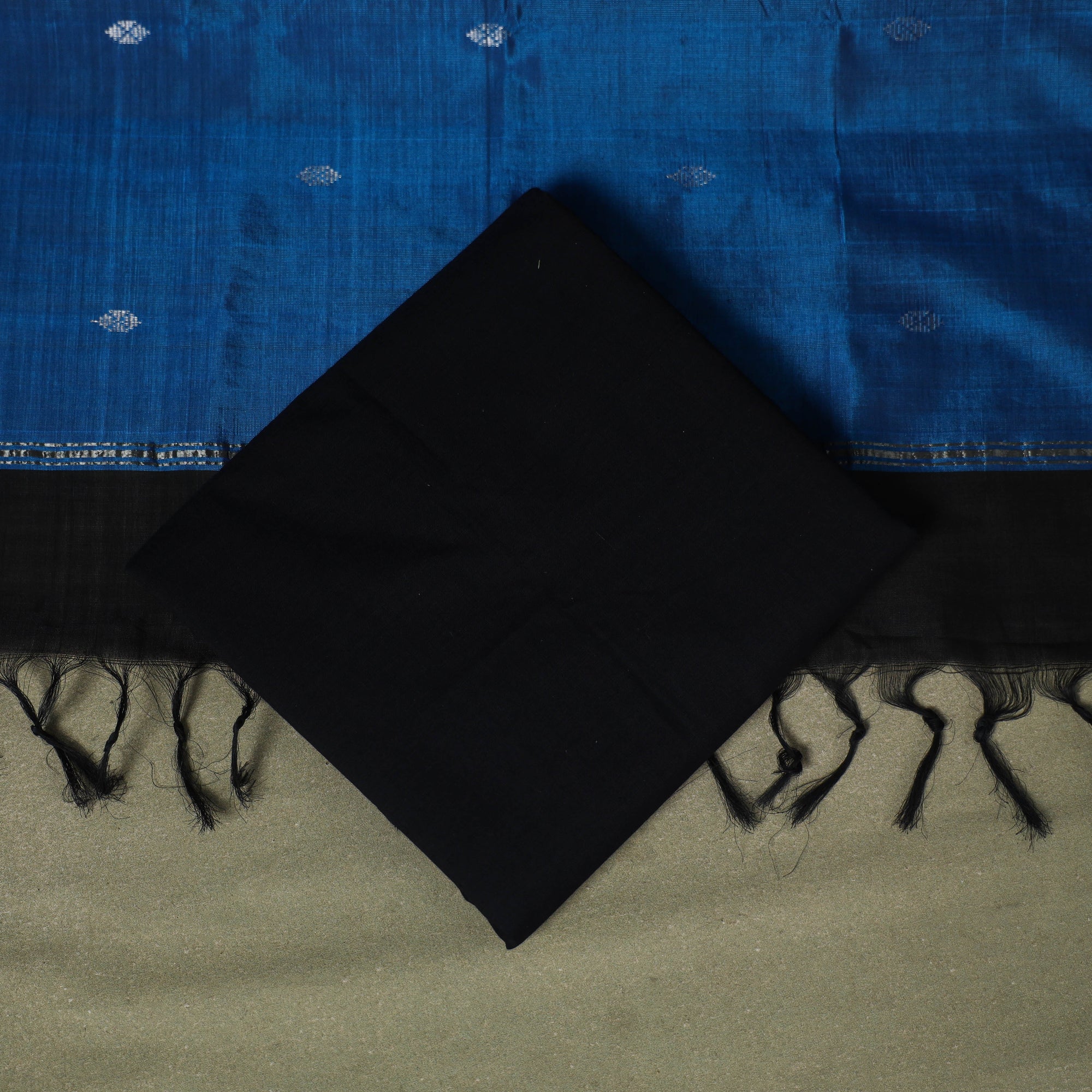 Add classic charm to your ethnic wardrobe with this blue 3pc handloom silk cotton mangalagiri dress material set from Andhra Pradesh. The kurta and dupatta feature an and zari buti and border, paired with a matching plain cotton bottom. The dupatta also includes delicate tassels for added flair. Known for its durability and elegant finish, this set is perfect for festive occasions or everyday styling.
