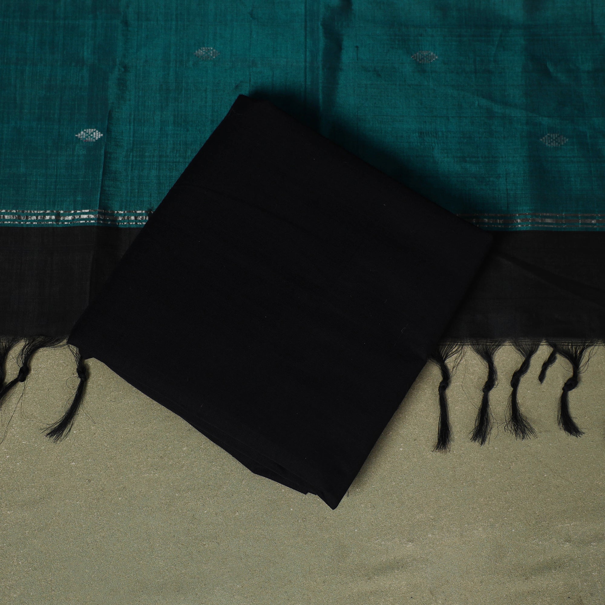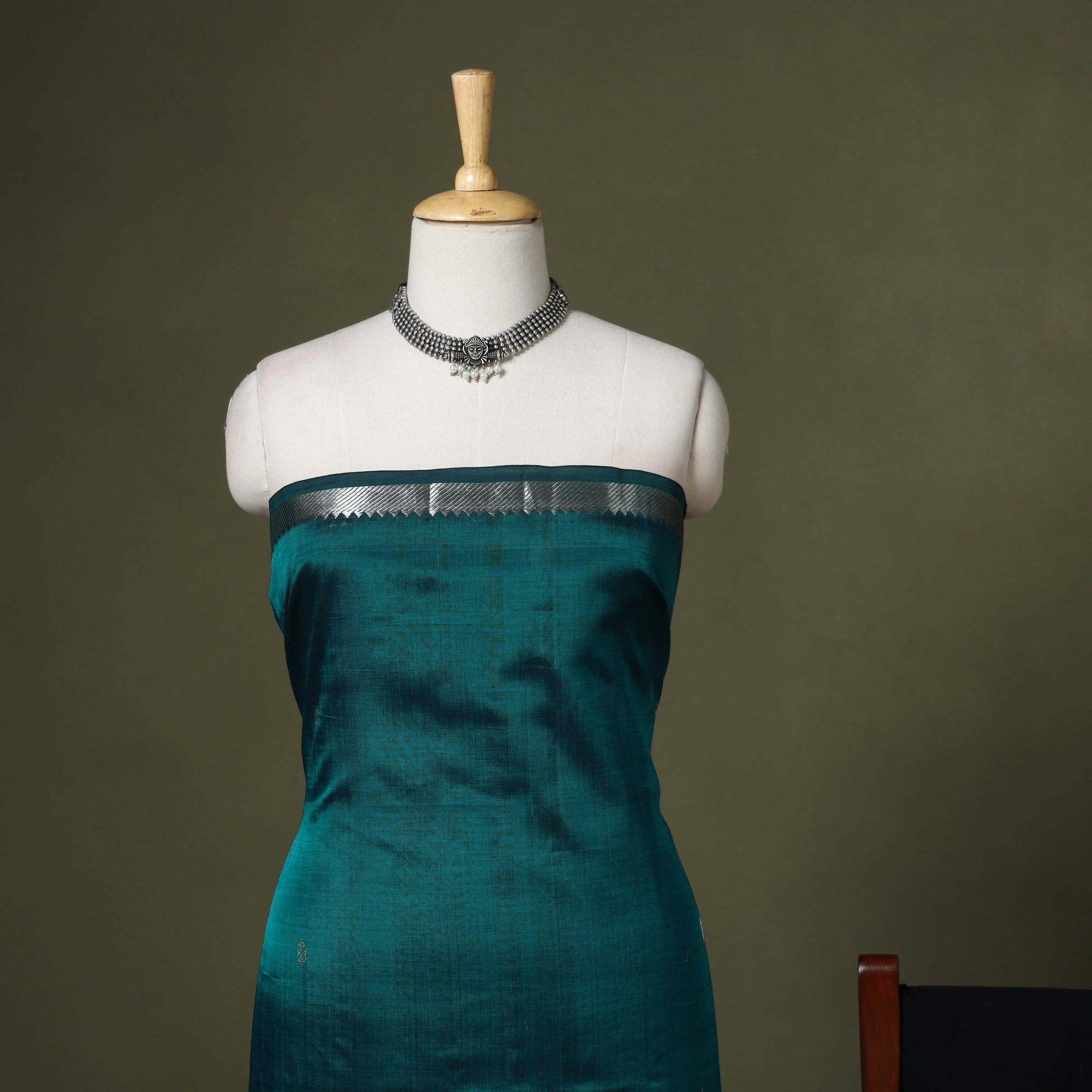 Add classic charm to your ethnic wardrobe with this green 3pc handloom silk cotton mangalagiri dress material set from Andhra Pradesh. The kurta and dupatta feature an and zari buti and border, paired with a matching plain cotton bottom. The dupatta also includes delicate tassels for added flair. Known for its durability and elegant finish, this set is perfect for festive occasions or everyday styling.