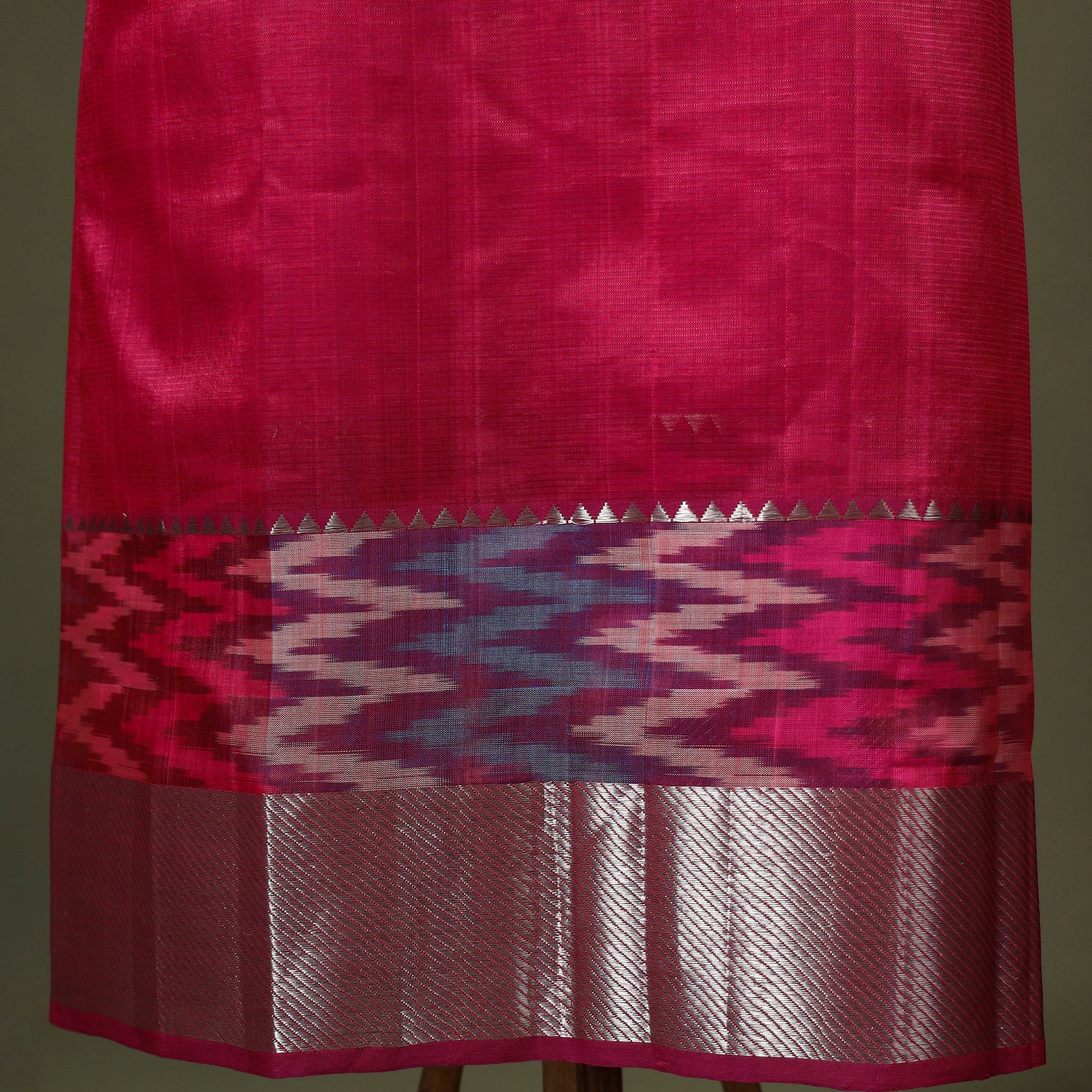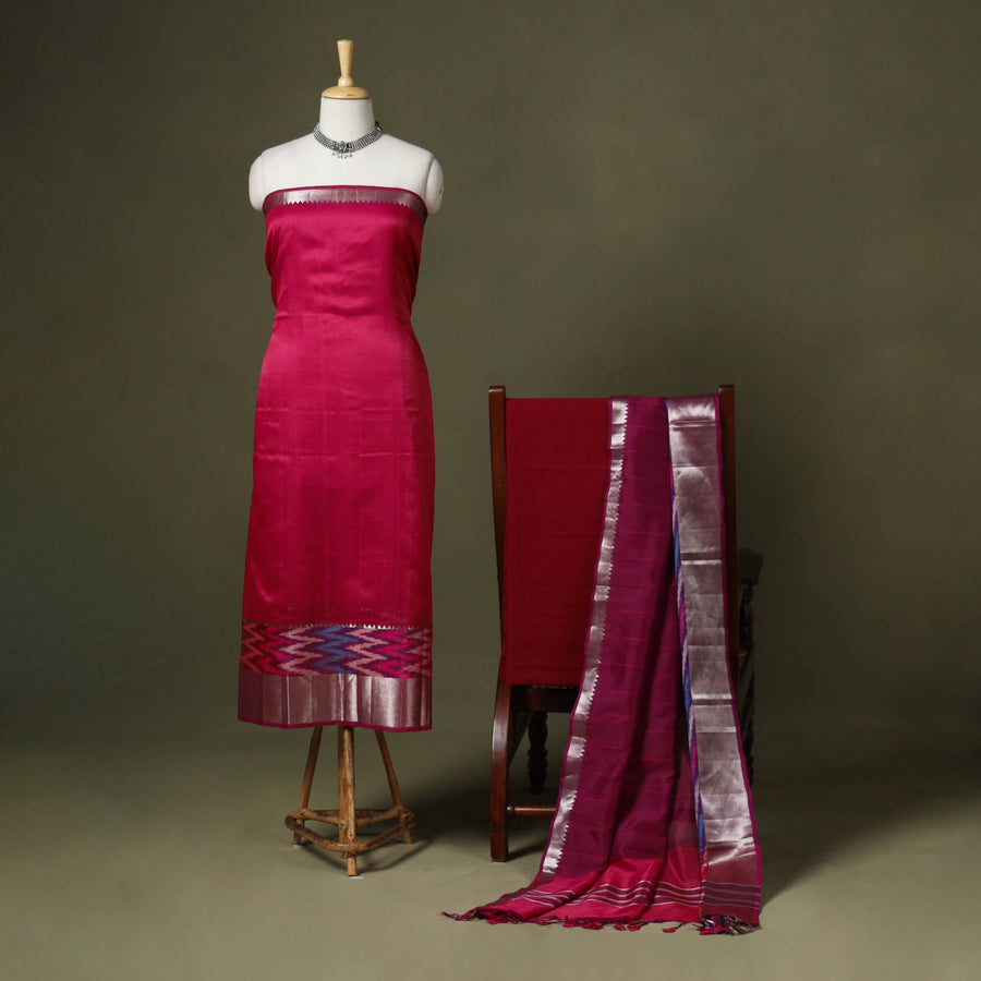 Add classic charm to your ethnic wardrobe with this pink 3pc handloom silk cotton mangalagiri dress material set from Andhra Pradesh. The kurta and dupatta feature an ikat and zari border, paired with a matching plain cotton bottom. The dupatta also includes delicate tassels for added flair. Known for its durability and elegant finish, this set is perfect for festive occasions or everyday styling.