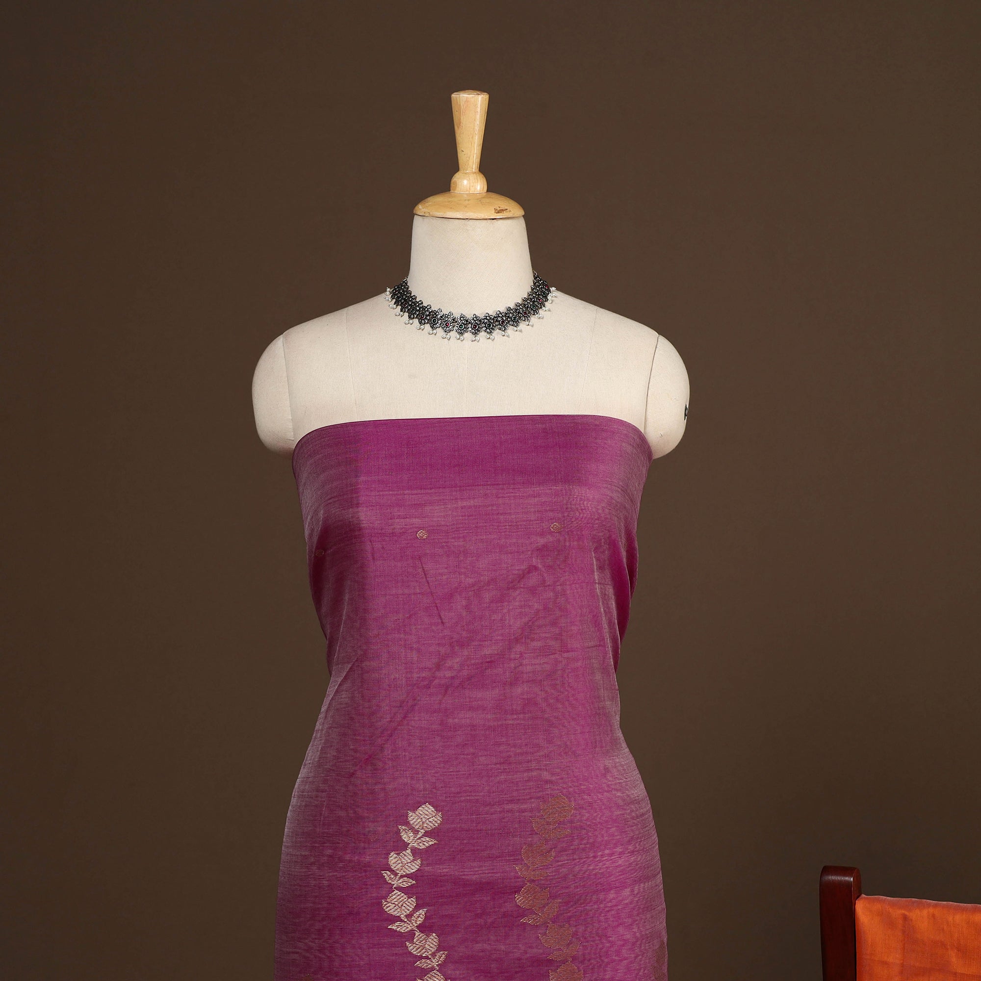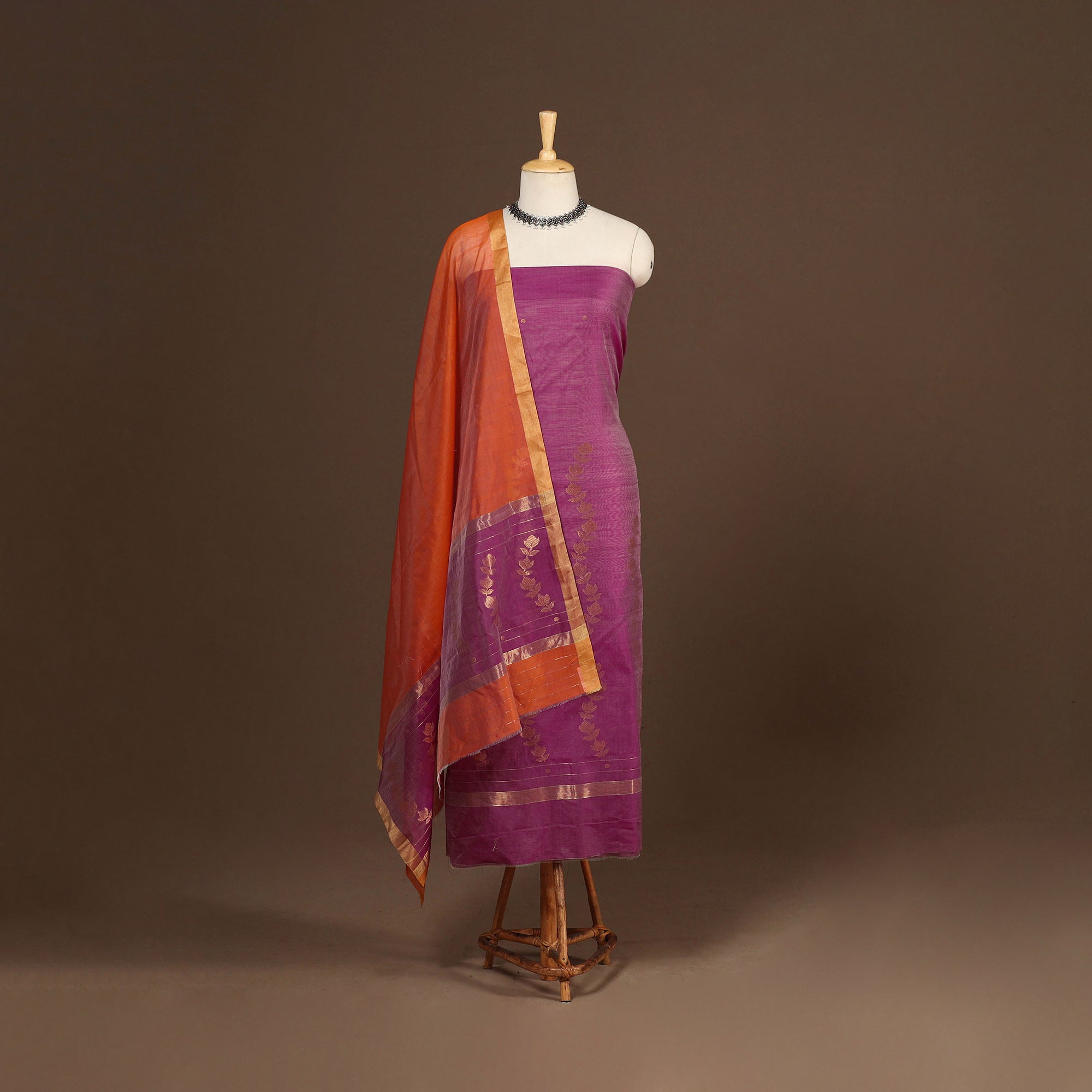 This elegant zari work pink chanderi silk 3pc dress material set is handwoven by master artisan Rauph Khan in the town of Chanderi, Madhya Pradesh. Made from a blend of chanderi silk and mercerised cotton, it features a lightweight, sheer drape with a refined finish, making it perfect for both festive occasions and everyday sophistication. The set includes a kurta, dupatta, and bottom.