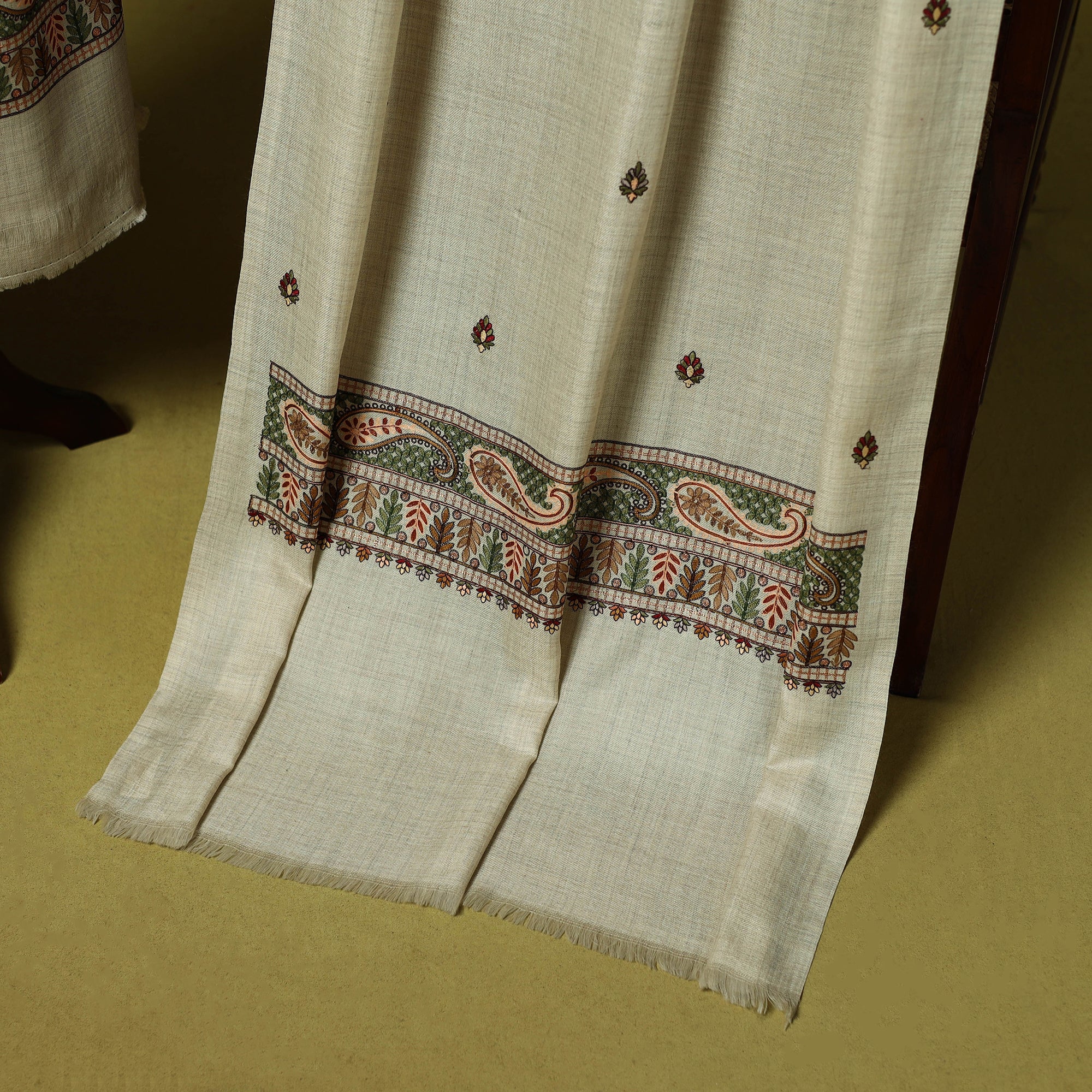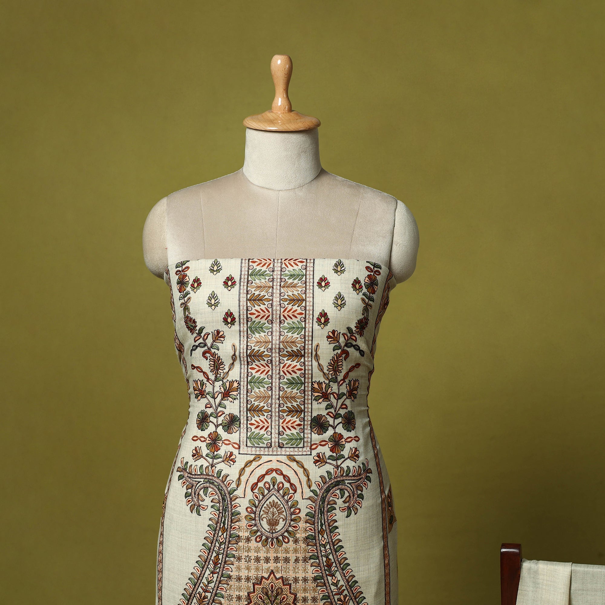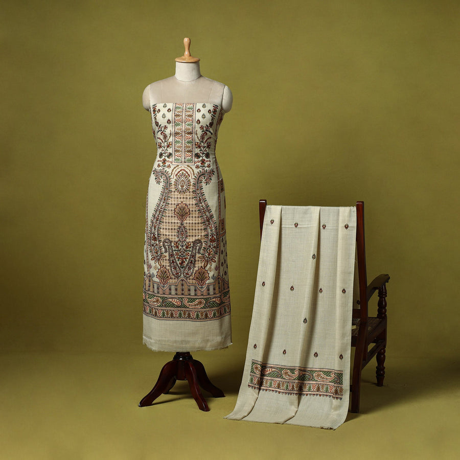 Beige 3pc heavy chain stitch embroidered merino wool unstitched dress material is perfect for elegant winter wear. Made from fine merino wool, it offers warmth, comfort and a rich texture. The set includes fabric for the top, bottom and dupatta is beautifully detailed with intricate embroidery. Ideal for stitching into stylish suits for casual or festive occasions, it’s a graceful and cozy choice for the winter season.