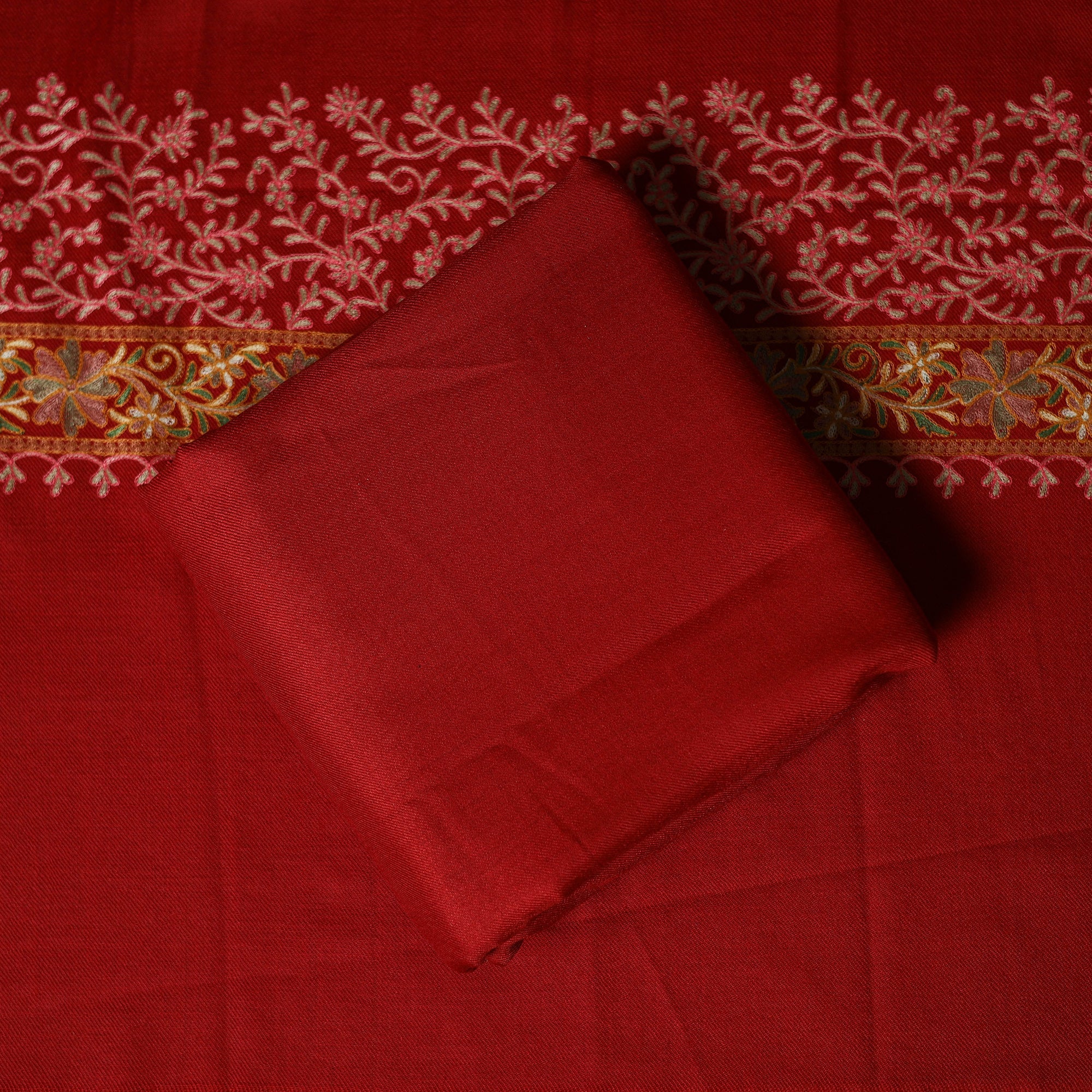 Red 3pc heavy chain stitch embroidered merino wool unstitched dress material is perfect for elegant winter wear. Made from fine merino wool, it offers warmth, comfort and a rich texture. The set includes fabric for the top, bottom and dupatta is beautifully detailed with intricate embroidery. Ideal for stitching into stylish suits for casual or festive occasions, it’s a graceful and cozy choice for the winter season.