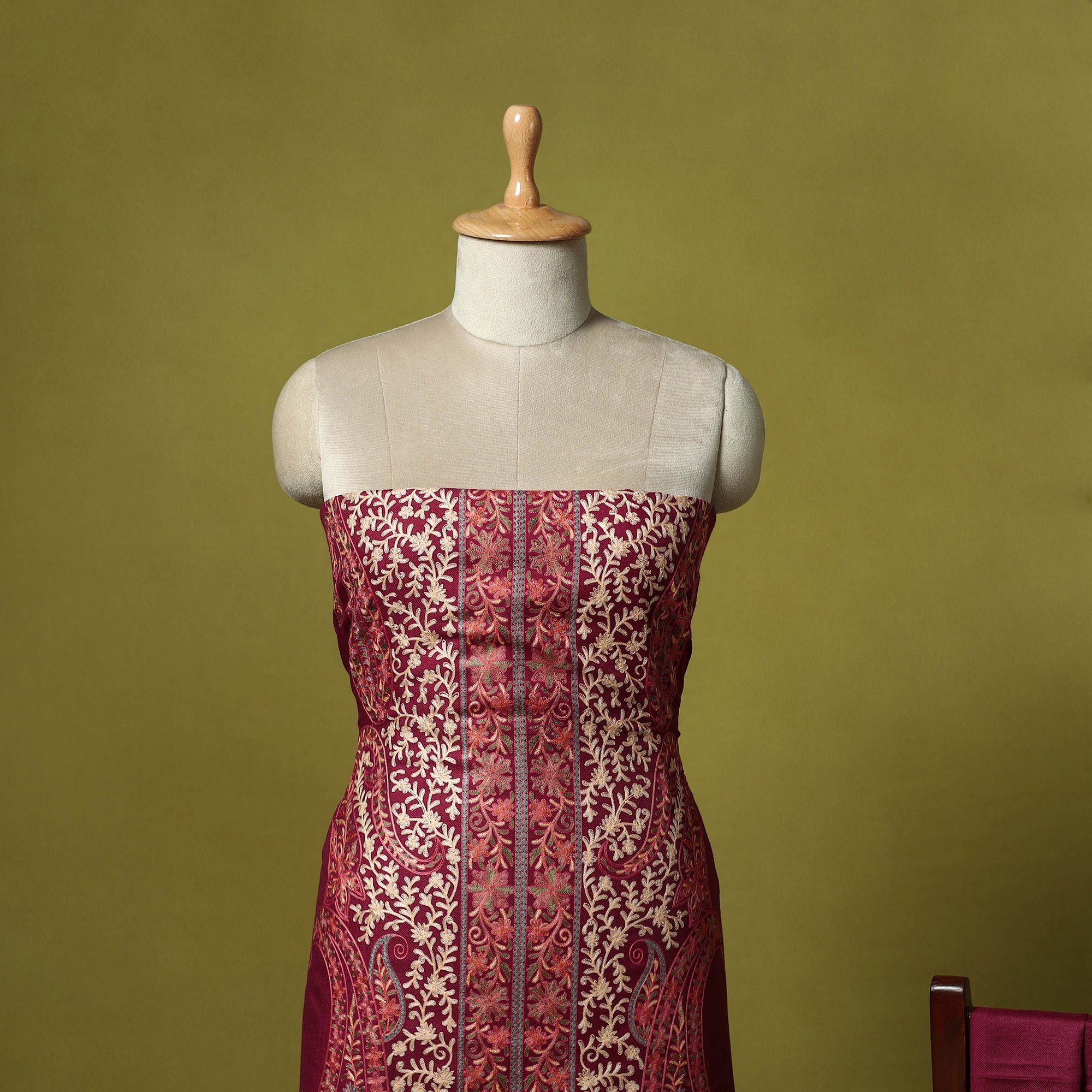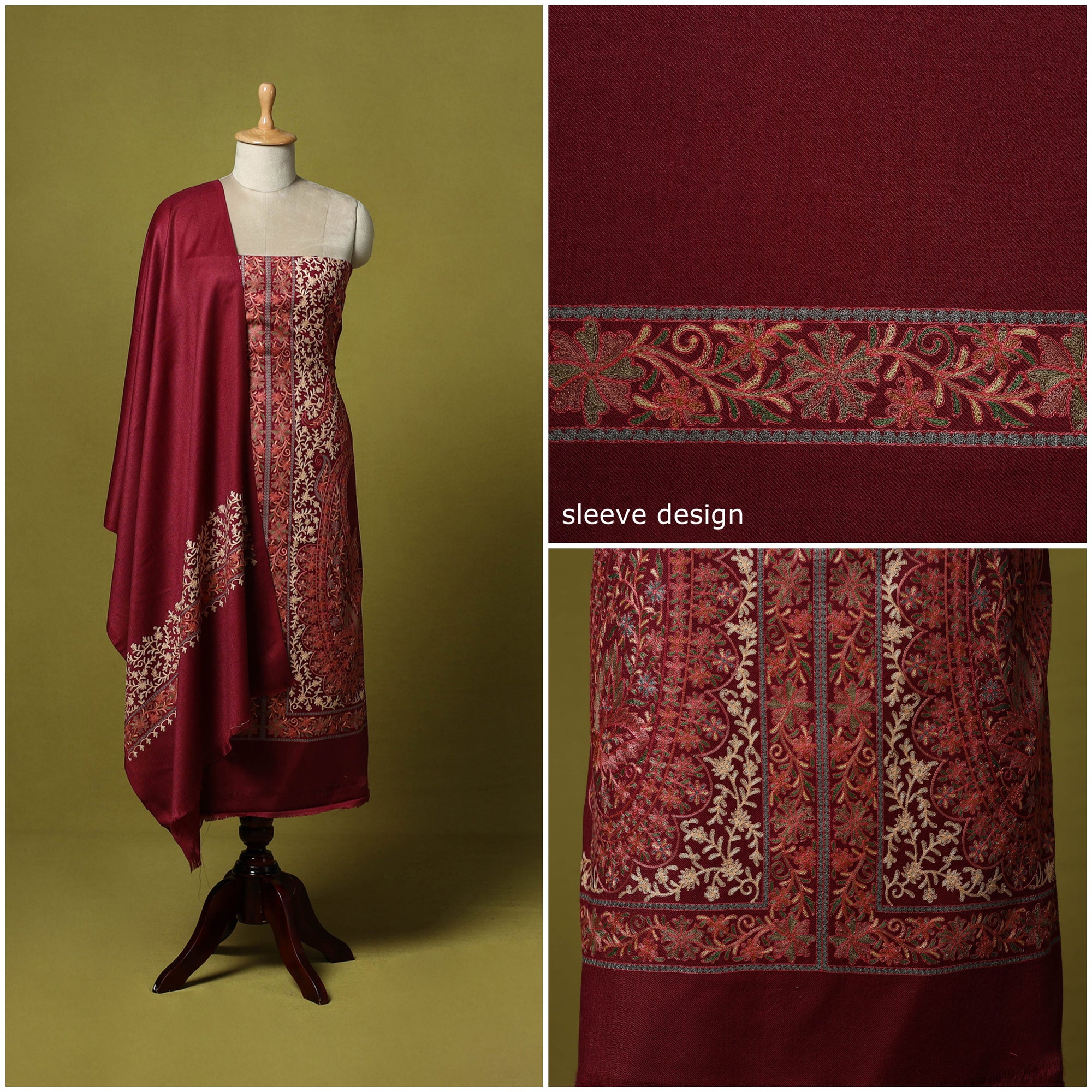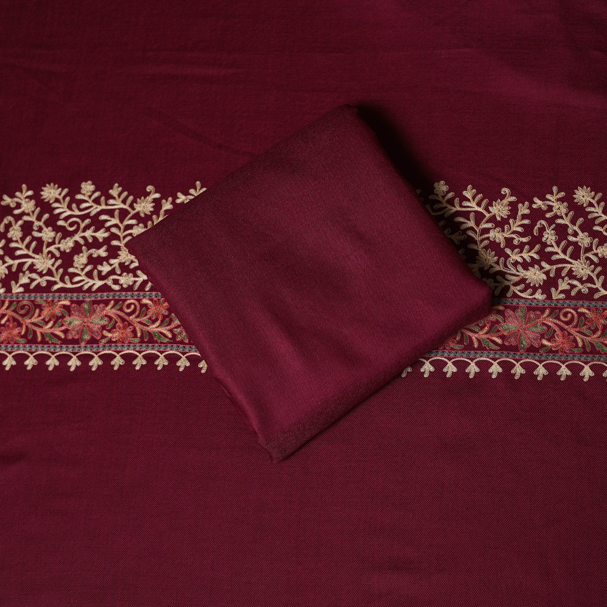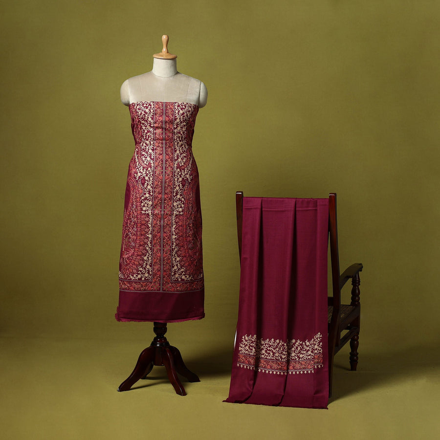 Maroon 3pc heavy chain stitch embroidered merino wool unstitched dress material is perfect for elegant winter wear. Made from fine merino wool, it offers warmth, comfort and a rich texture. The set includes fabric for the top, bottom and dupatta is beautifully detailed with intricate embroidery. Ideal for stitching into stylish suits for casual or festive occasions, it’s a graceful and cozy choice for the winter season.
