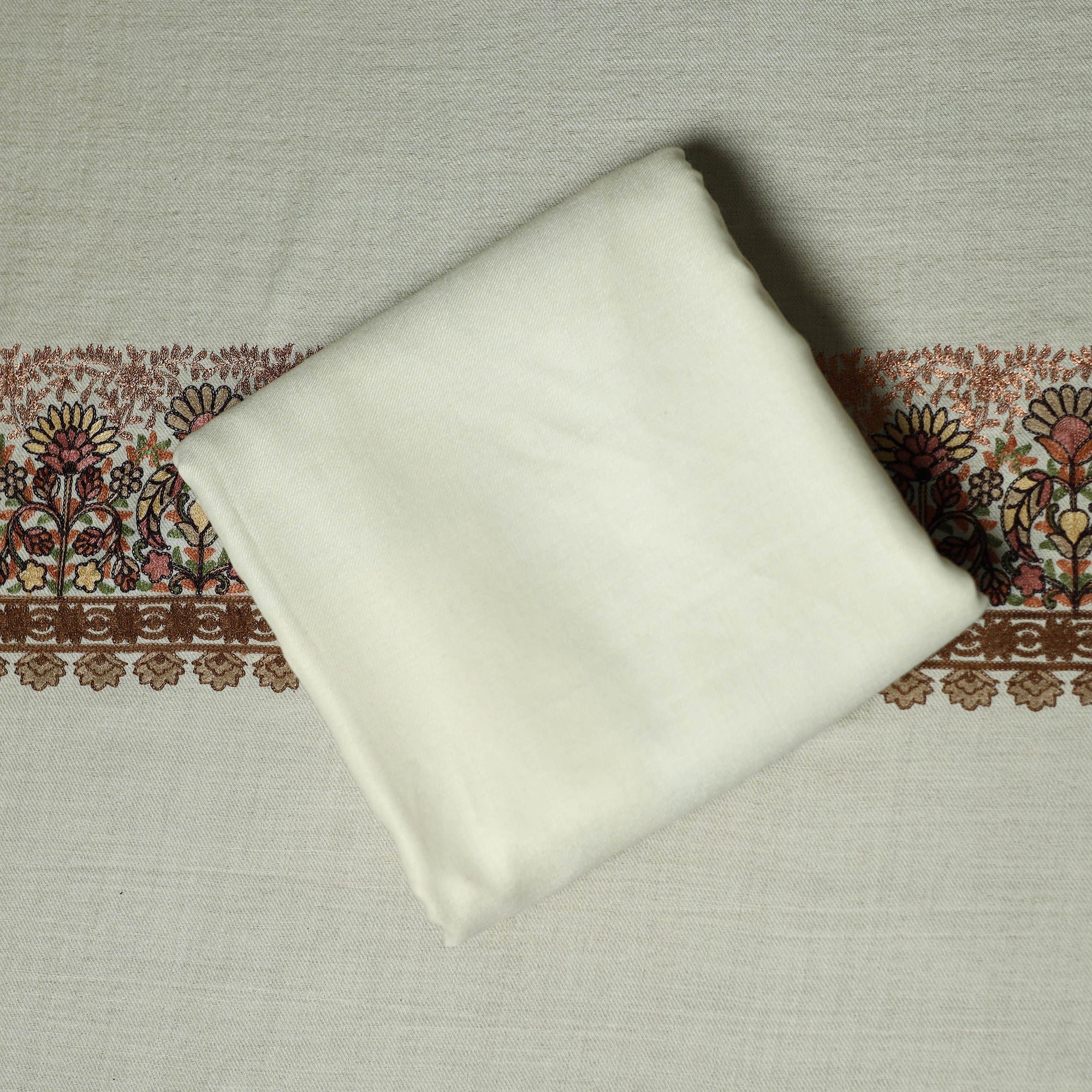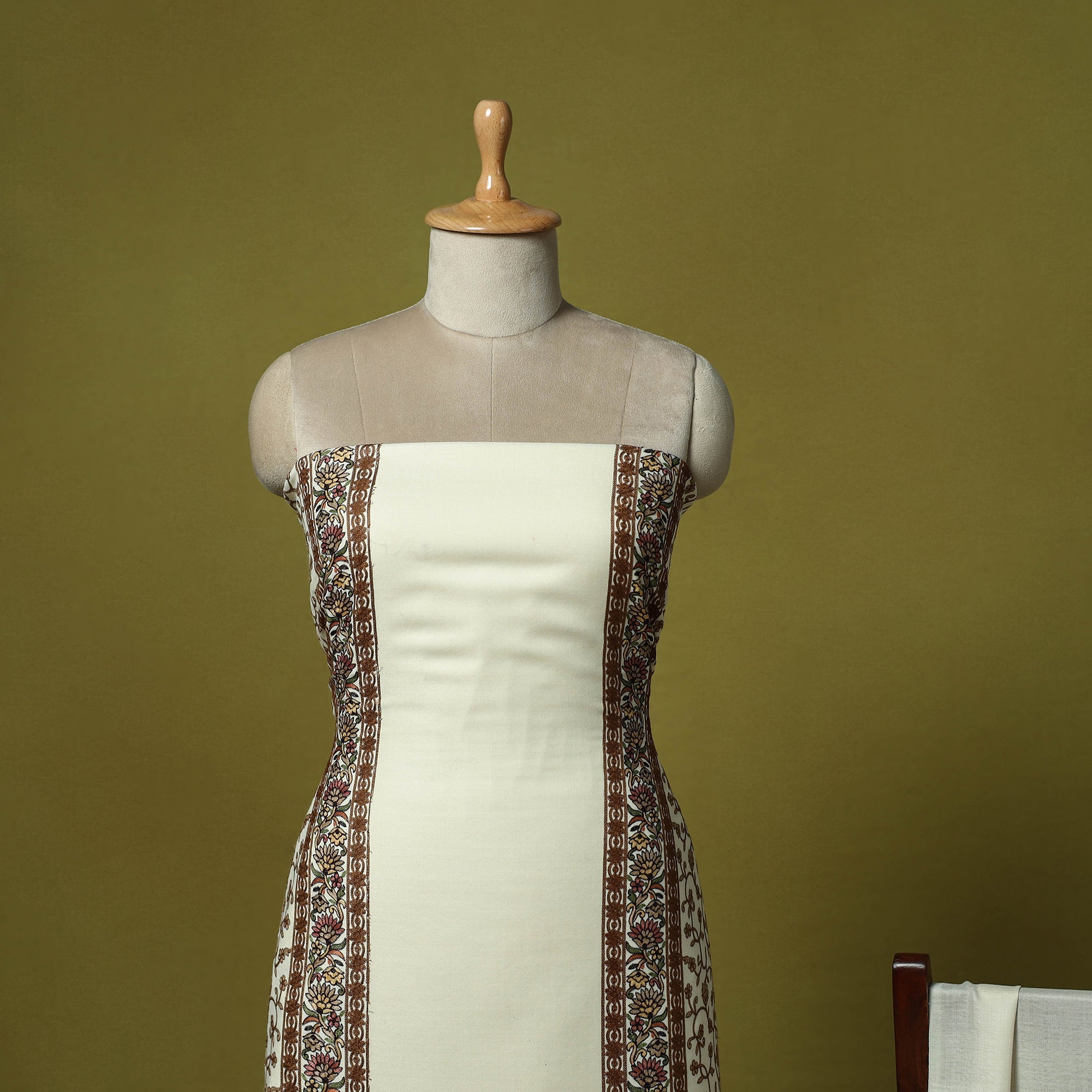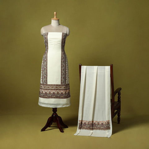White 3pc heavy chain stitch embroidered merino wool unstitched dress material is perfect for elegant winter wear. Made from fine merino wool, it offers warmth, comfort and a rich texture. The set includes fabric for the top, bottom and dupatta is beautifully detailed with intricate embroidery. Ideal for stitching into stylish suits for casual or festive occasions, it’s a graceful and cozy choice for the winter season.