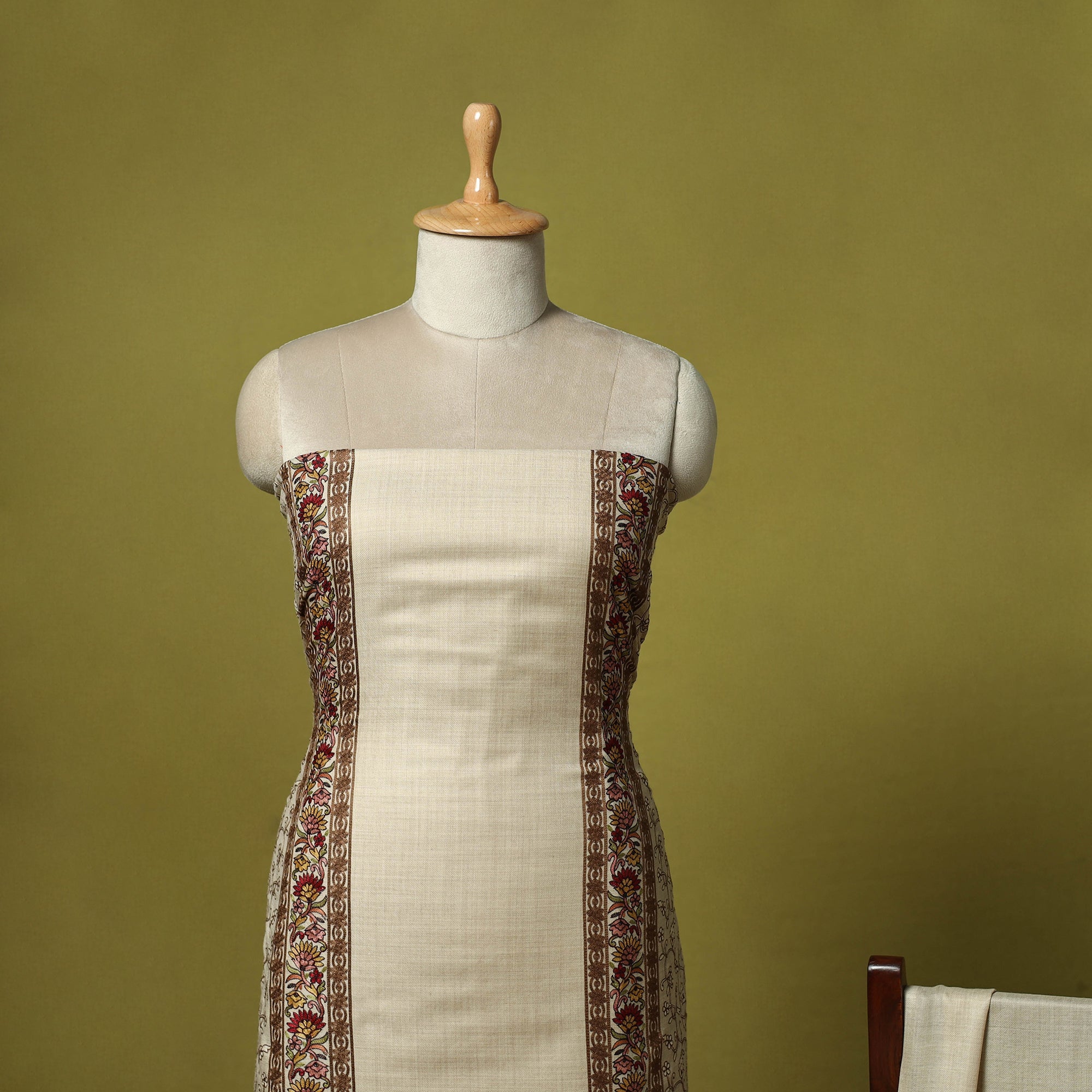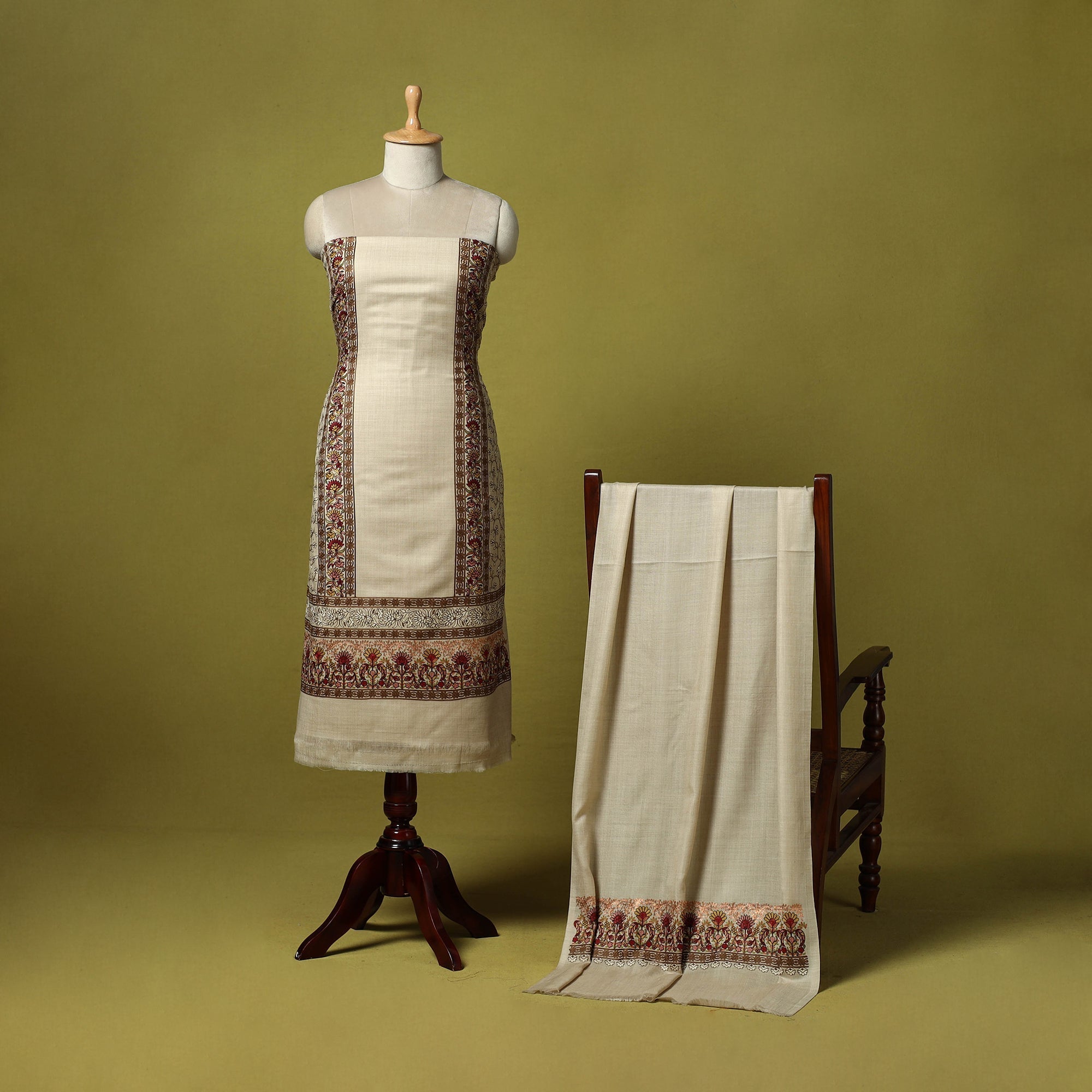 Beige 3pc heavy chain stitch embroidered merino wool unstitched dress material is perfect for elegant winter wear. Made from fine merino wool, it offers warmth, comfort and a rich texture. The set includes fabric for the top, bottom and dupatta is beautifully detailed with intricate embroidery. Ideal for stitching into stylish suits for casual or festive occasions, it’s a graceful and cozy choice for the winter season.