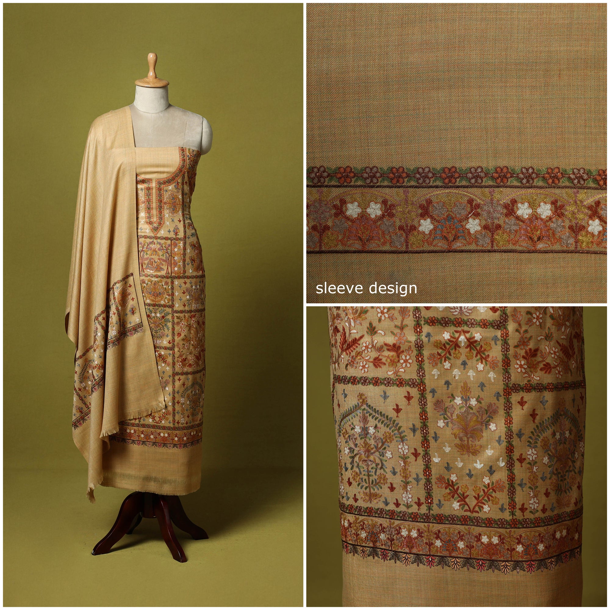 Beige 3pc heavy chain stitch embroidered merino wool unstitched dress material is perfect for elegant winter wear. Made from fine merino wool, it offers warmth, comfort and a rich texture. The set includes fabric for the top, bottom and dupatta is beautifully detailed with intricate embroidery. Ideal for stitching into stylish suits for casual or festive occasions, it’s a graceful and cozy choice for the winter season.