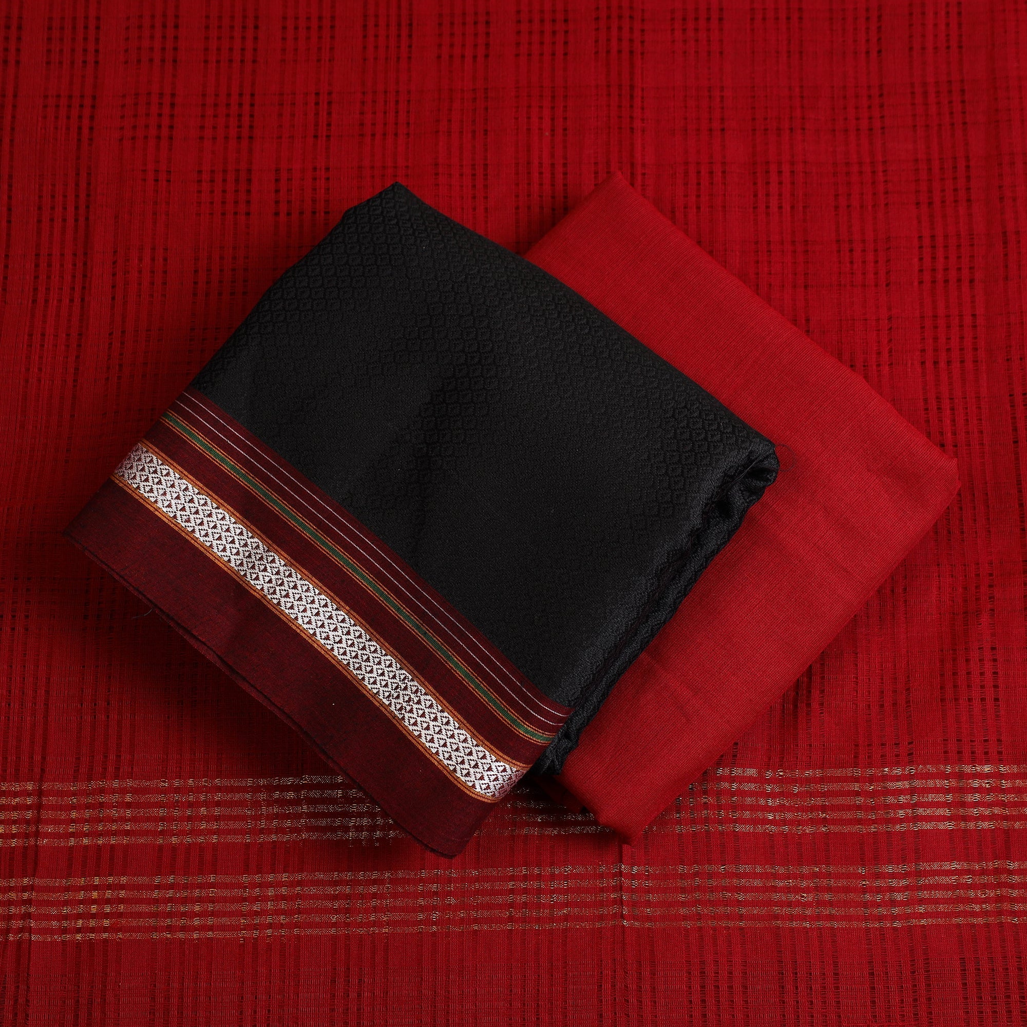 Upgrade your wardrobe with this 3pc cotton black khun dress material, a creation by skilled Karnataka weavers. It features a vibrant khun kurta fabric with a luxurious texture and soft luster, teamed with a missing checks patterned cotton dupatta bordered with zari, and a plain cotton bottom. A lovely choice for festive occasions and stylish daily wear.