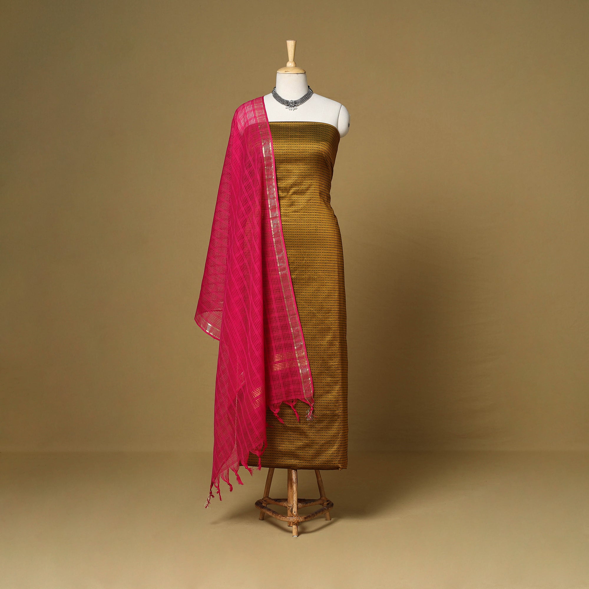 Elevate your ethnic look with this vibrant brown khun dress material, woven by skilled weavers of Karnataka. This 3-piece cotton set includes a lustrous khun kurta fabric, a dupatta featuring a missing check pattern with a zari border, and a plain bottom. Celebrated for its bold colours and rich texture, Khun fabric is a distinctive choice for both festive occasions and everyday wear.