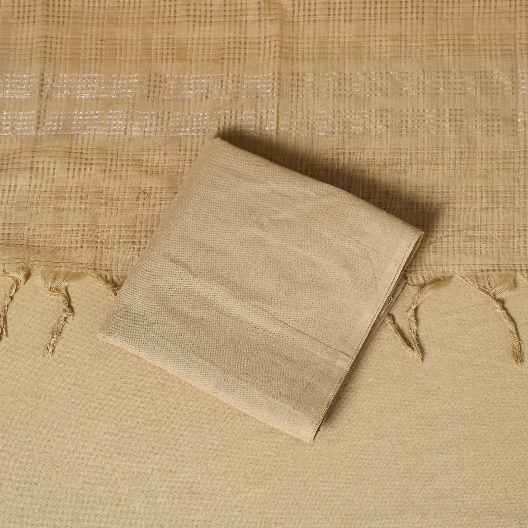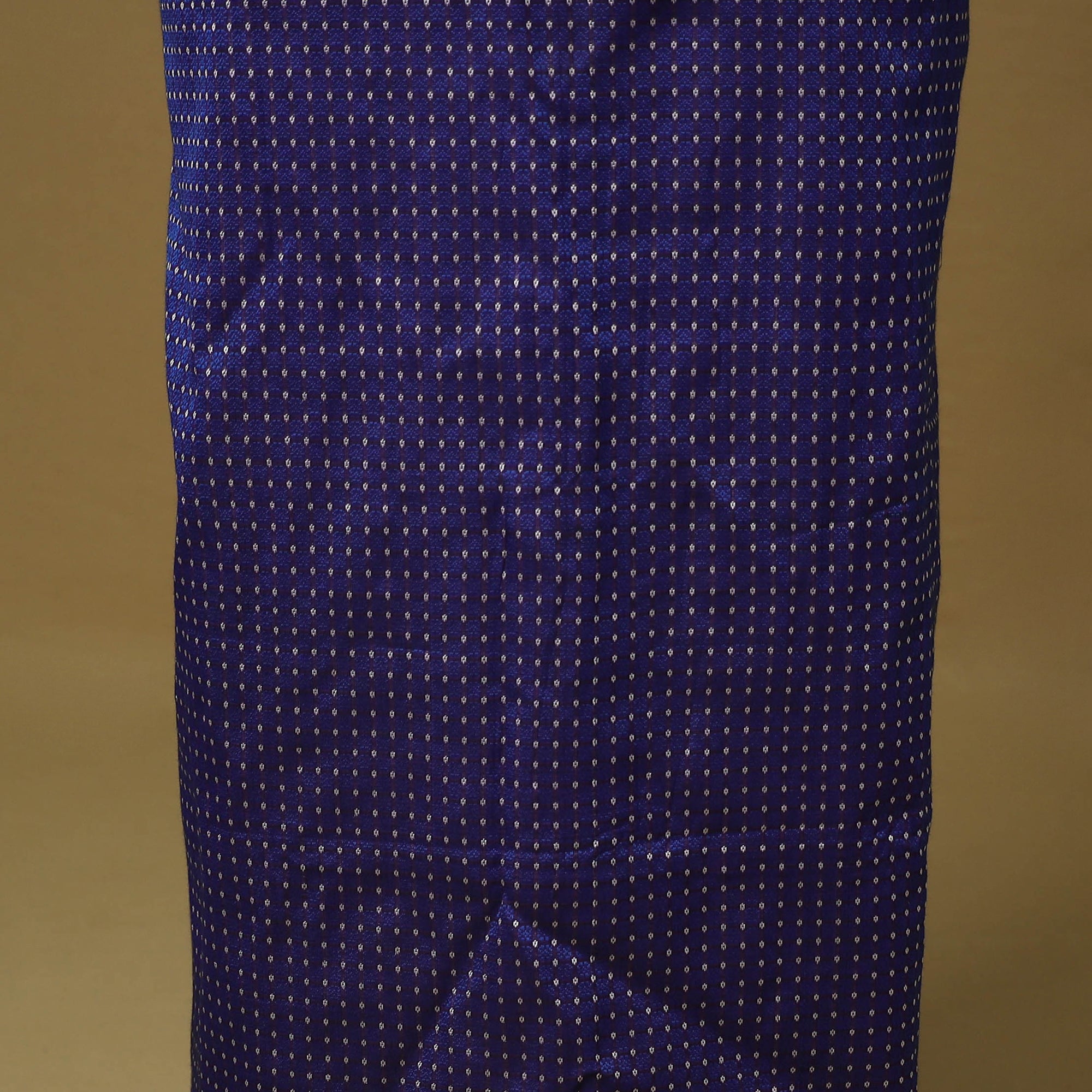 Elevate your ethnic look with this vibrant blue khun dress material, woven by skilled weavers from Karnataka. This 3pc cotton set includes a shiny khun kurta fabric, a cotton dupatta with a missing checks pattern and zari border, and a plain cotton bottom. Known for its bold colours and rich texture, khun fabric is a unique choice for both special outings and everyday wear.