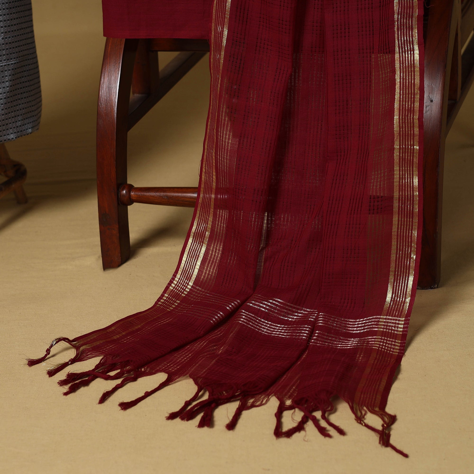 Khun is woven exclusively on a loom in Guledagudd, Bagalkot region, Karnataka. Used only for sari blouses, this handmade fabric is easily recognizable by its small white intricate motif and distinctive reddish-purple border.
