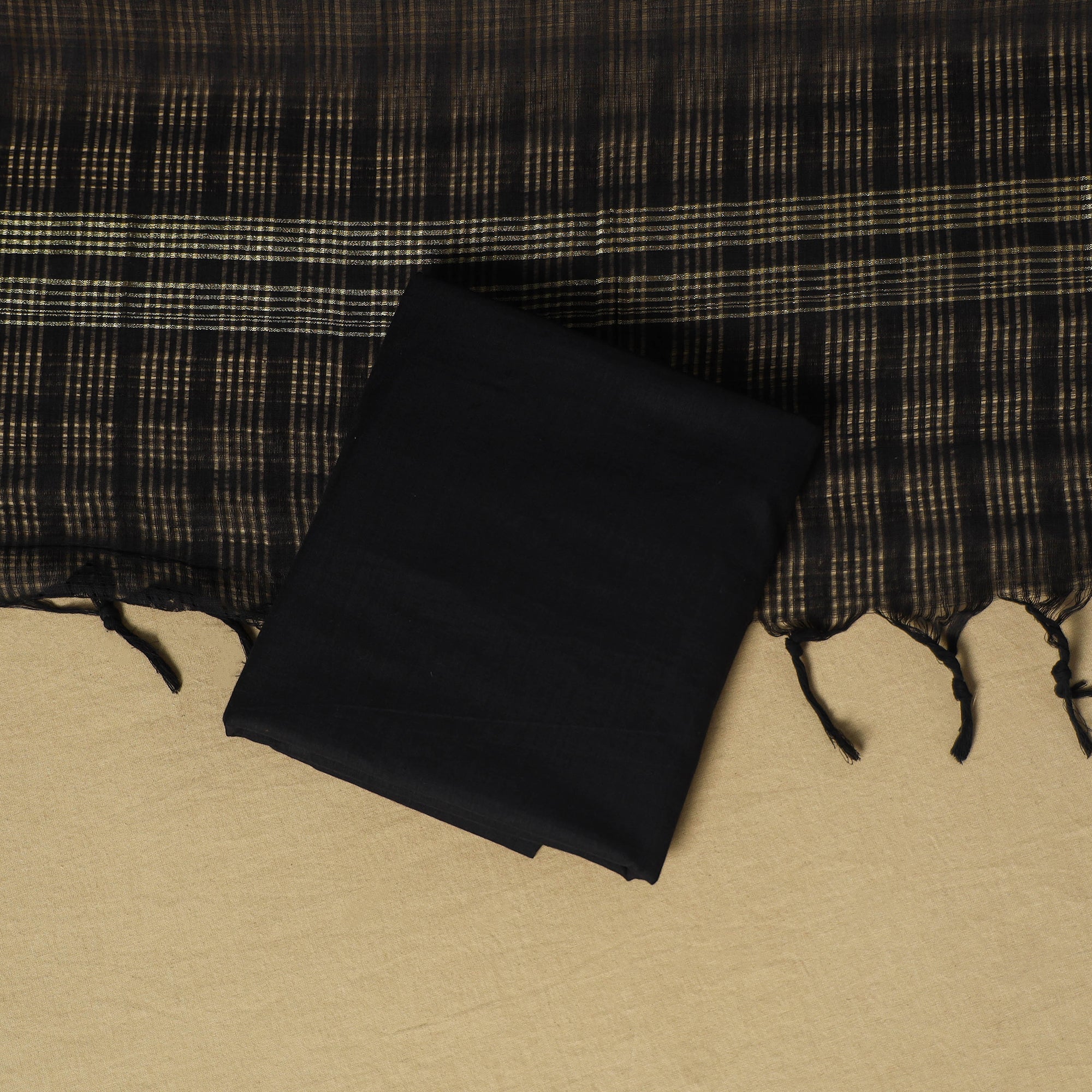 Elevate your ethnic look with this vibrant green khun dress material, woven by skilled weavers from Karnataka. This 3pc cotton set includes a shiny khun kurta fabric, a cotton dupatta with a missing checks pattern and zari border, and a plain cotton bottom. Known for its bold colours and rich texture, khun fabric is a unique choice for both special outings and everyday wear.