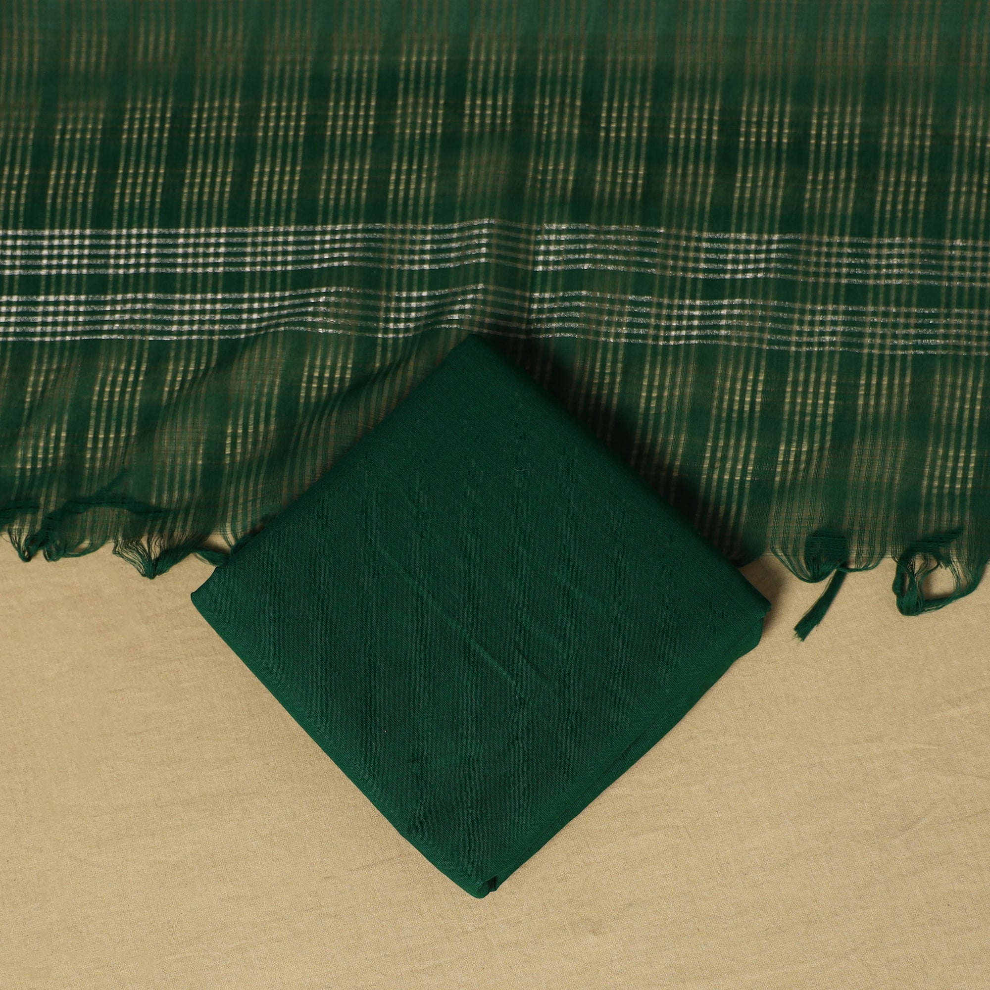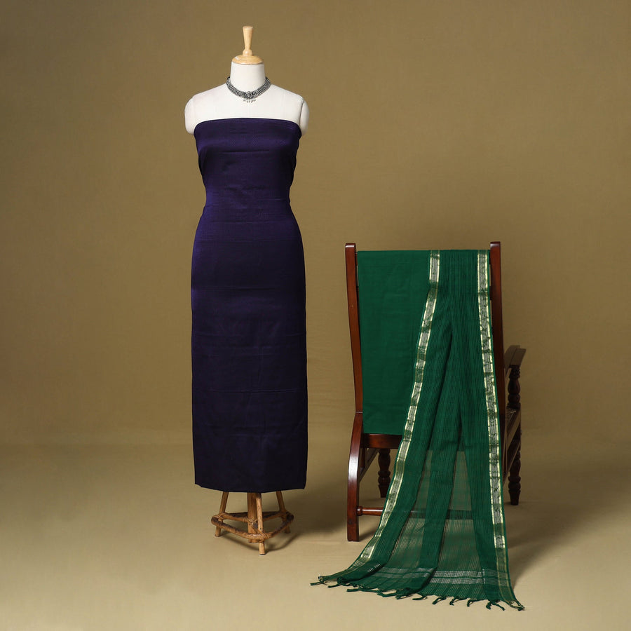 Elevate your ethnic look with this vibrant blue khun dress material, woven by skilled weavers from Karnataka. This 3pc cotton set includes a shiny khun kurta fabric, a cotton dupatta with a missing checks pattern and zari border, and a plain cotton bottom. Known for its bold colours and rich texture, khun fabric is a unique choice for both special outings and everyday wear.
